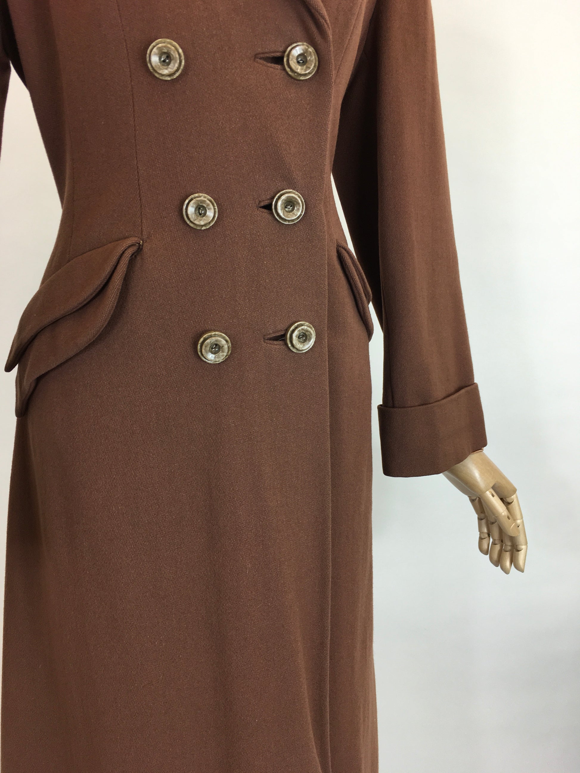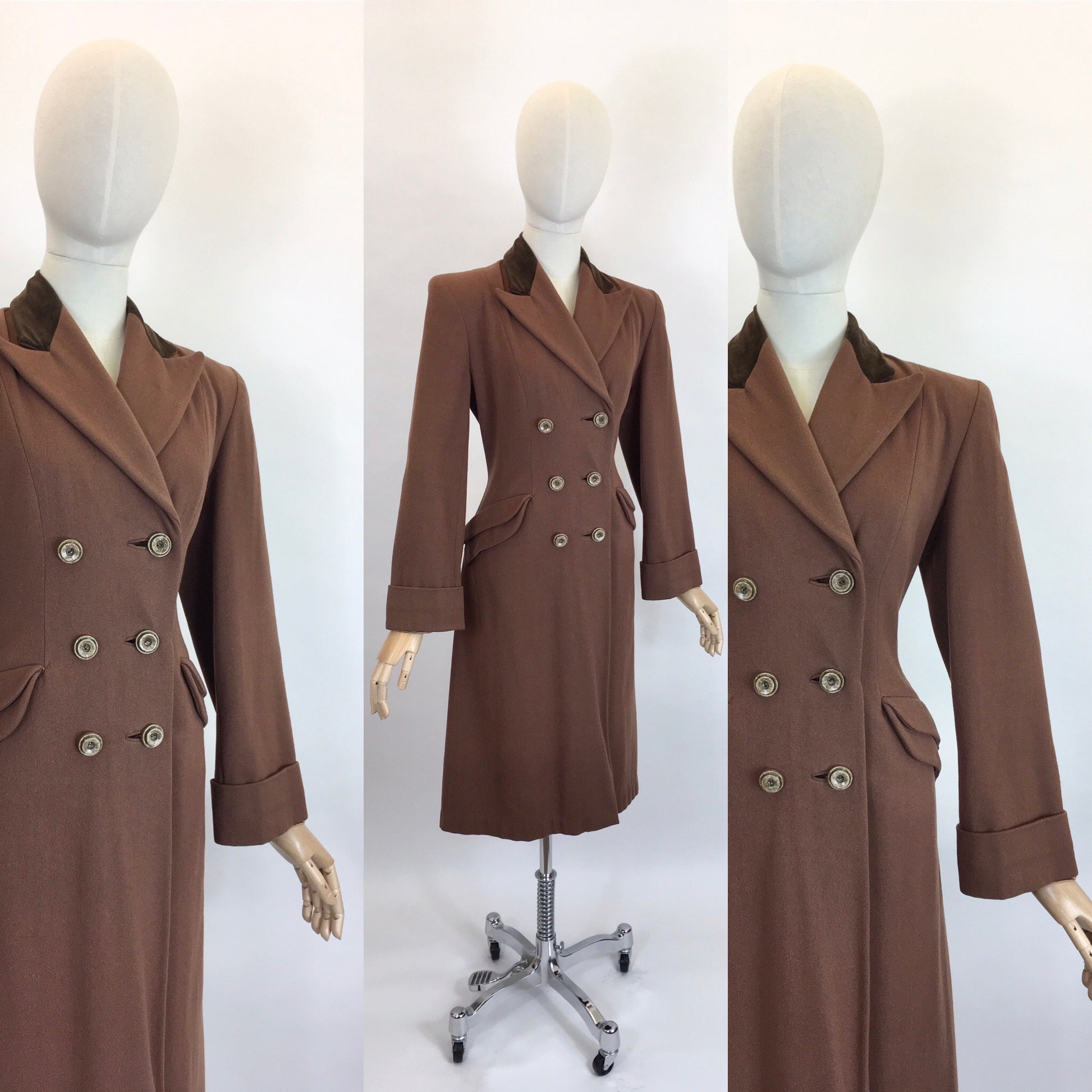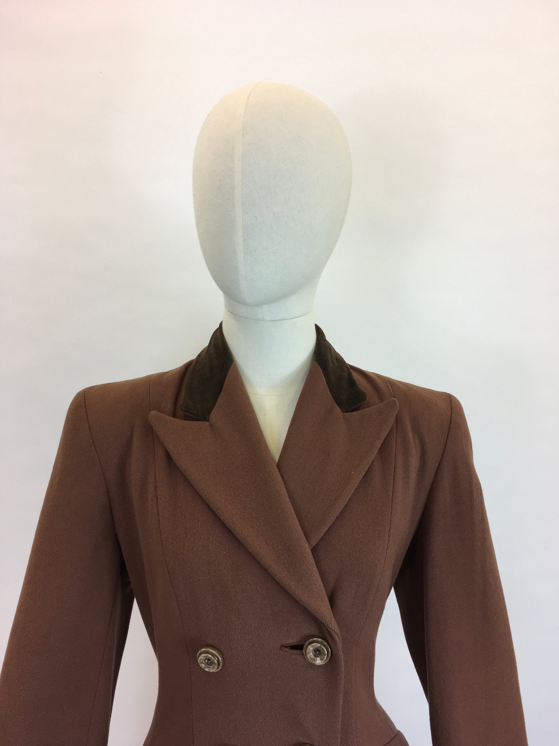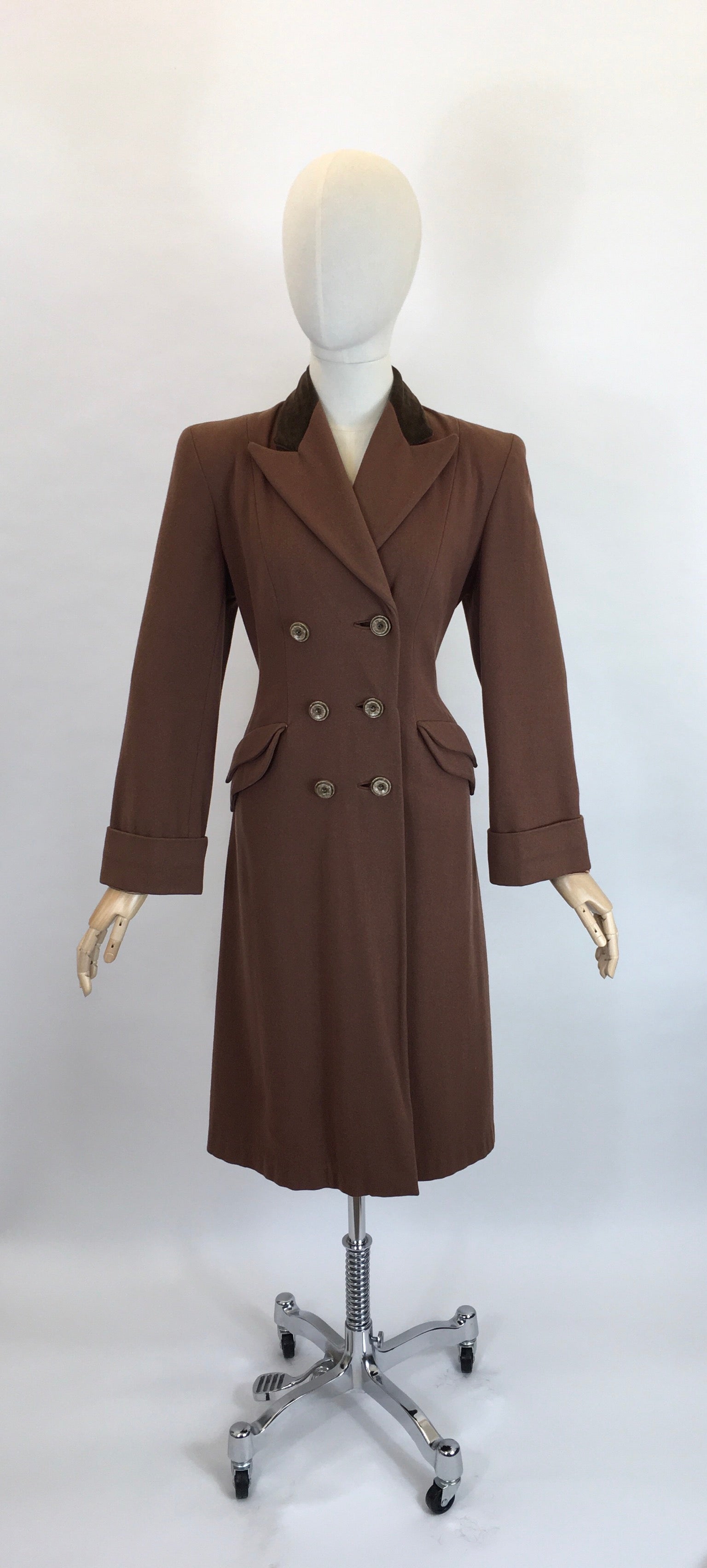 Vintage 1940’s SENSATIONAL brown coat. Made from a beautiful soft brown wool with a rich brown velvet trim to the collar. This piece is a stunning example of a classic utilitarian 40’s silhouette featuring strong shoulder line, collar, double breasted front with buttons, shaped pockets, full length sleeve with turn back cuff. A stunning example of its time and very versatile to layer with dresses and suits or even separates.