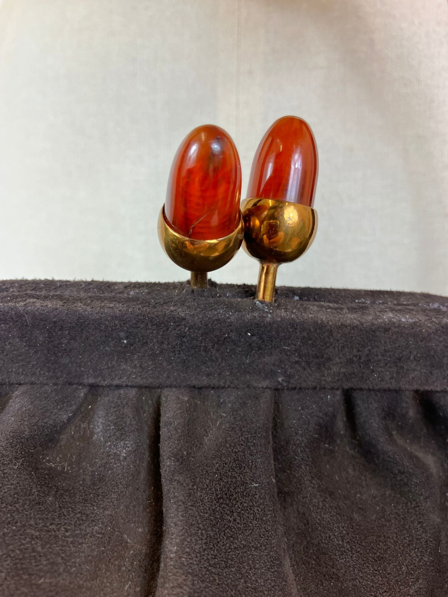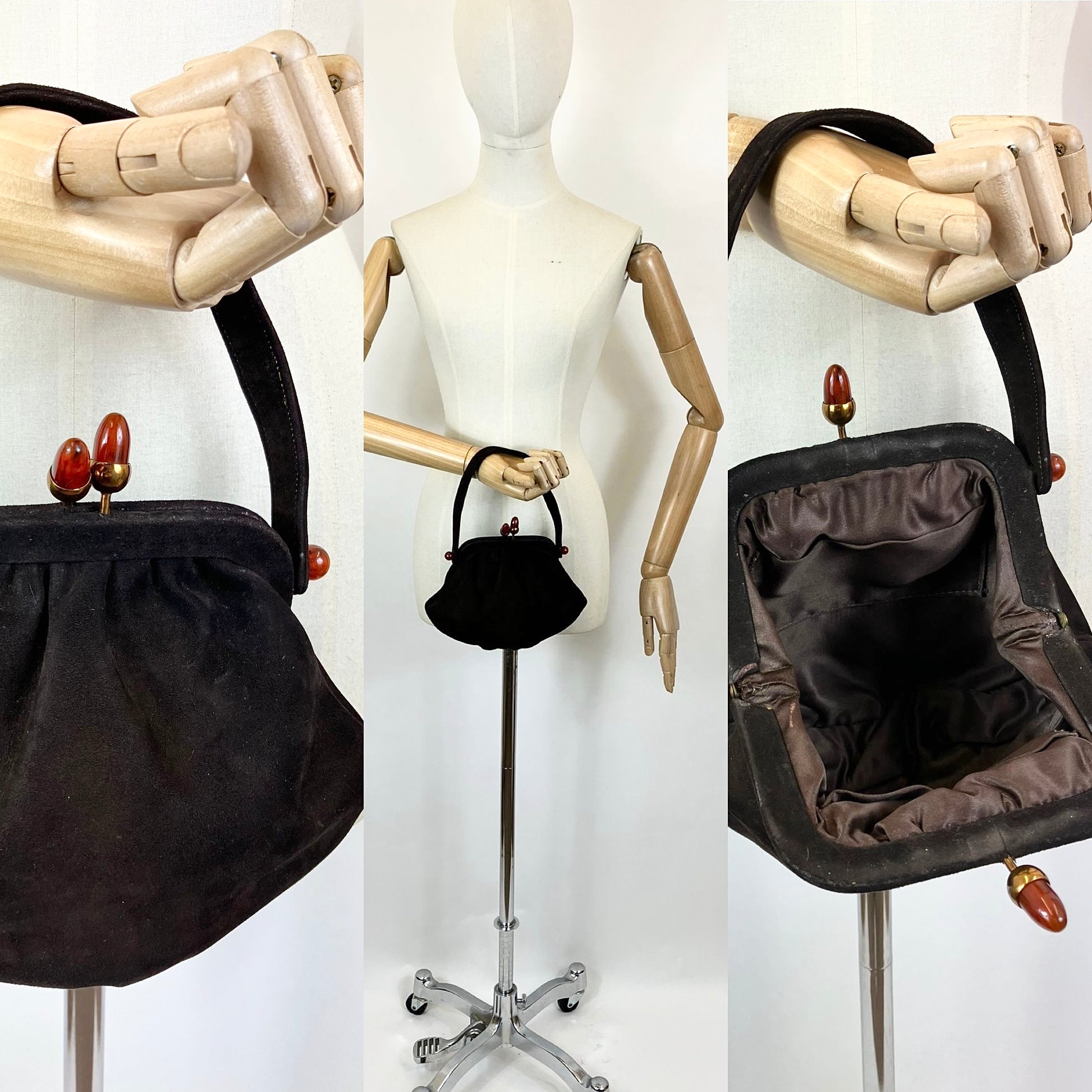 Vintage 1940’s single handle suede handbag in rich dark brown. Such an amazing lovely shape to this handbag, which is set on a gold tone frame, covered in this rich dark brown velvet oozing elegance and style. The very good ‘click’ acorn clasp has amber coloured acorns complimented by the gold tone. Fully lined with large space and a small side pocket on either side. Large enough for mobile phone and glasses plus more.