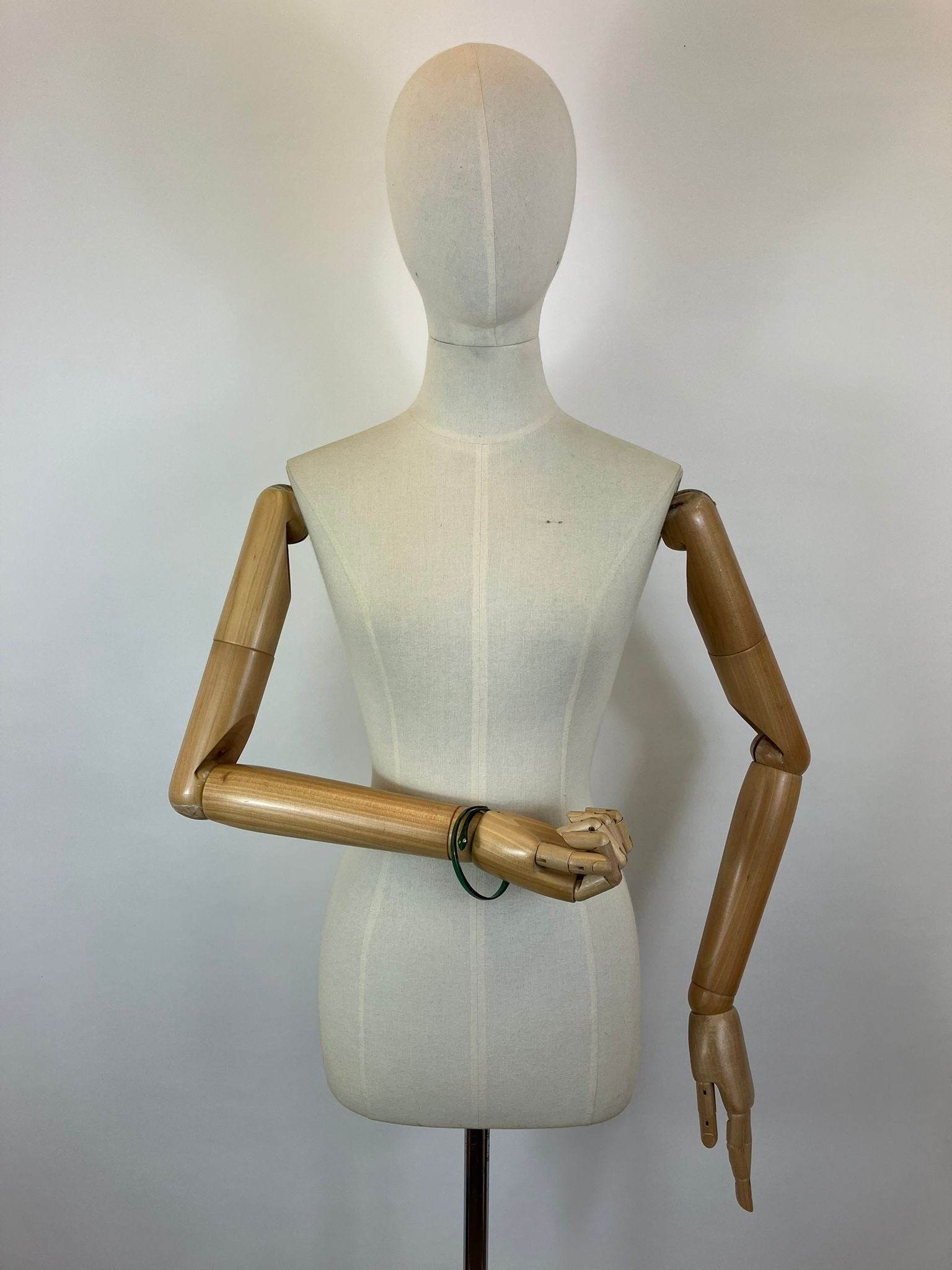 Vintage 1940’s snake bracelet in a gorgeous green. Made of an early celluloid / plastic. A lovely translucent deep shade of green. Paste jewel eyes and a few along the body of snake. Flexibility on size. A lovely accessory to finish and complete an ensemble.