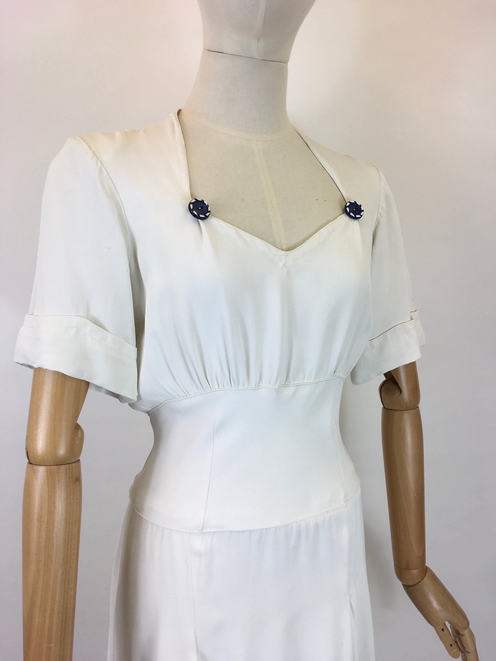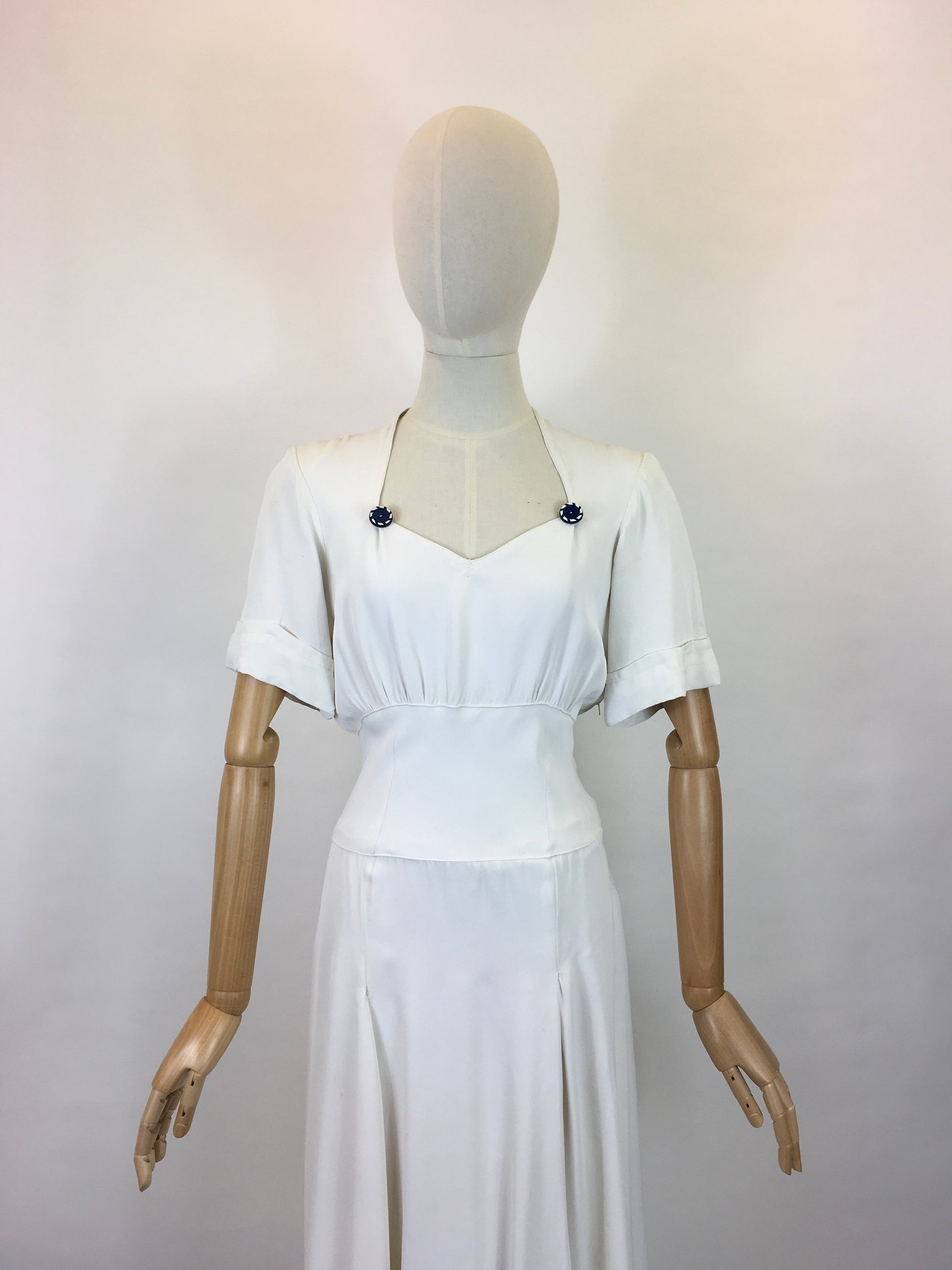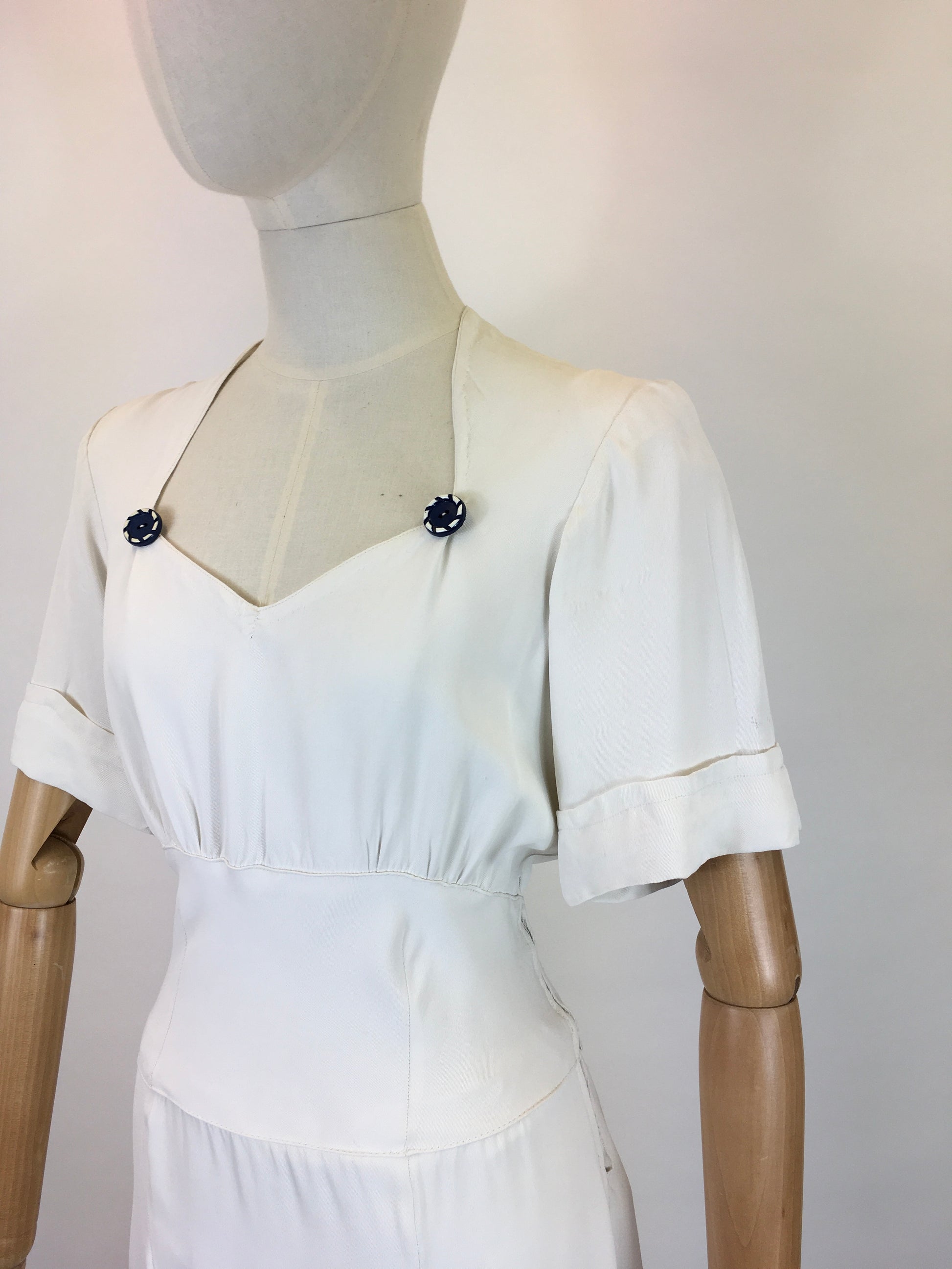 Vintage STUNNING 1940’s classic white rayon dress with navy button detailing. Oozing that classic 1940’s silhouette this dress has a sweetheart neckline adorned with navy buttons, short puff sleeve with cuffs and Internal shoulder pads for extra shaping, panelled waist and pleating Detailing to the skirt. The dress fastens with a  metal side zip. Not without her flaws due to its colour please check the condition report below but this beauty has lots of life and wear left.