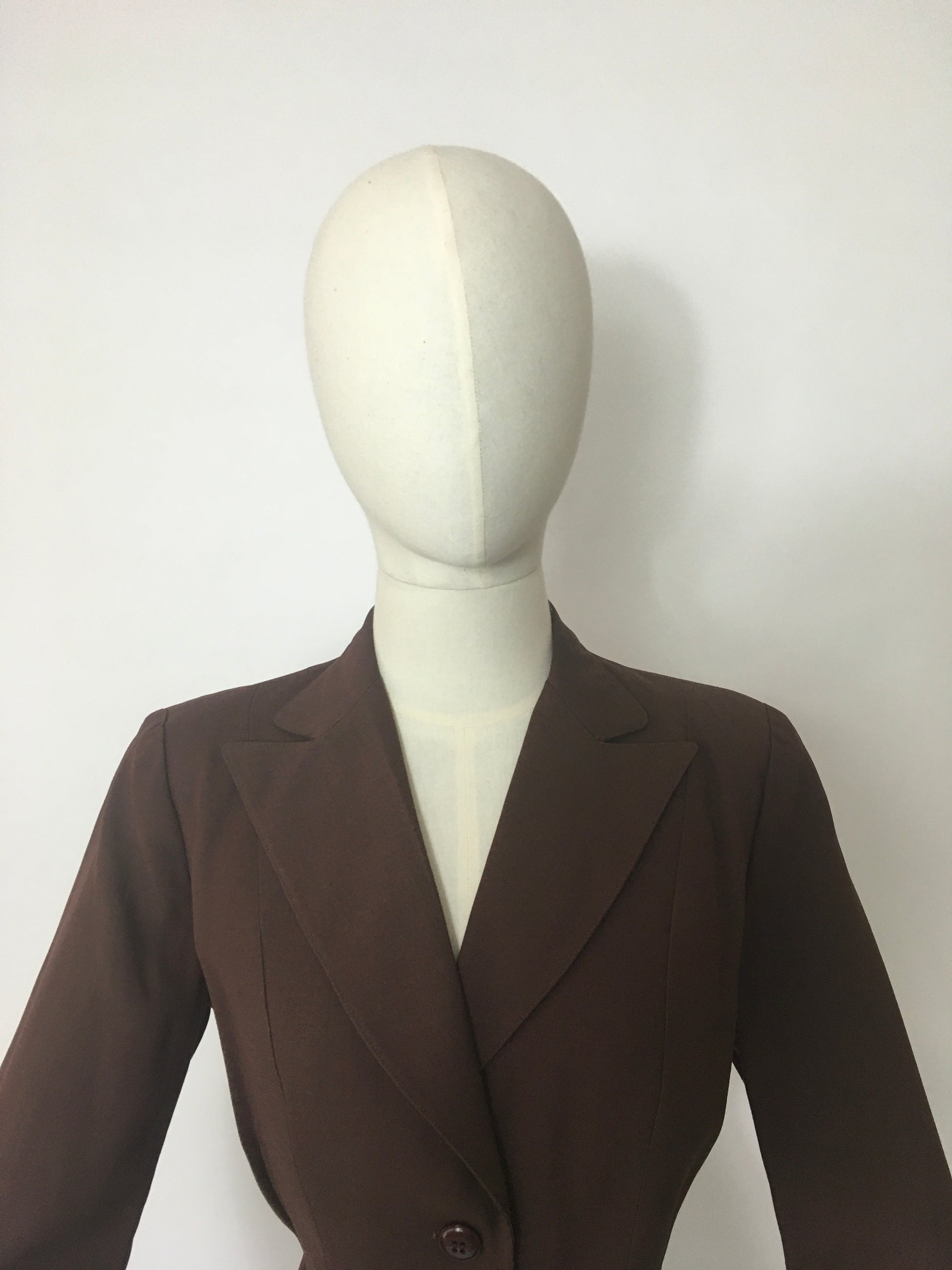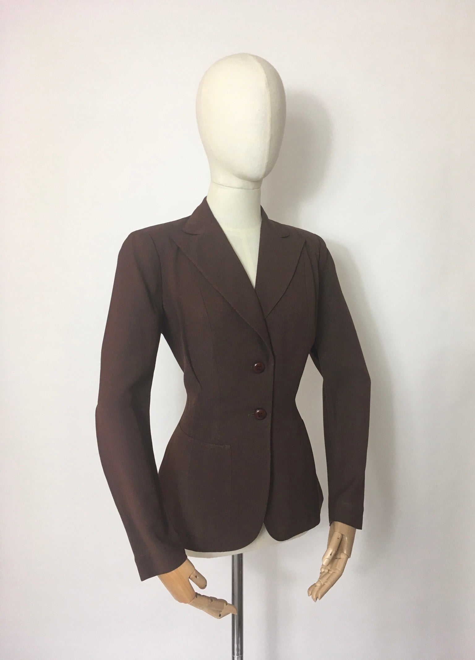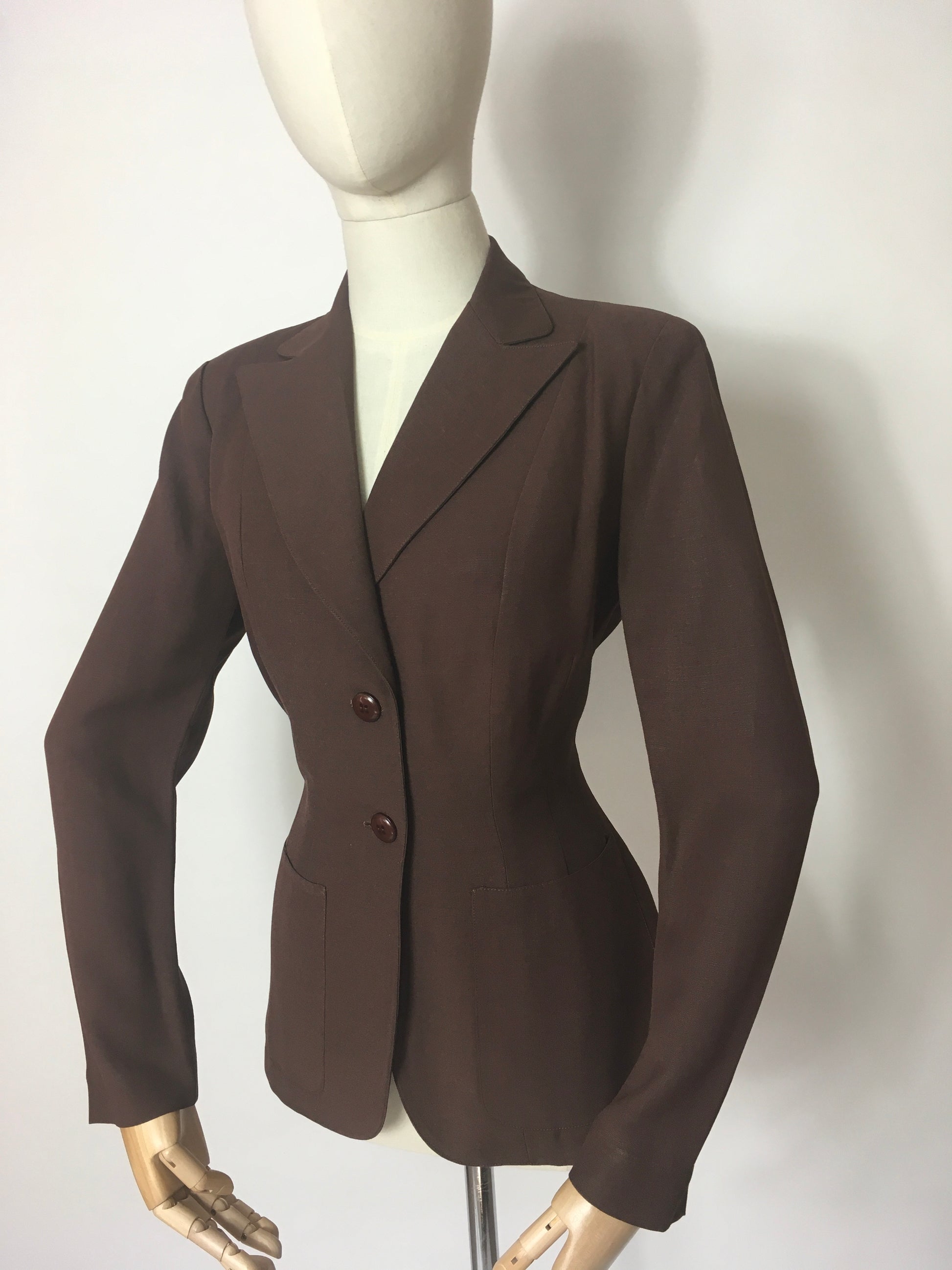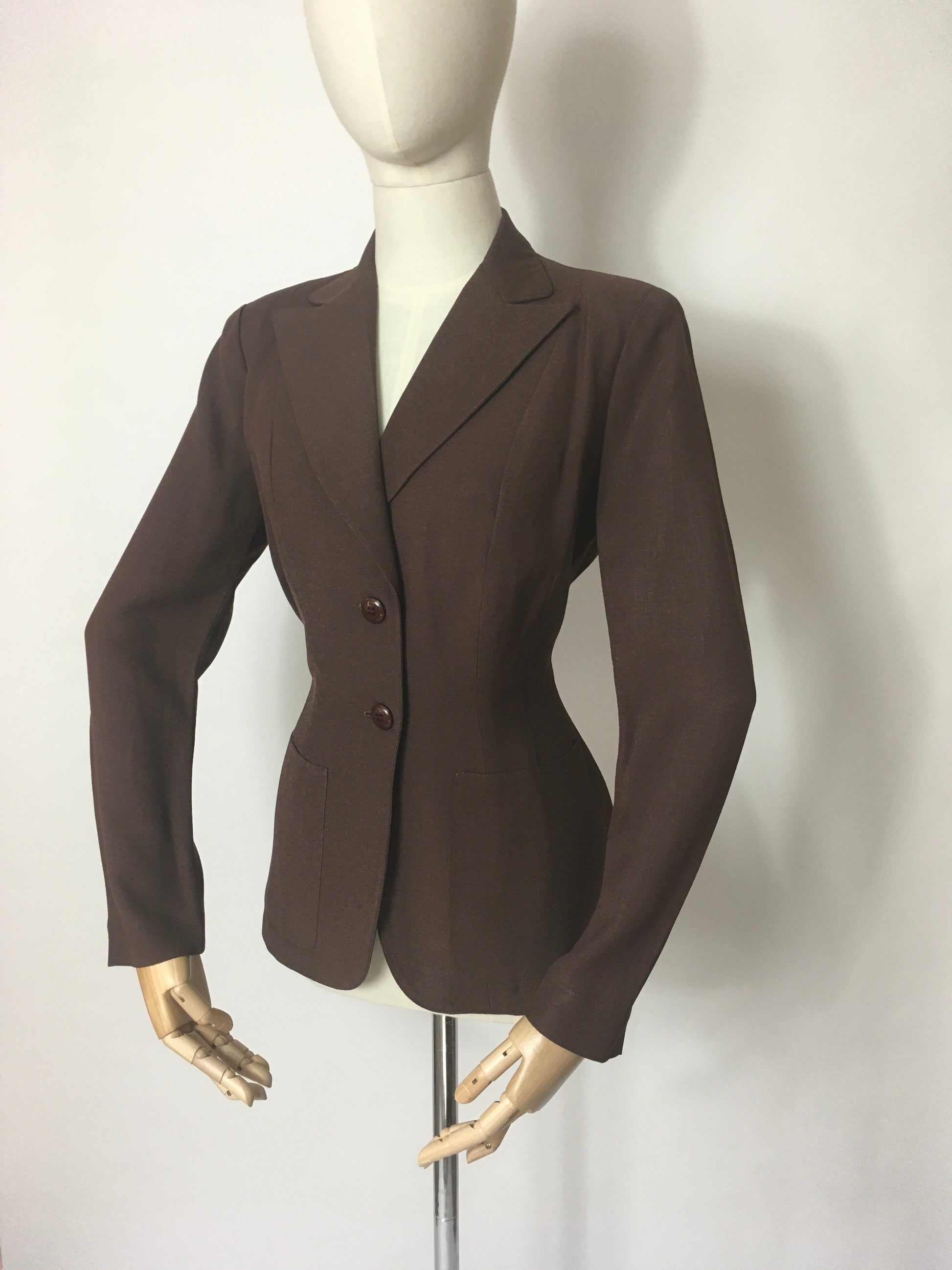 Vintage 1940’s brown linen Summer jacket made by the fabulous Company ‘ Sacony Palm Beach’. Featuring a simple silhouette this jacket has a collar, nipped waist, pockets and a long sleeve. Simple yet a great staple piece for any vintage lovers wardrobe great worn over dresses or blouses and slacks