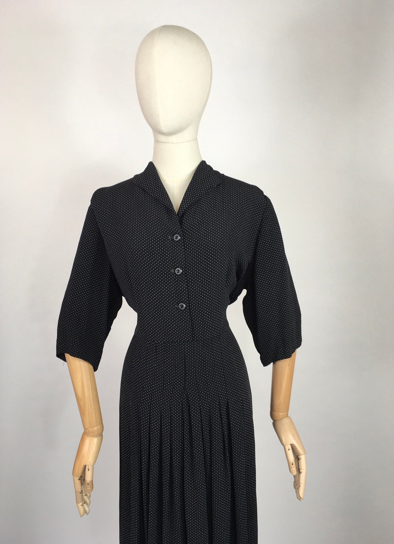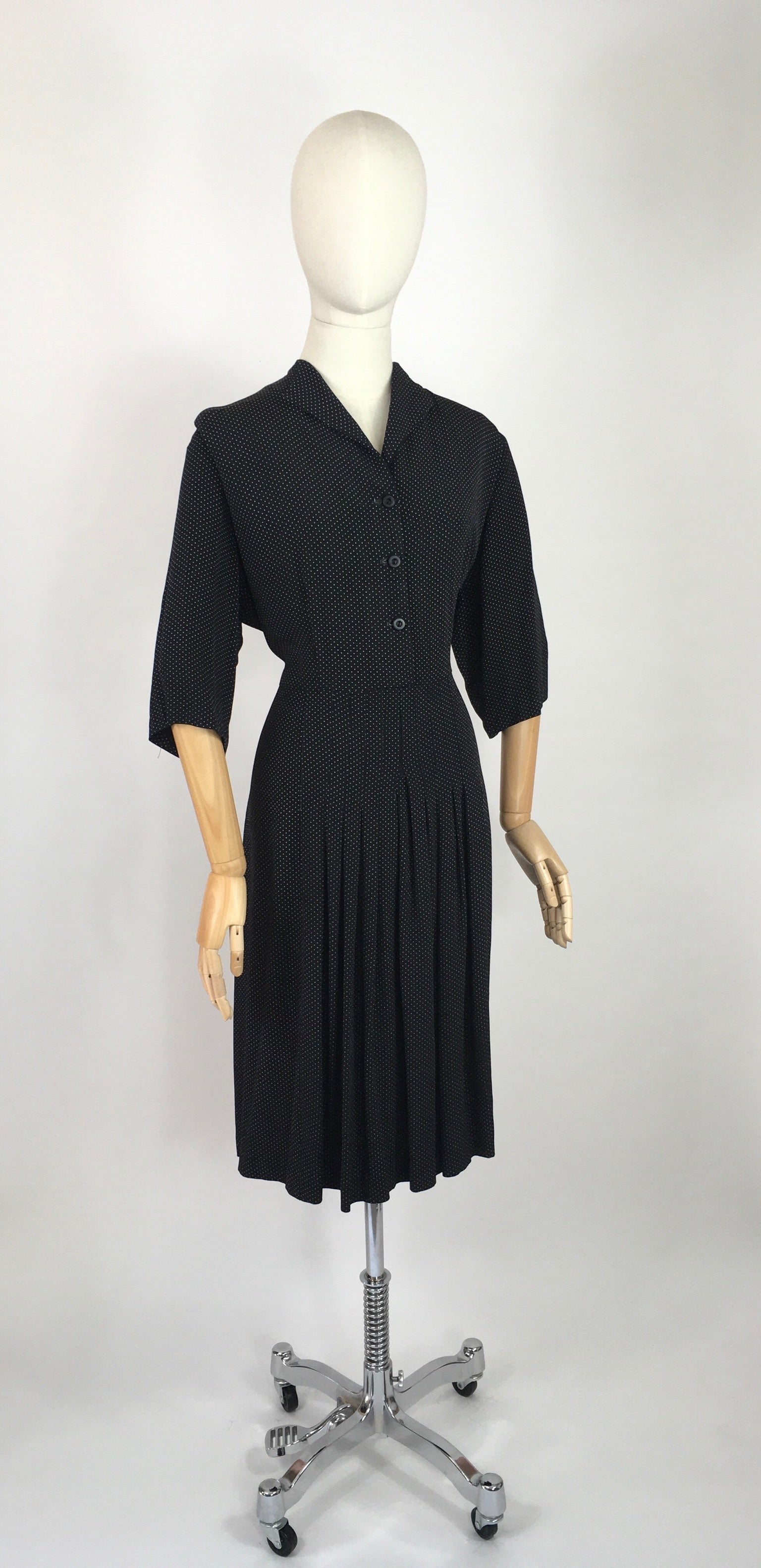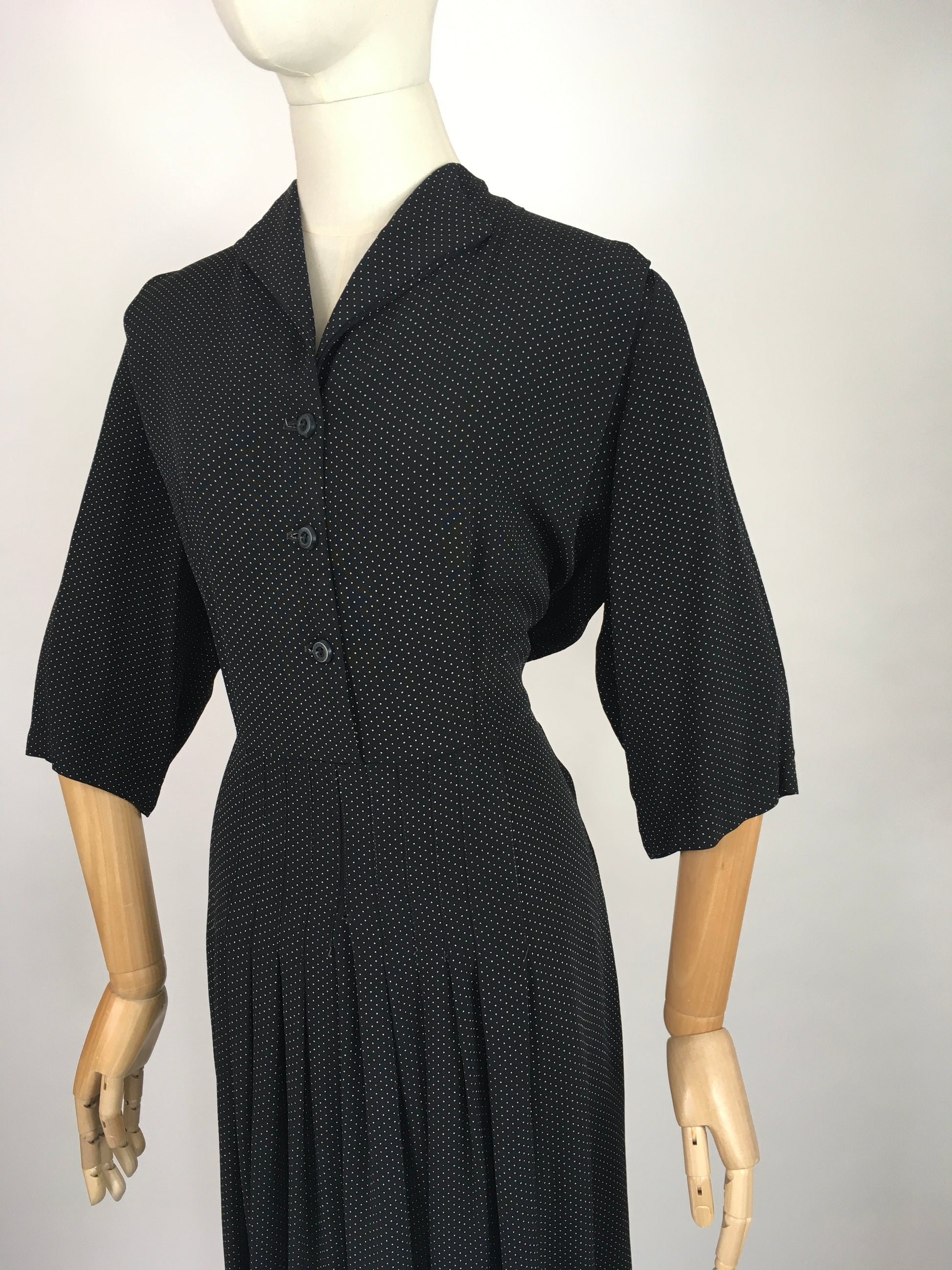 Vintage 1940’s VOLUP Black and White polka dot day dress made in a lovely lightweight cotton. Featuring a classic 40’s silhouette this dress has a lovely shaped collar with button down front, 3/4 length sleeve, cinched in waist and pleated skirt detailing. Missing original belt but would look lovely worn with a contrast to add some colour.