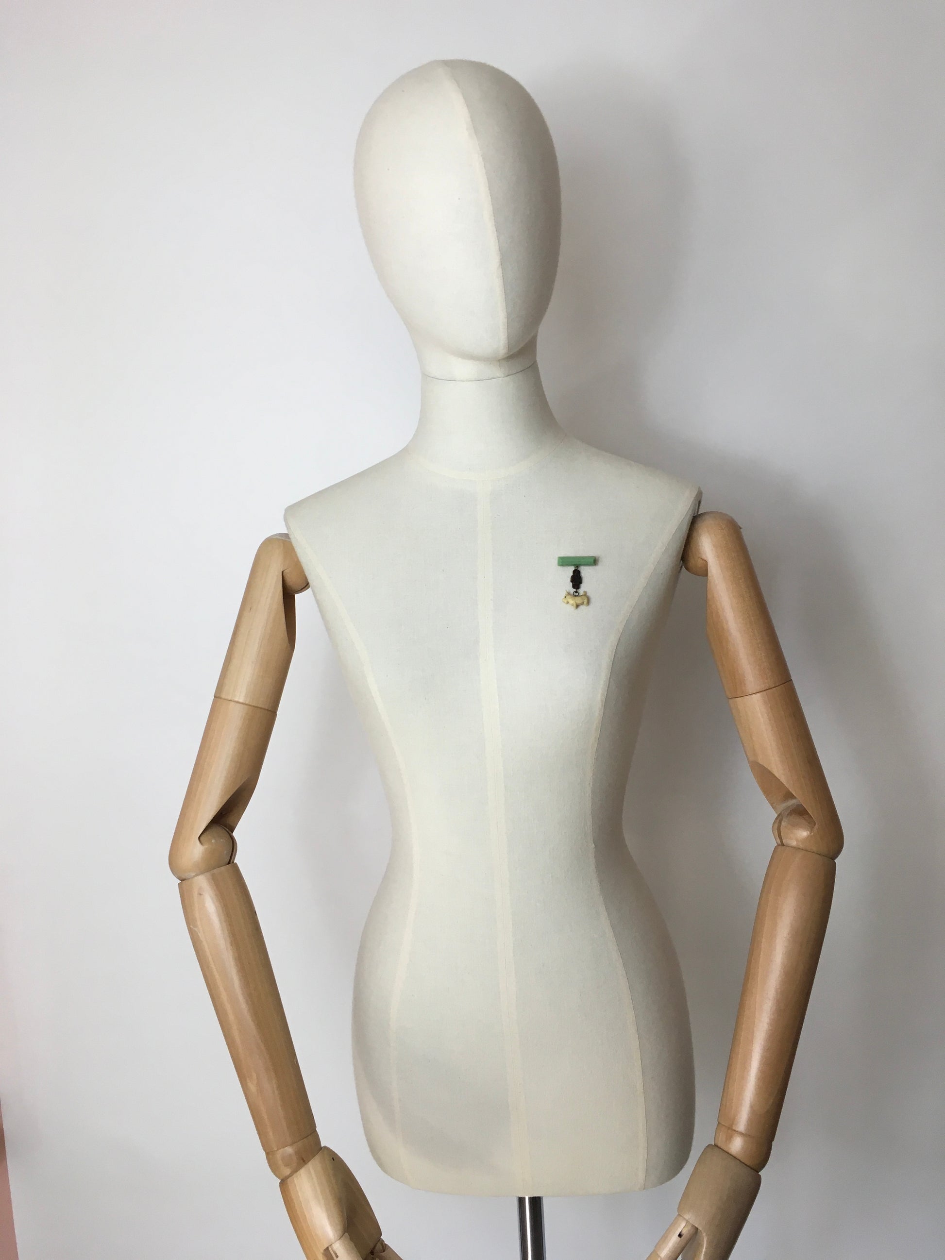 Vintage 1940’s war time dog brooch in a lovely colour combo of mint green, ivory and black. The brooch is on a lovely mint green bar with a black collar and a lovely white dog at the bottom. Measuring 1.5’ depth this piece is a lovely statement on a jacket, cardigan or dress.