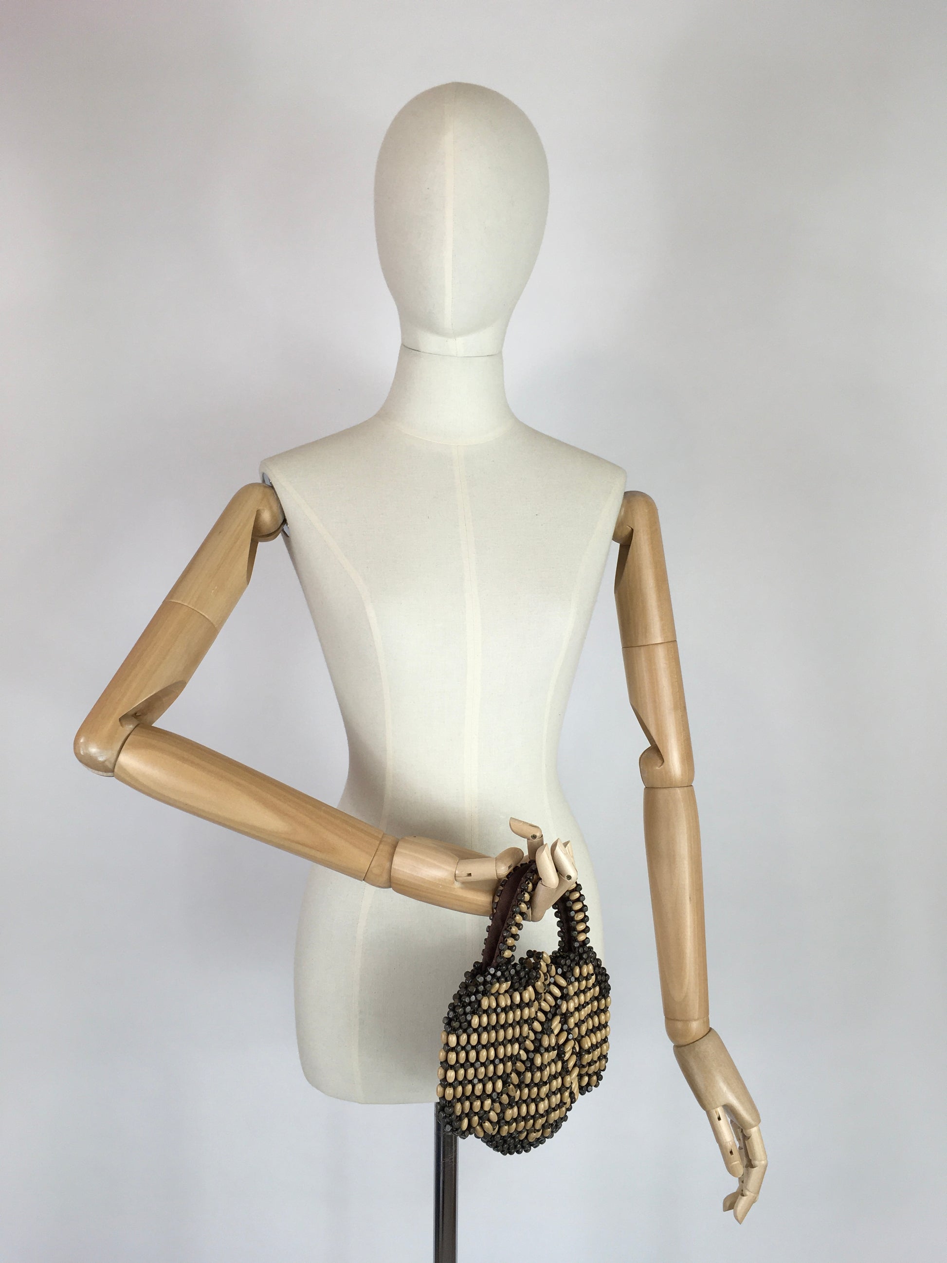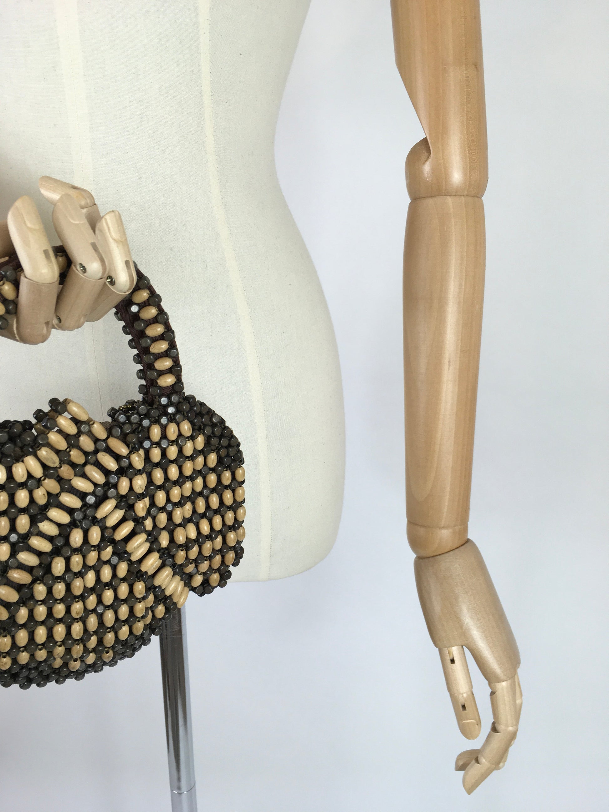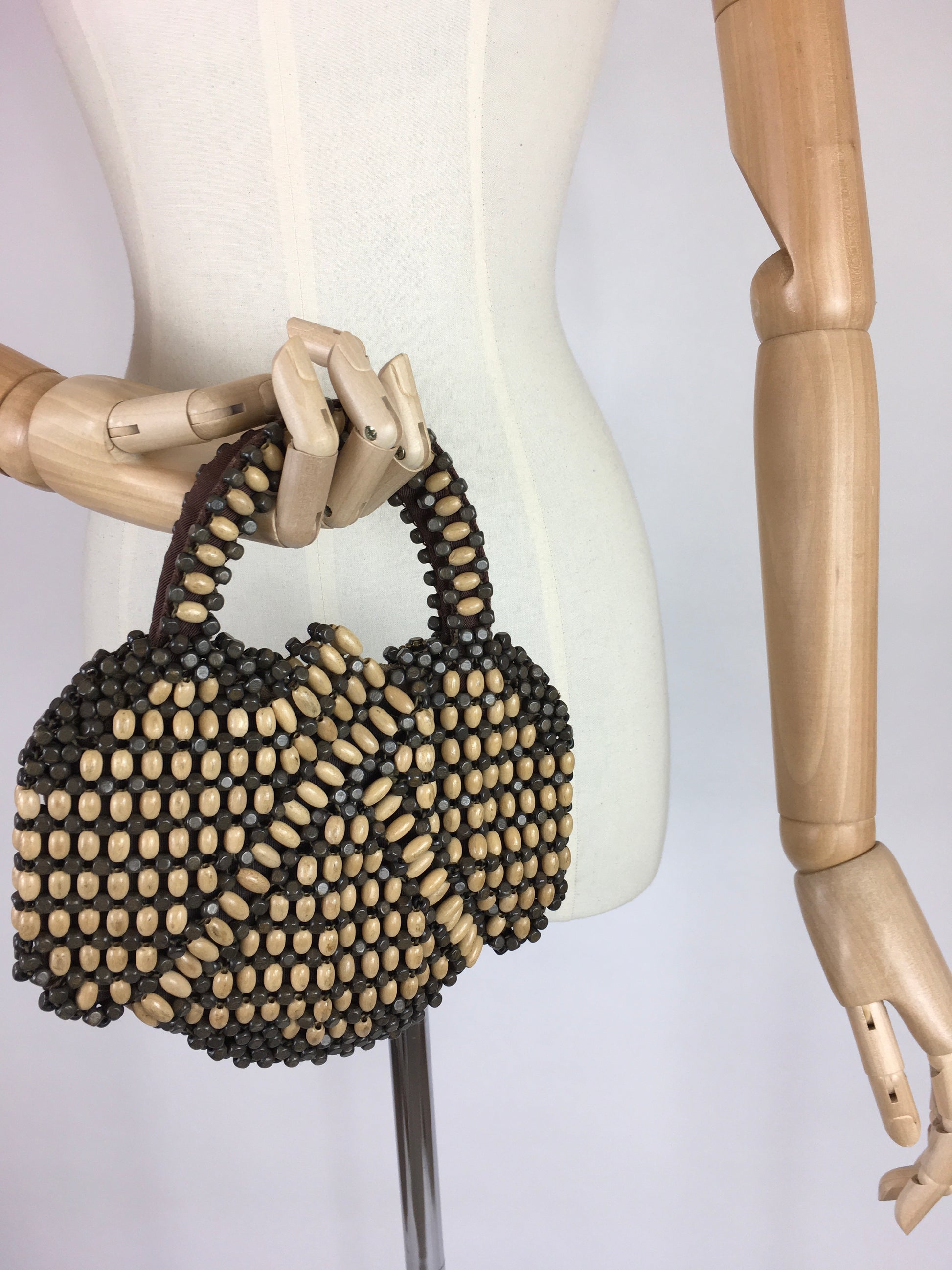 Vintage 1940’s wooden beaded bag in a fabulous shape. Featuring 2 tone beadwork which creates a very useful colour scheme to go with an array of outfits. Has a matching beaded handle, zip fastening and inside pocket.