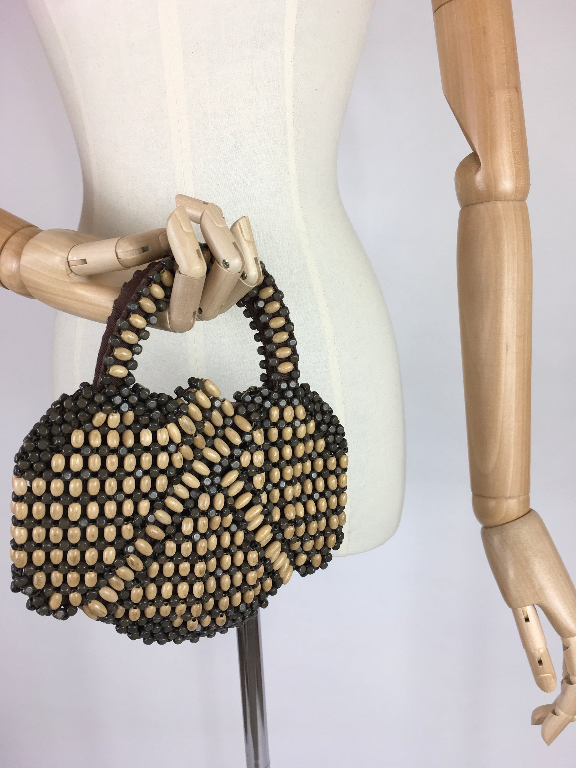 Original 1940’s Wooden Beaded Bag - In 2 Tone Brown Wooden Beads