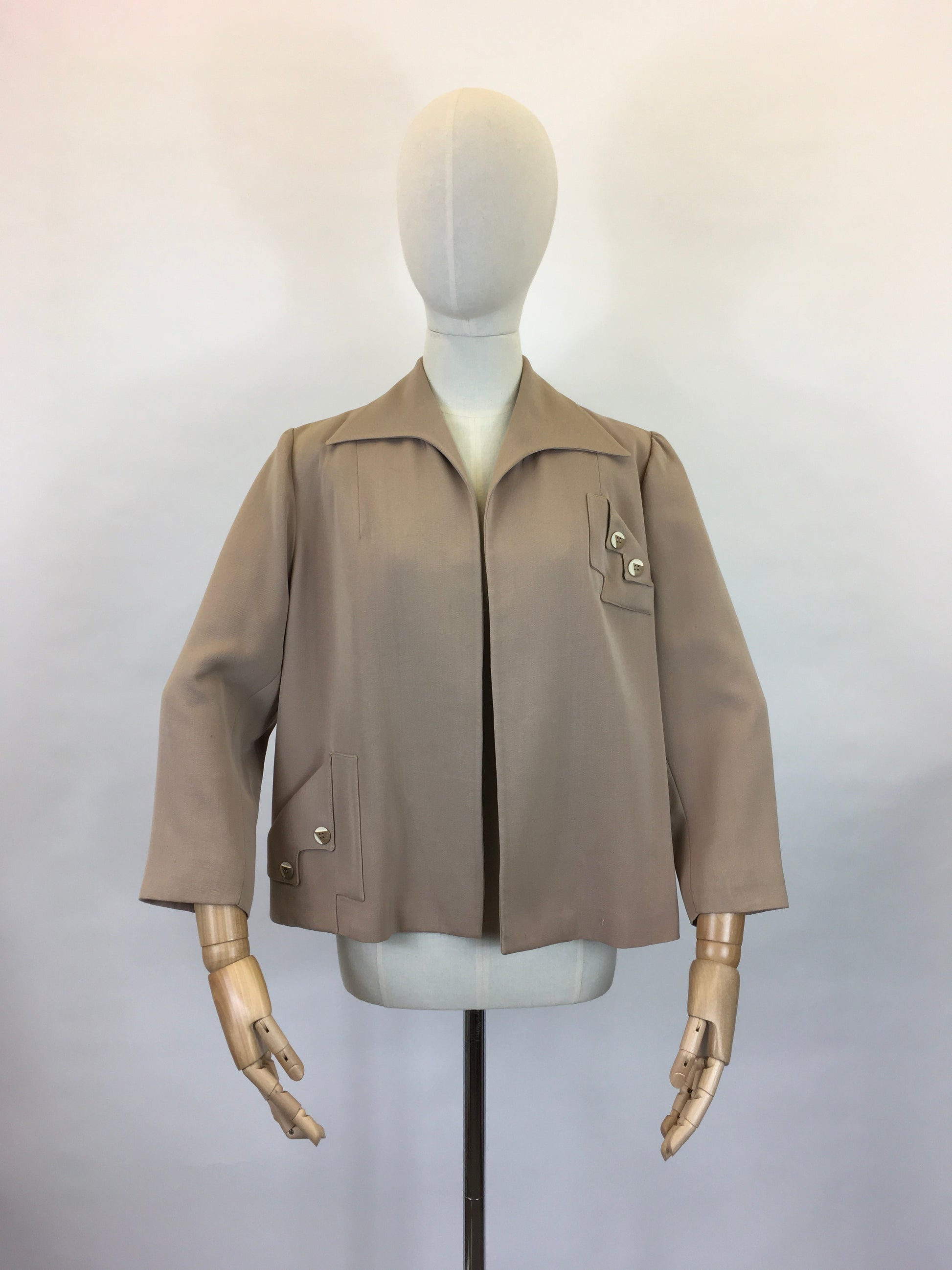 Vintage 1940s lovely warm taupe edge to edge swing Jacket. Having a classic 40’s silhouette this piece has strong shoulders, full length sleeve and pocket detailing finished with fabulous buttons. A lovely staple piece in a versatile colour pallet to go with an array of ensembles for layering. Best suited to a modern day sizing UK 12 - 14.
