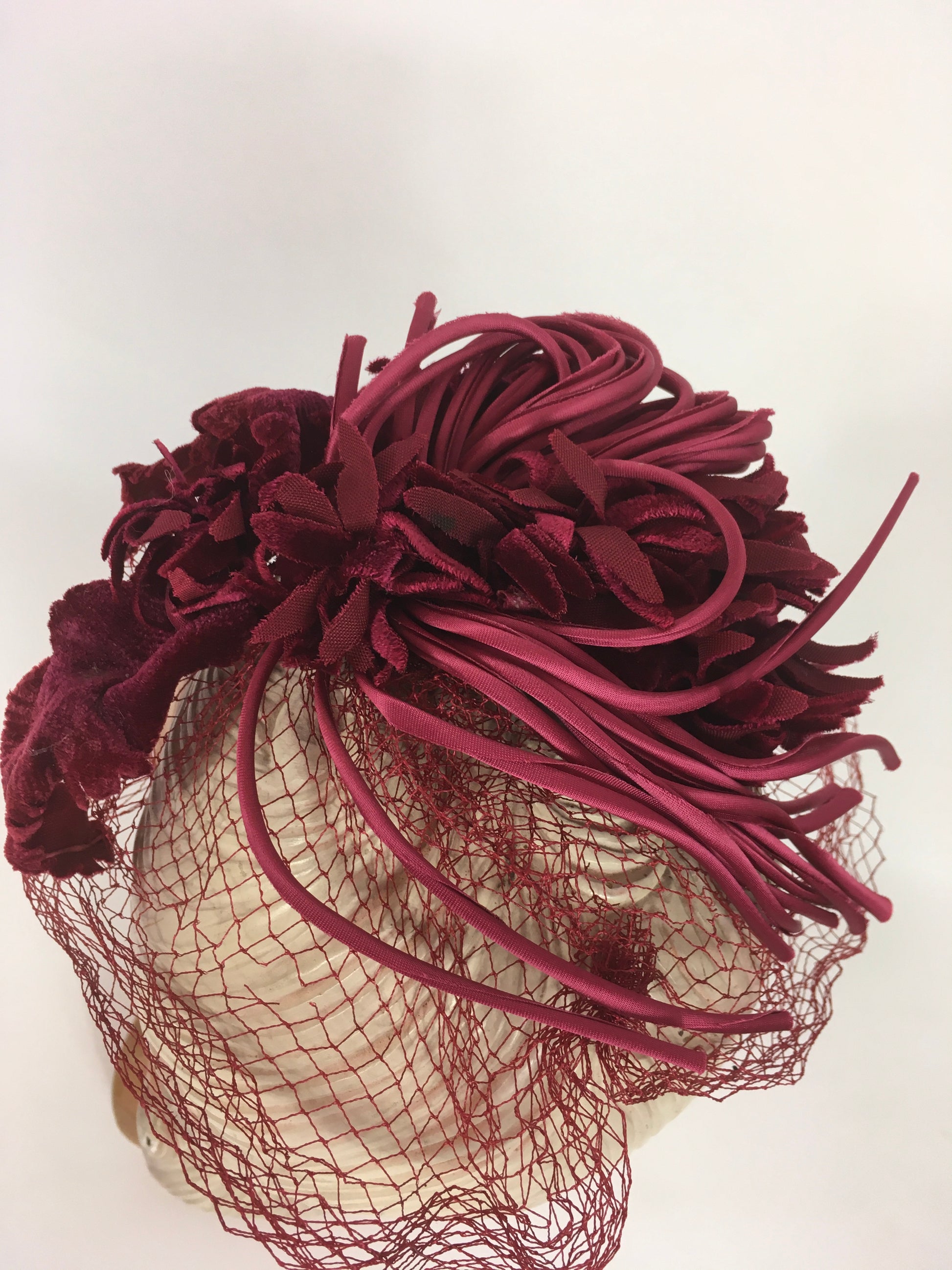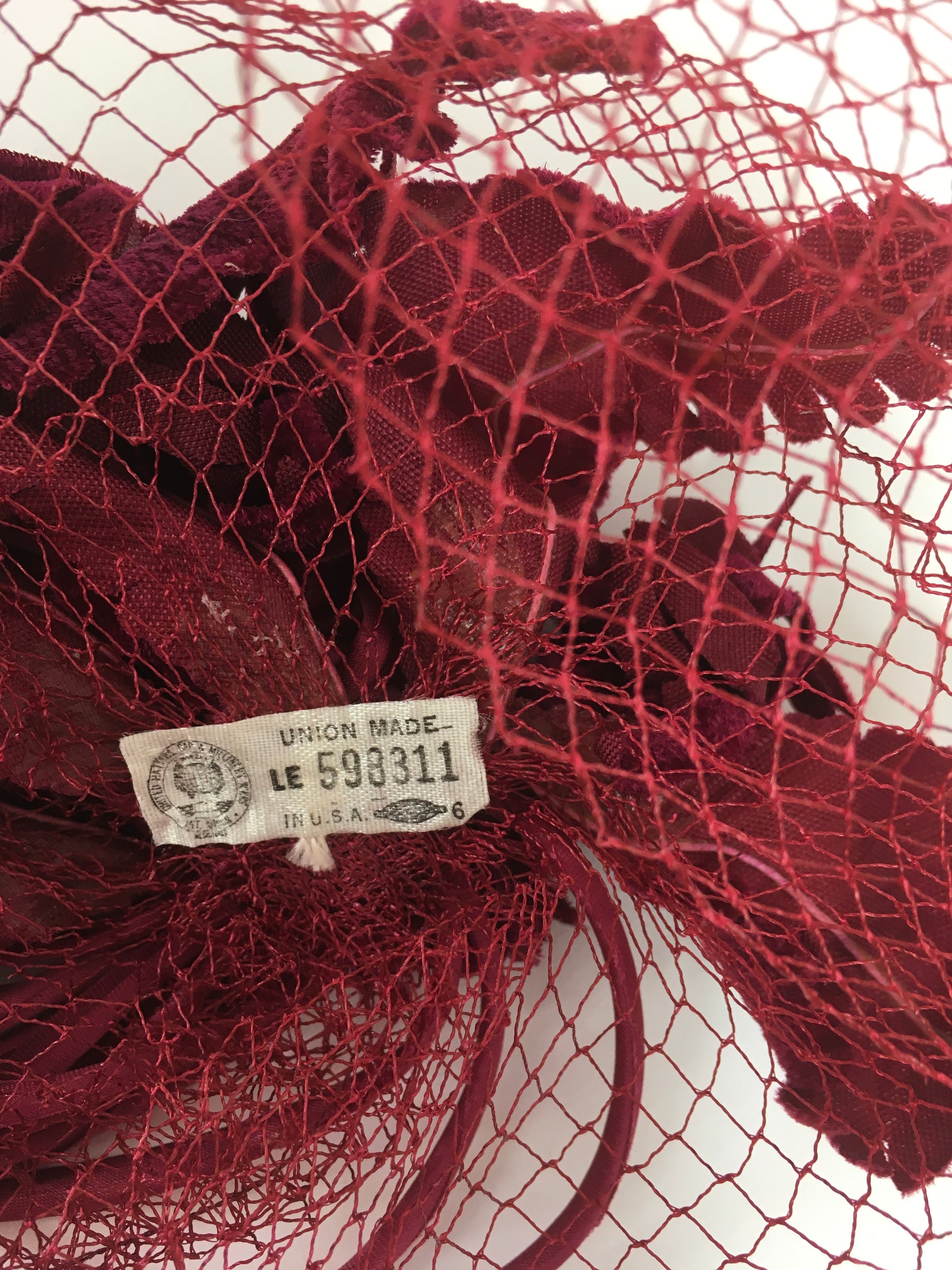 Vintage 1940s American Fabulous deep wine headpiece with beautiful velvet leaves, silk shaped binding which creates fabulous details and net. Has its original American workers label. A lovely piece to add to any collection great for a statement piece for a evening dress or special occasion.