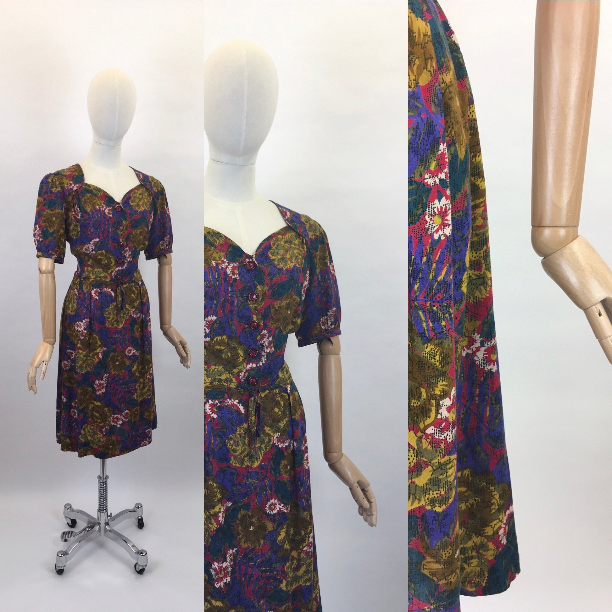 Vintage 1940s beautiful dress made from a floral soft brushed cotton. Featuring a lovely scalloped front detailing, shoulder pads, button front to the waist, belt, pleats to the skirt and a short sleeve. Fastens with small press studs to the side. The floral is exquisite and incorporates a lovely warm colour pallet of deep reds, mustards, rich purples and stencilled blacks, great for wearing with various accessories.