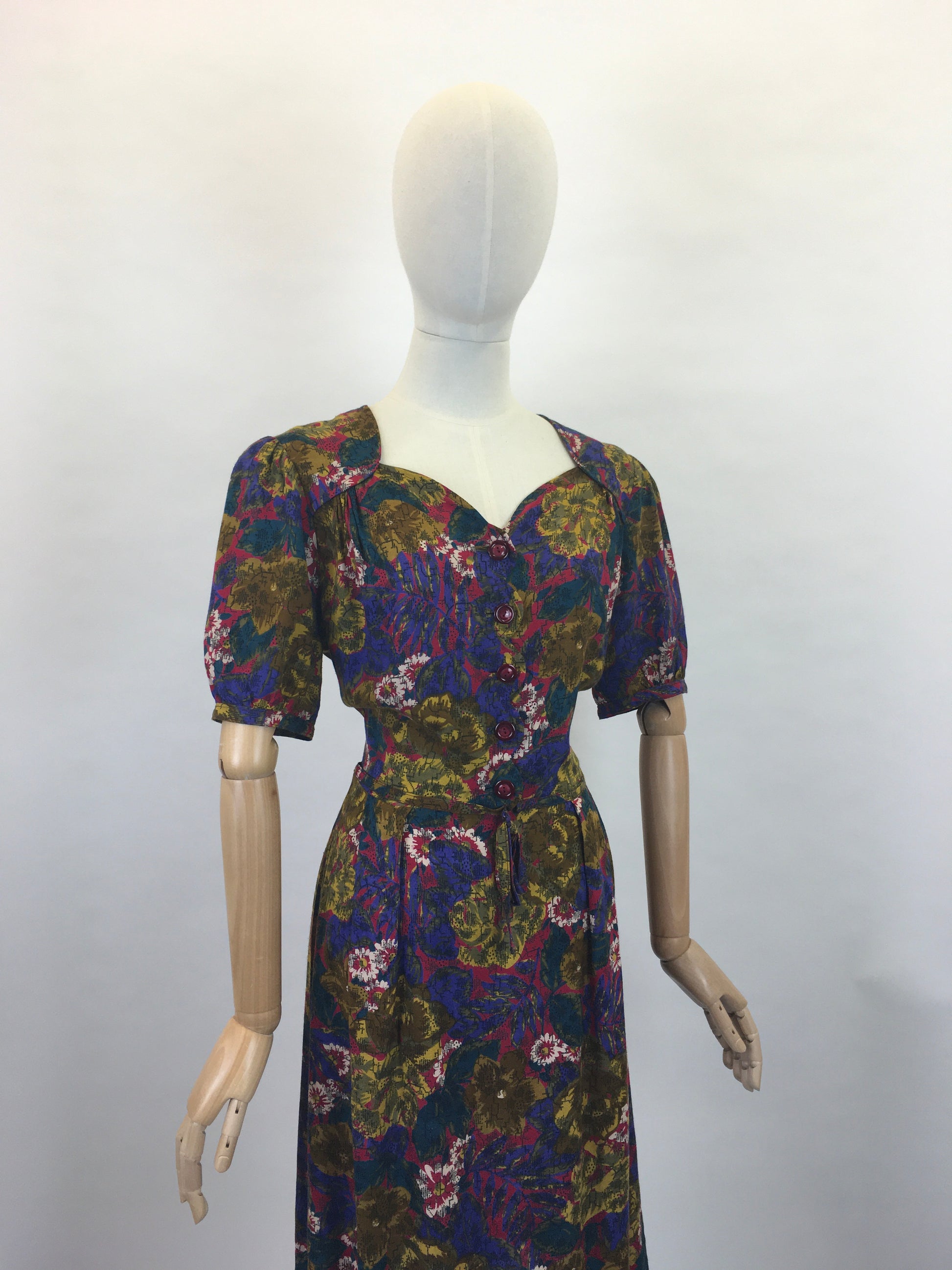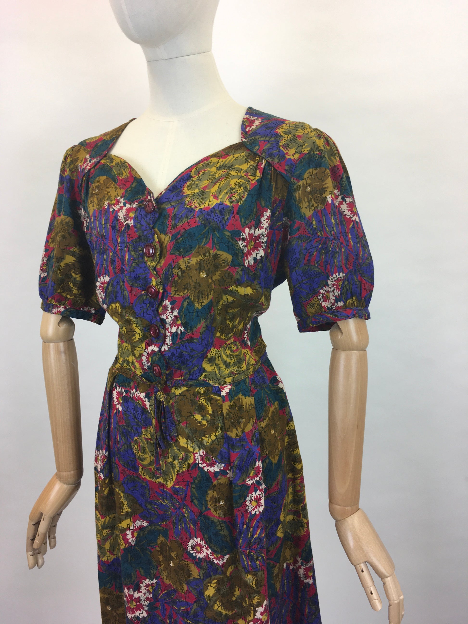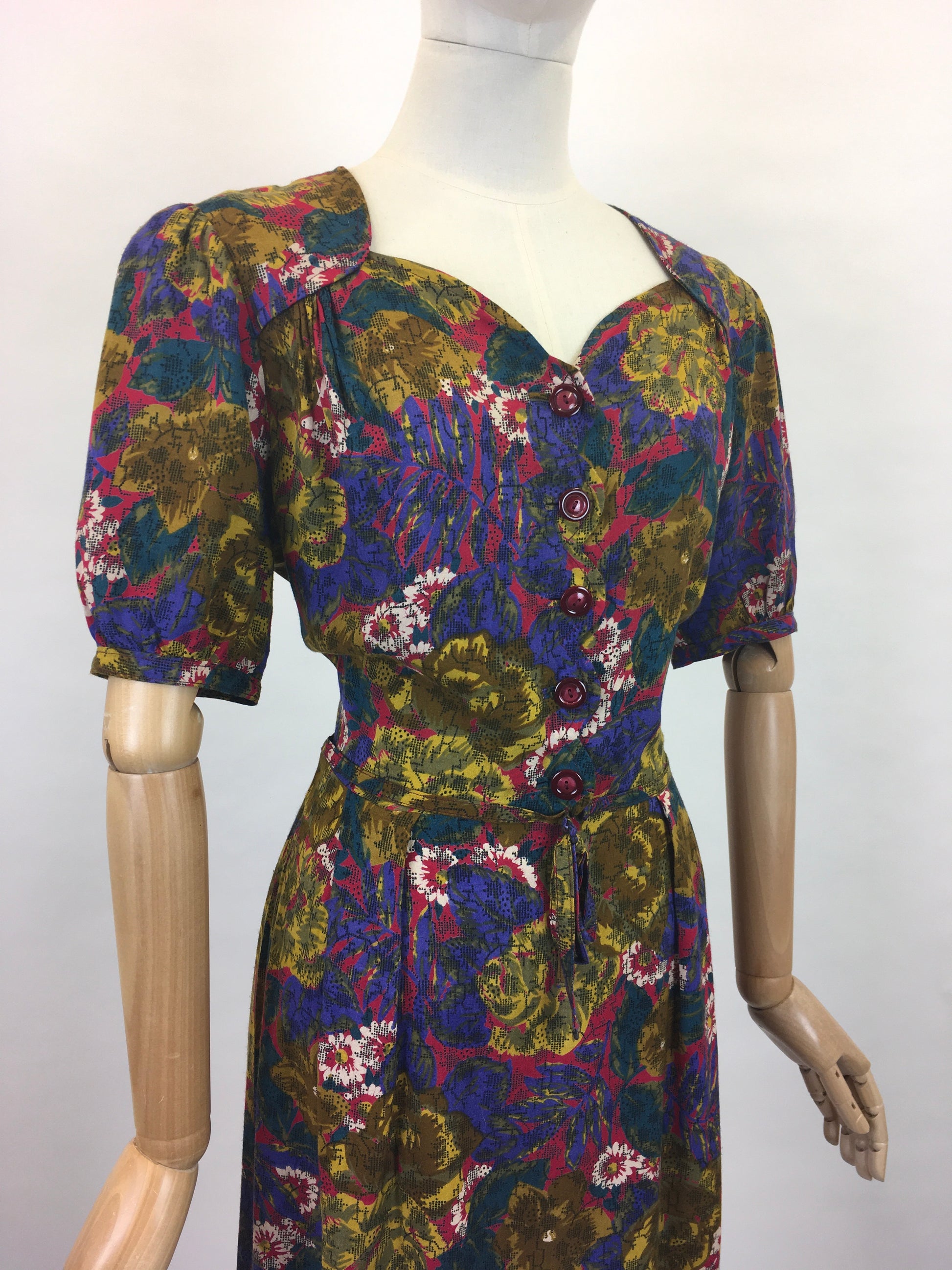 Original 1940s Beautiful Day Dress - In a Lovely Floral in Deep Reds,Mustards, Rich Purples and Stencilled Blacks