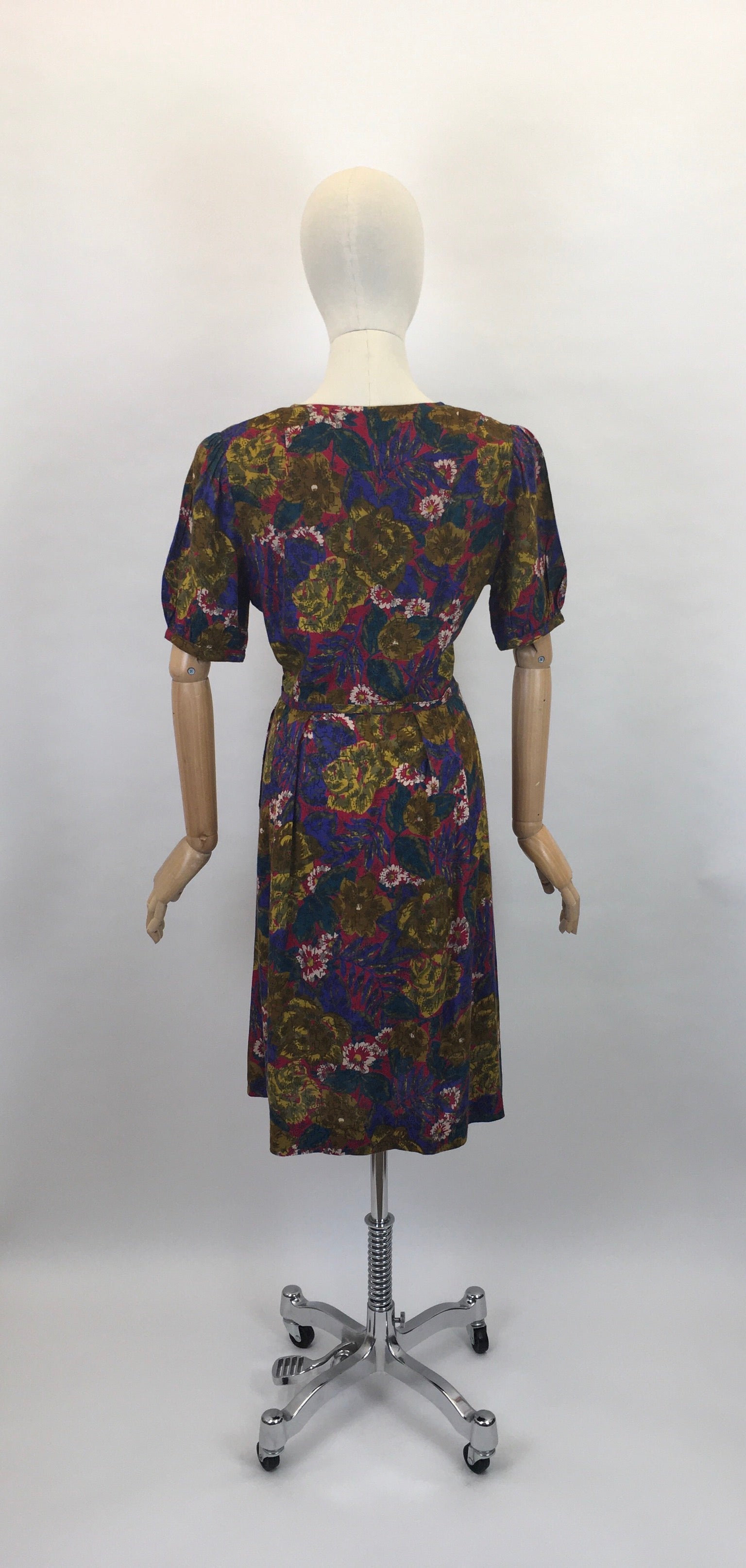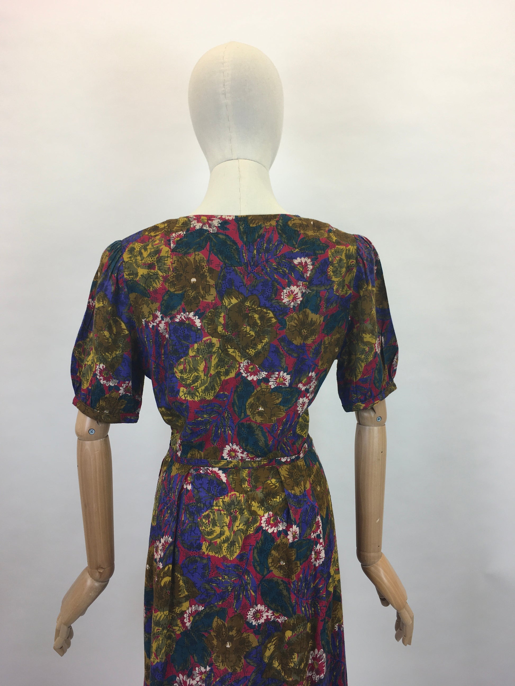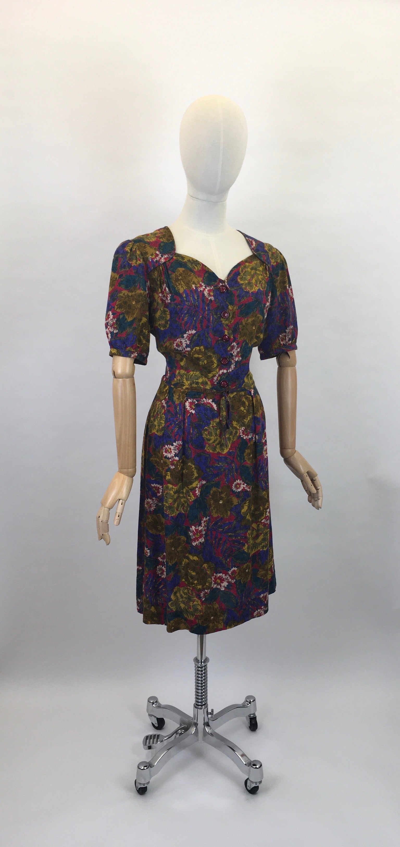 Original 1940s Beautiful Day Dress - In a Lovely Floral in Deep Reds,Mustards, Rich Purples and Stencilled Blacks