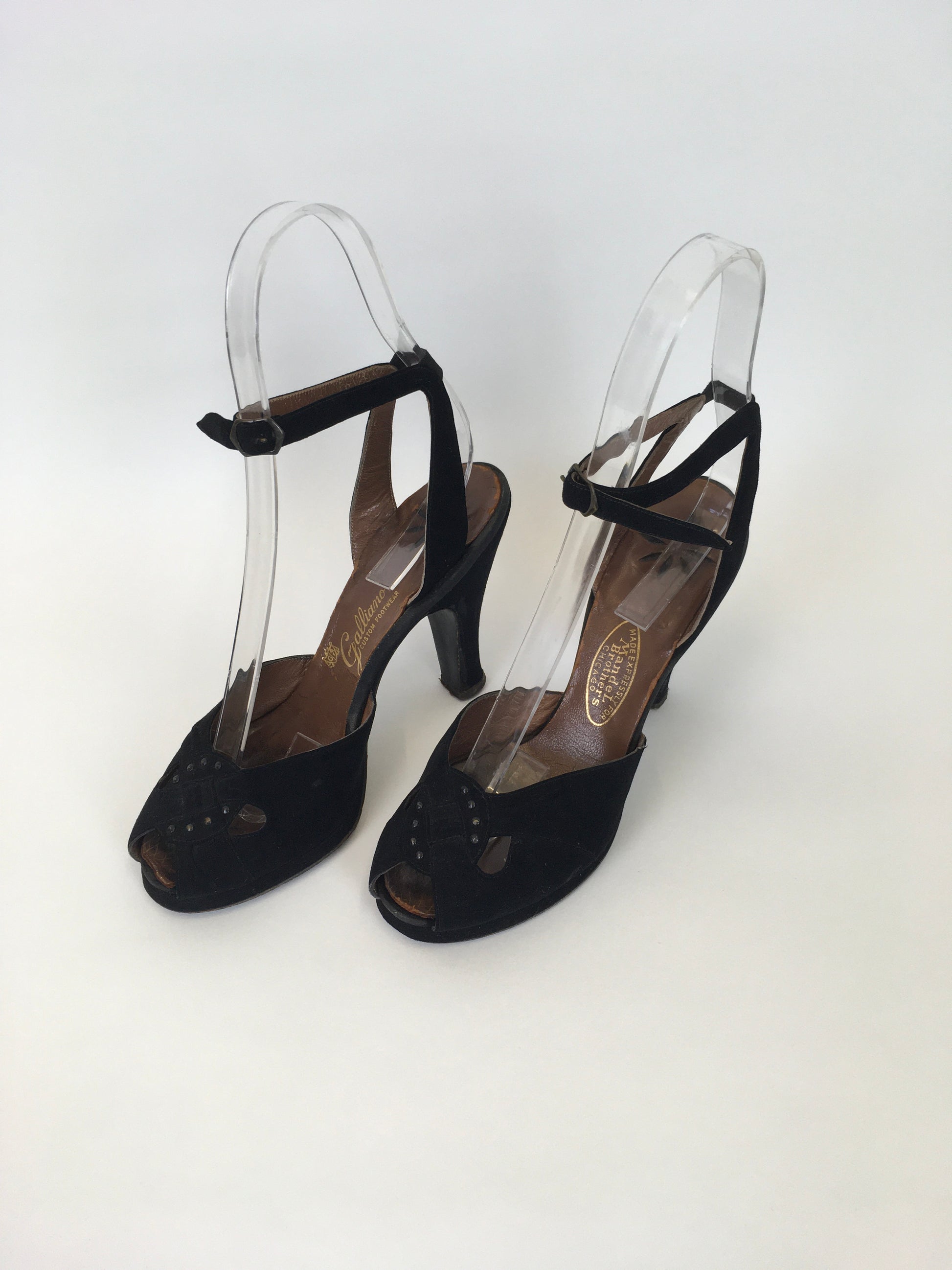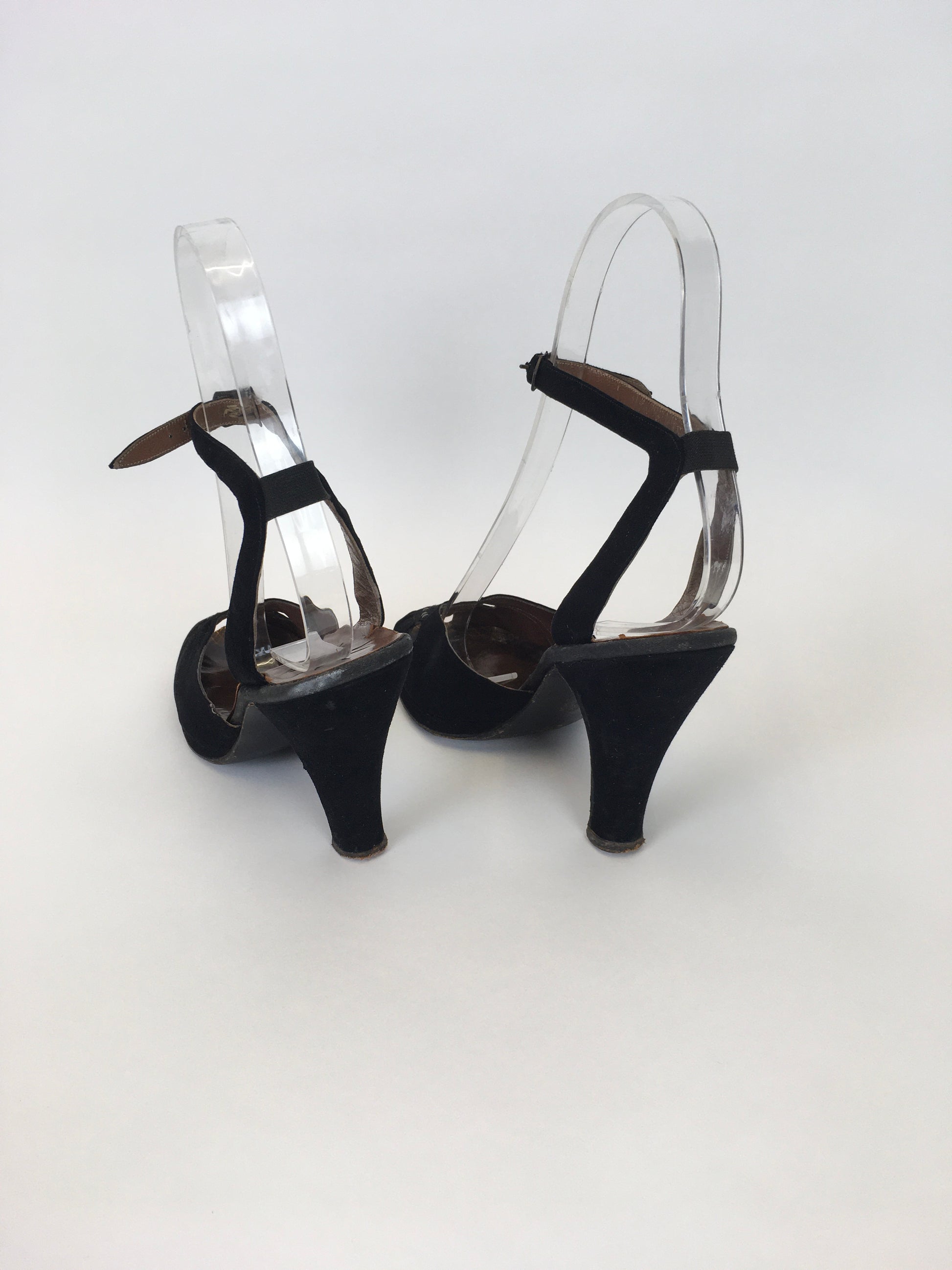 Original 1940s Black Suede Heels - With Peep toe Front Detailing and Buckled Ankle Strap