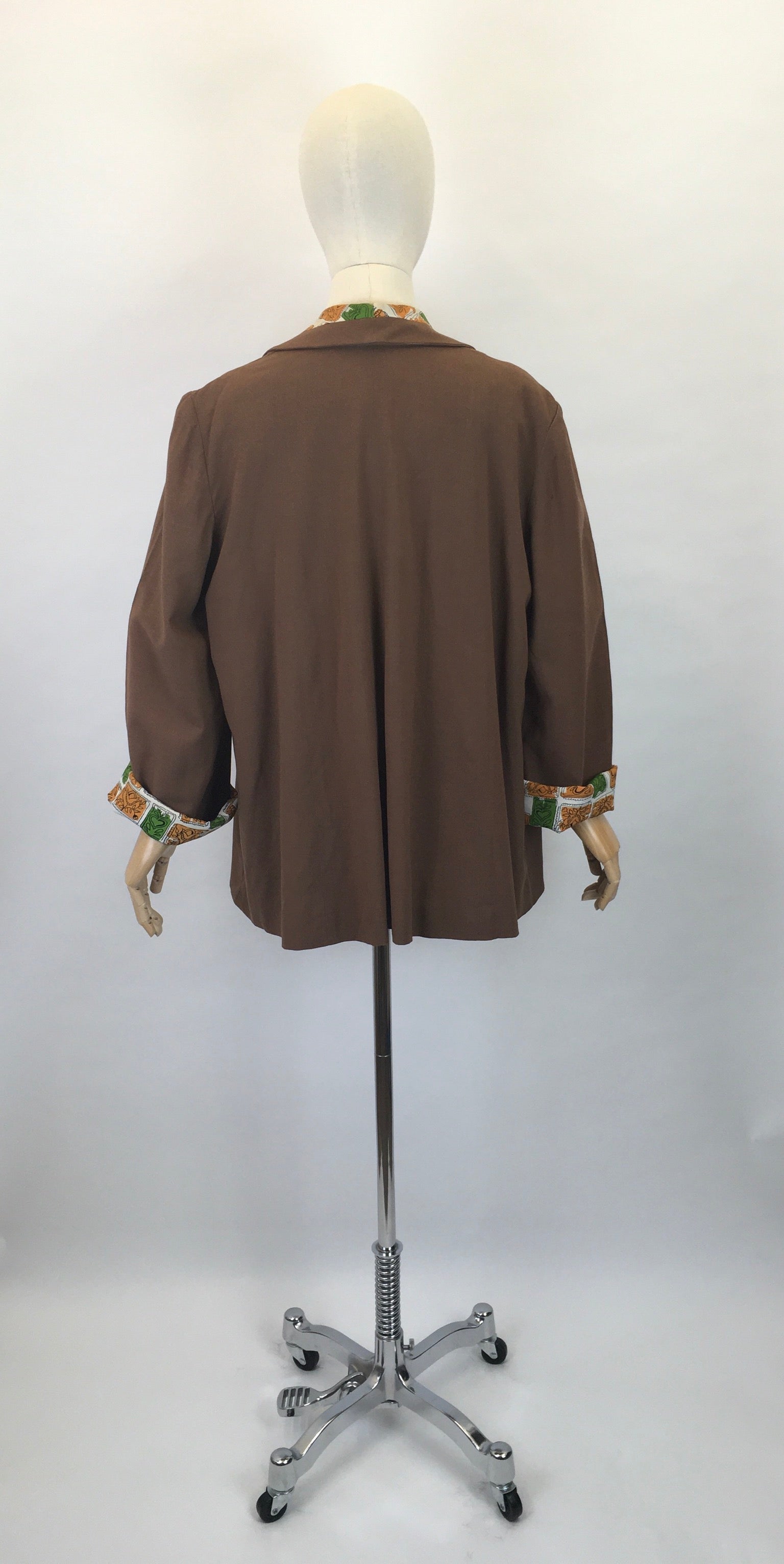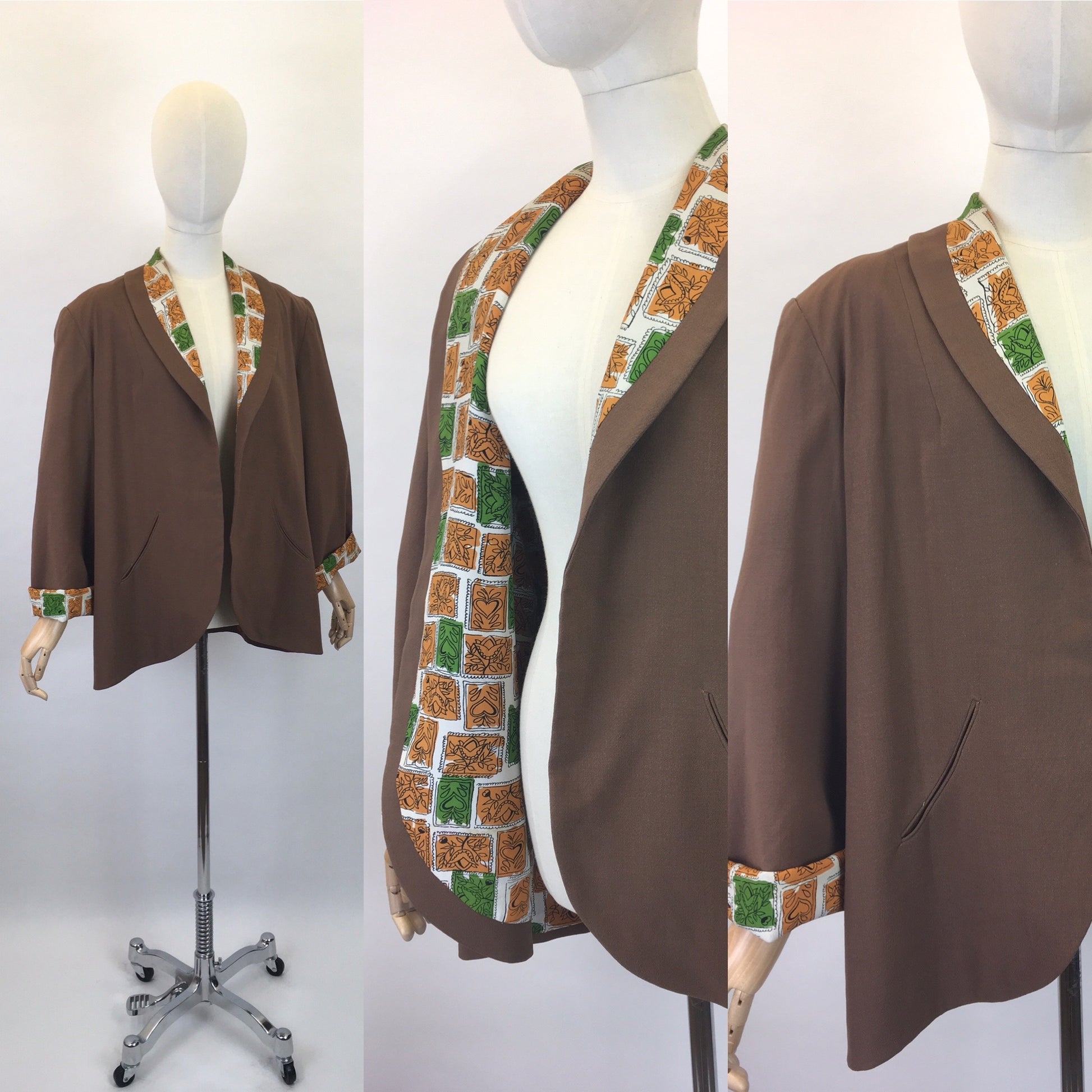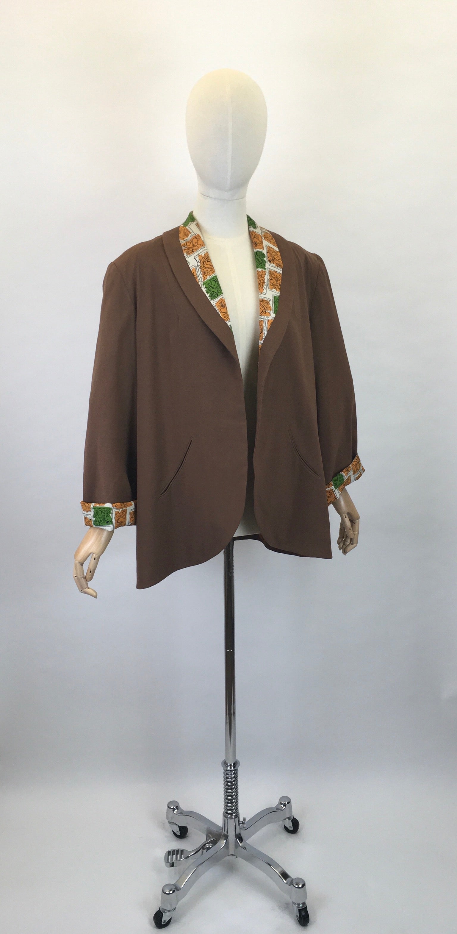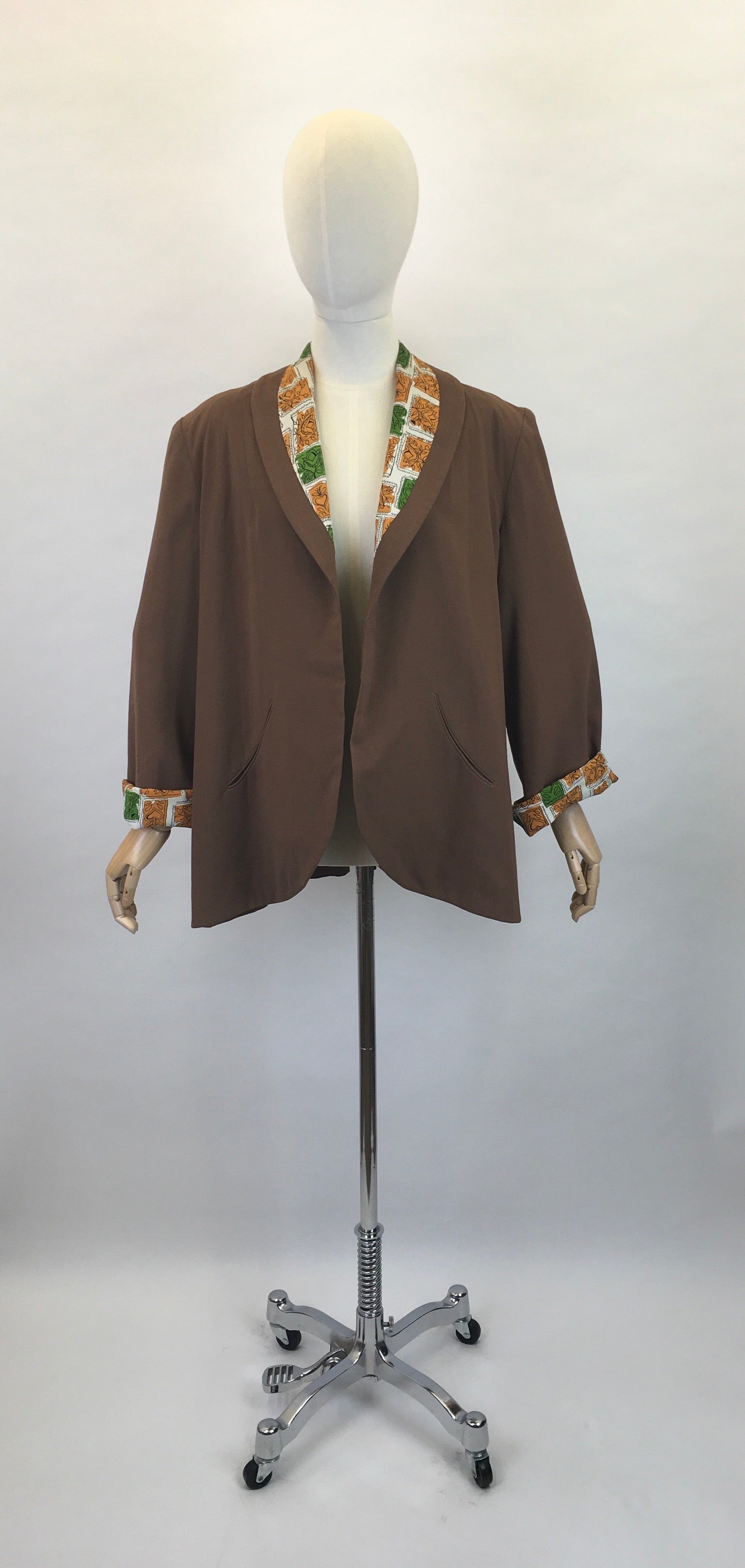 Vintage VOLUP stunning 1940s brown linen swing jacket with a gorgeous contrasting rayon lining in bright greens and oranges. Featuring a simple but elegant shape with small turn back collar, little pockets, swing shape and the option of turn back sleeves which looks fabulous as shoes some of the lining fabric. A great staple piece for any wardrobe, great to wear over jeans and a jumper or over the top of a dress. Would benefit from the addition of some shoulder pads to really accentuate the shape.