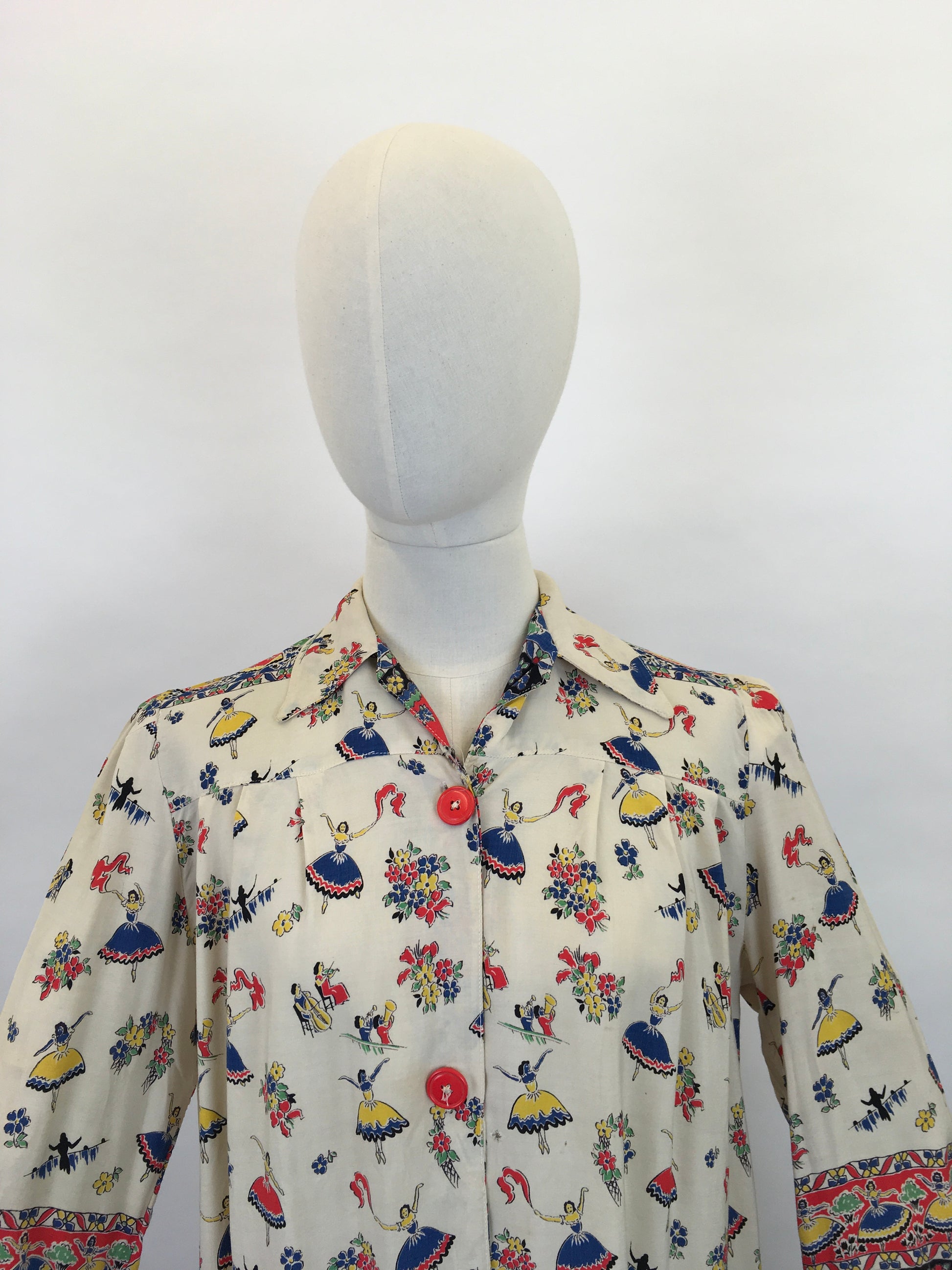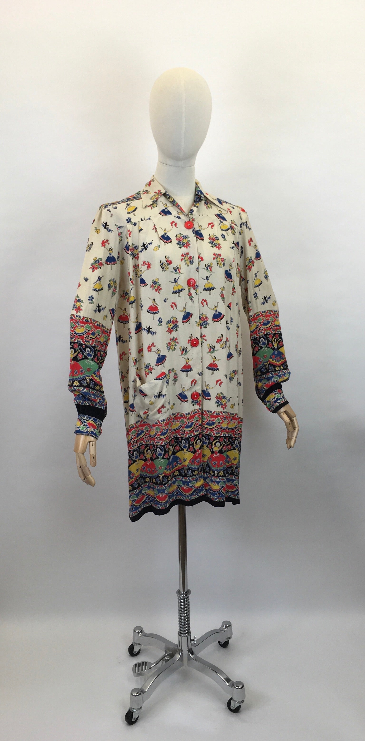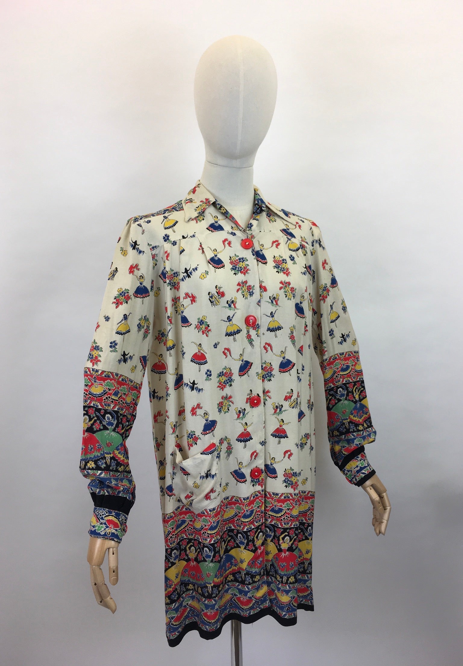 Original 1940s CC41 St. Michael Novelty Print Smock - In Fabulous Dancer Print in Bright Primary Colours