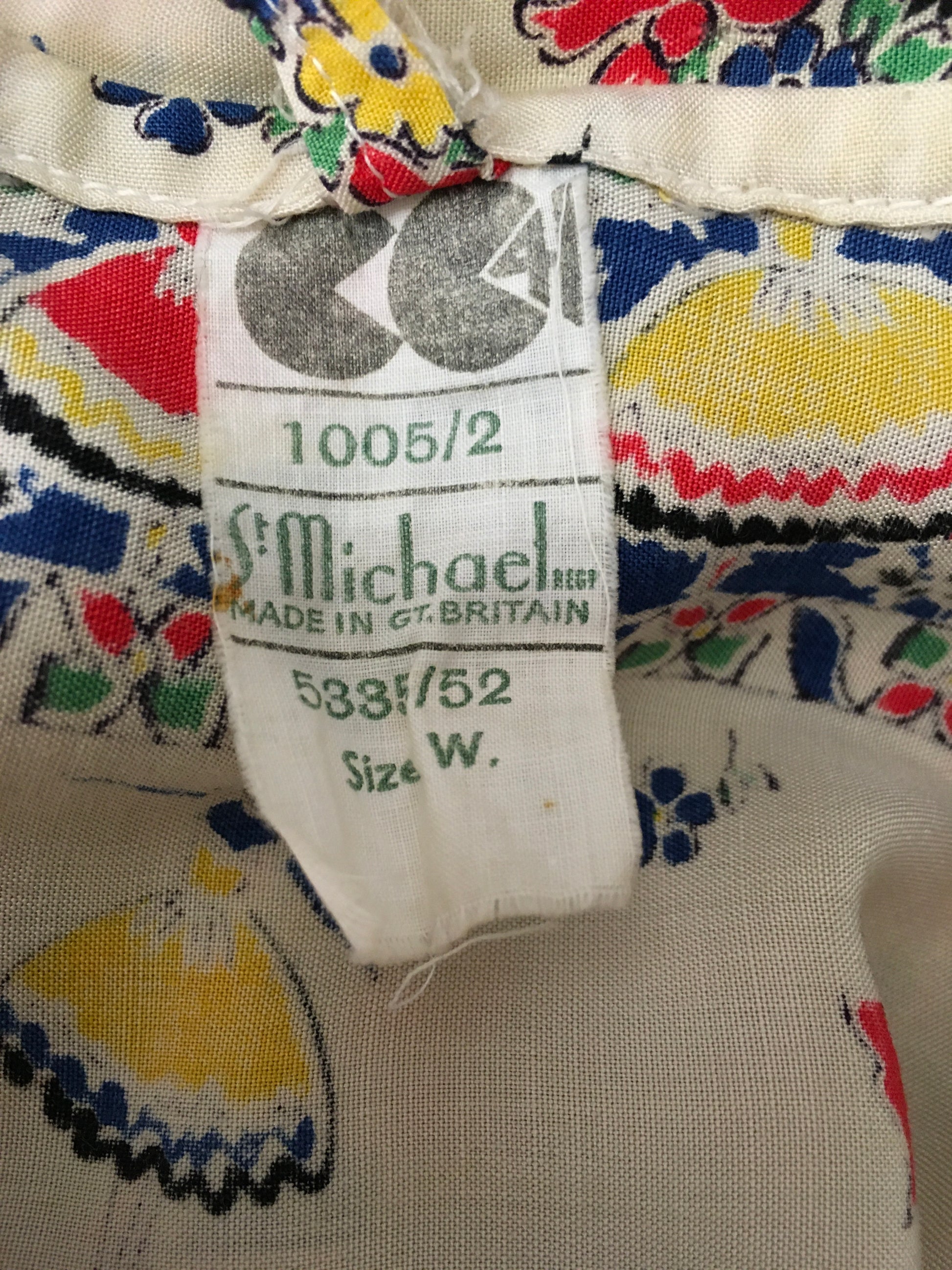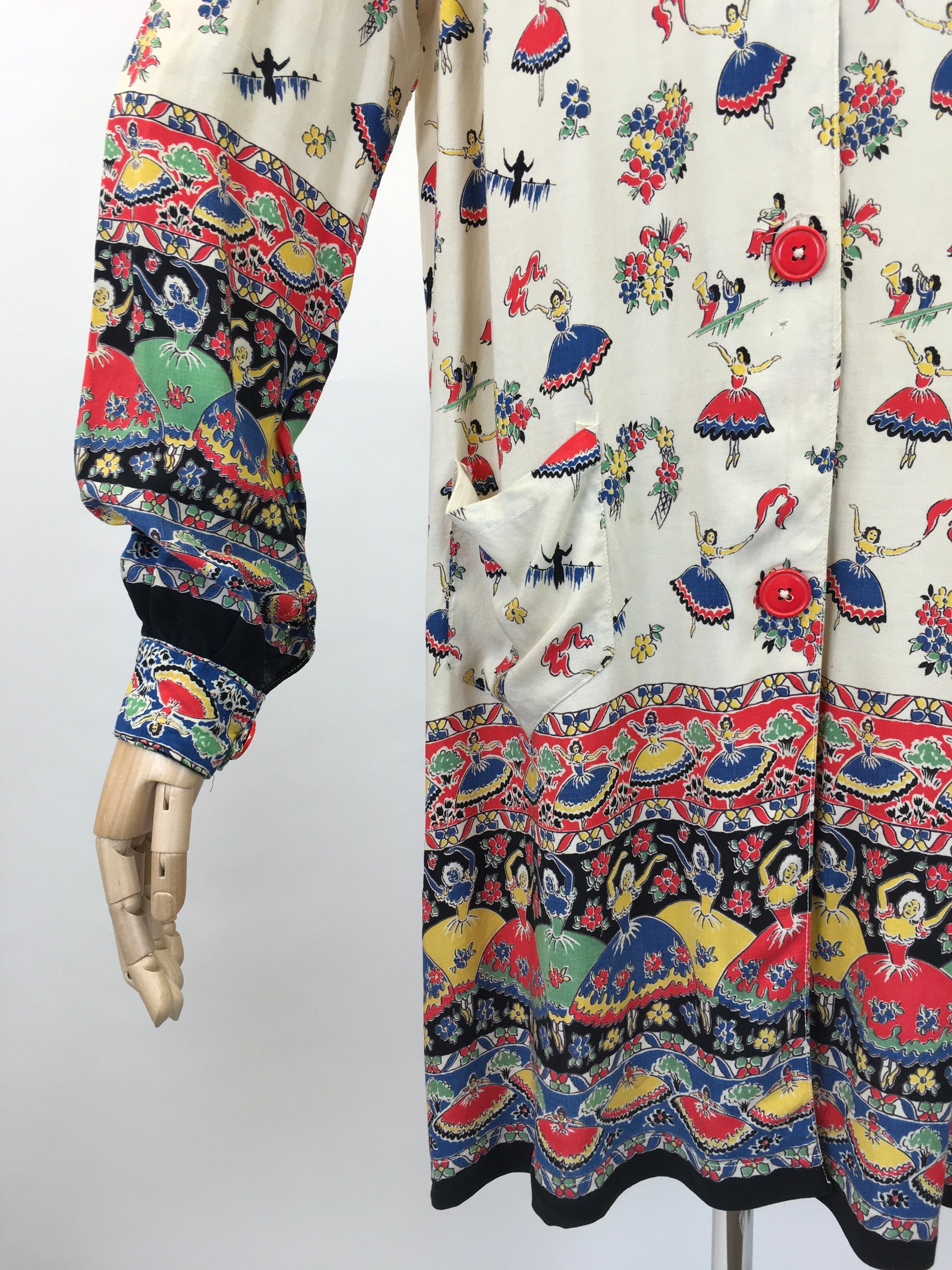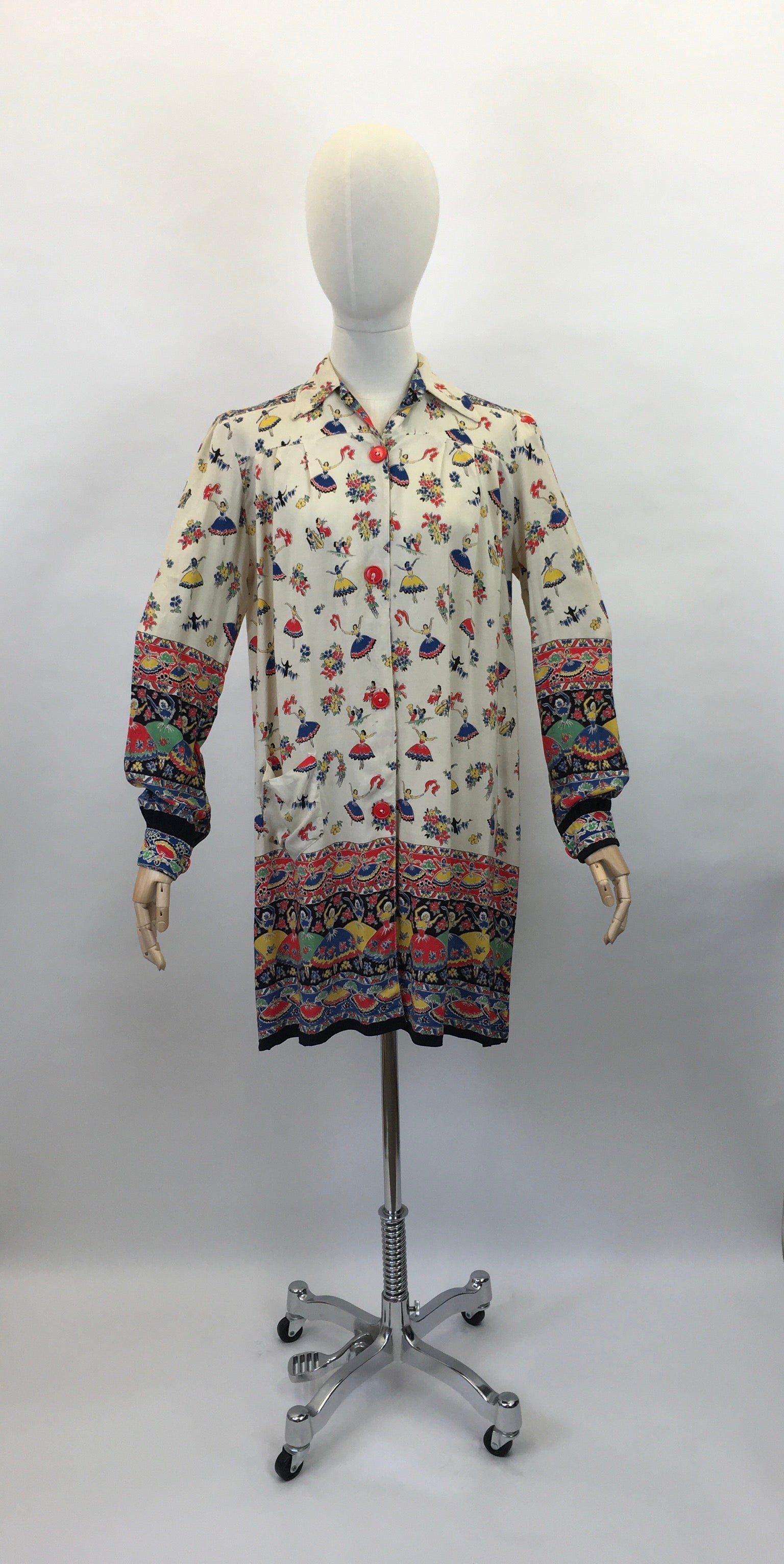 Original 1940s CC41 St. Michael Novelty Print Smock - In Fabulous Dancer Print in Bright Primary Colours