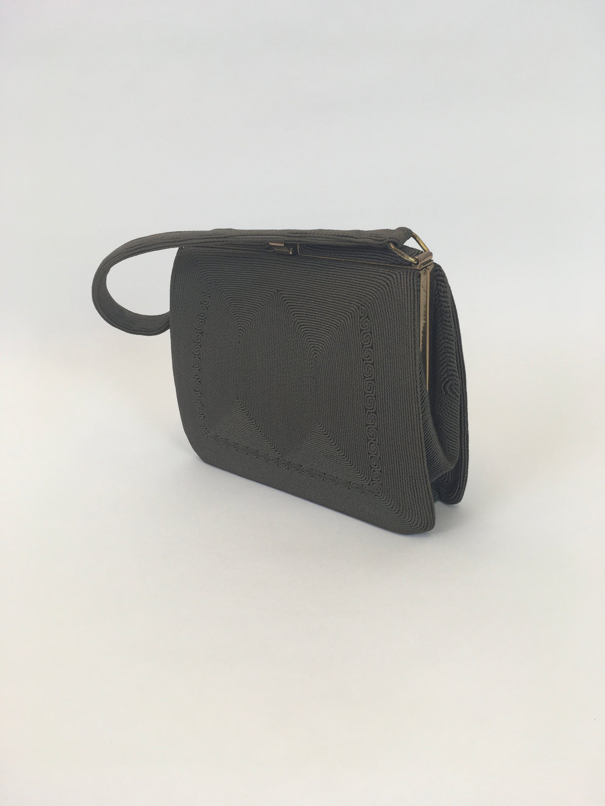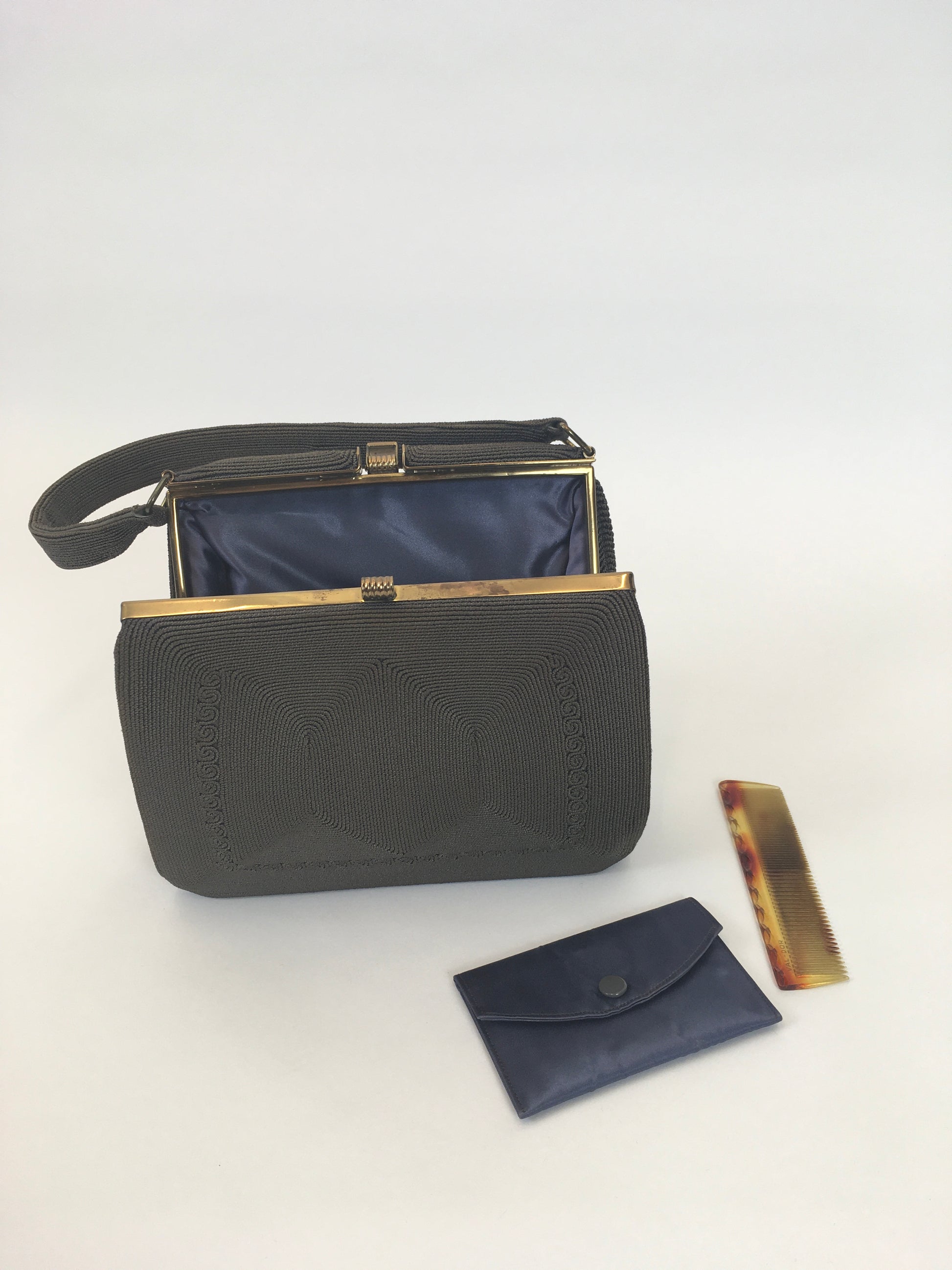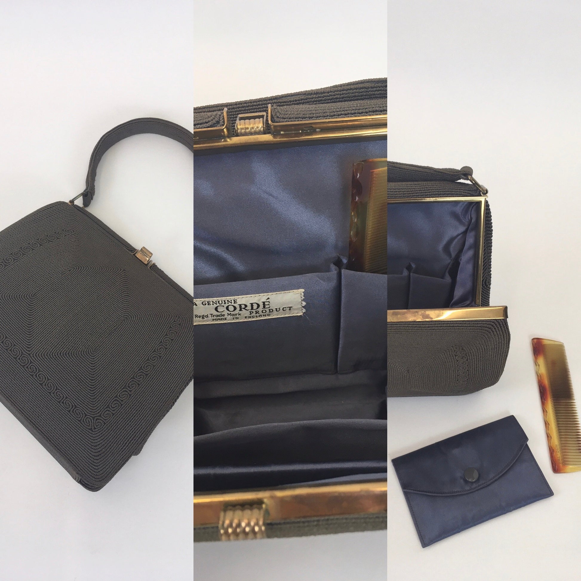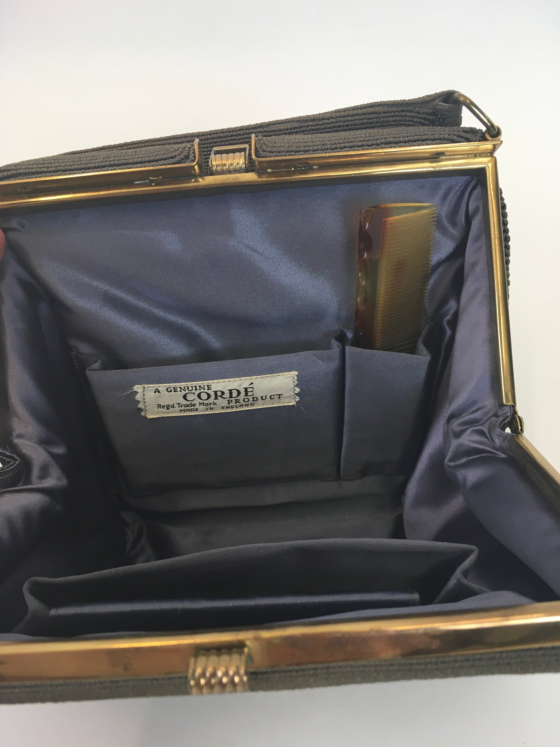 Vintage 1940s ‘ Corde ‘ Label Bag, ,made in England, in lovely condition in a grey toned brown colour pallet. Featuring a lovely shape with gold clasp and handle and having interior pockets with its original mirror and hair comb. Measuring 8’ x 13’ including the handle this is a fabulous size for both day and evening wear, big enough to fit in mod cons of the 21st century as well as some pennies and a lipstick.