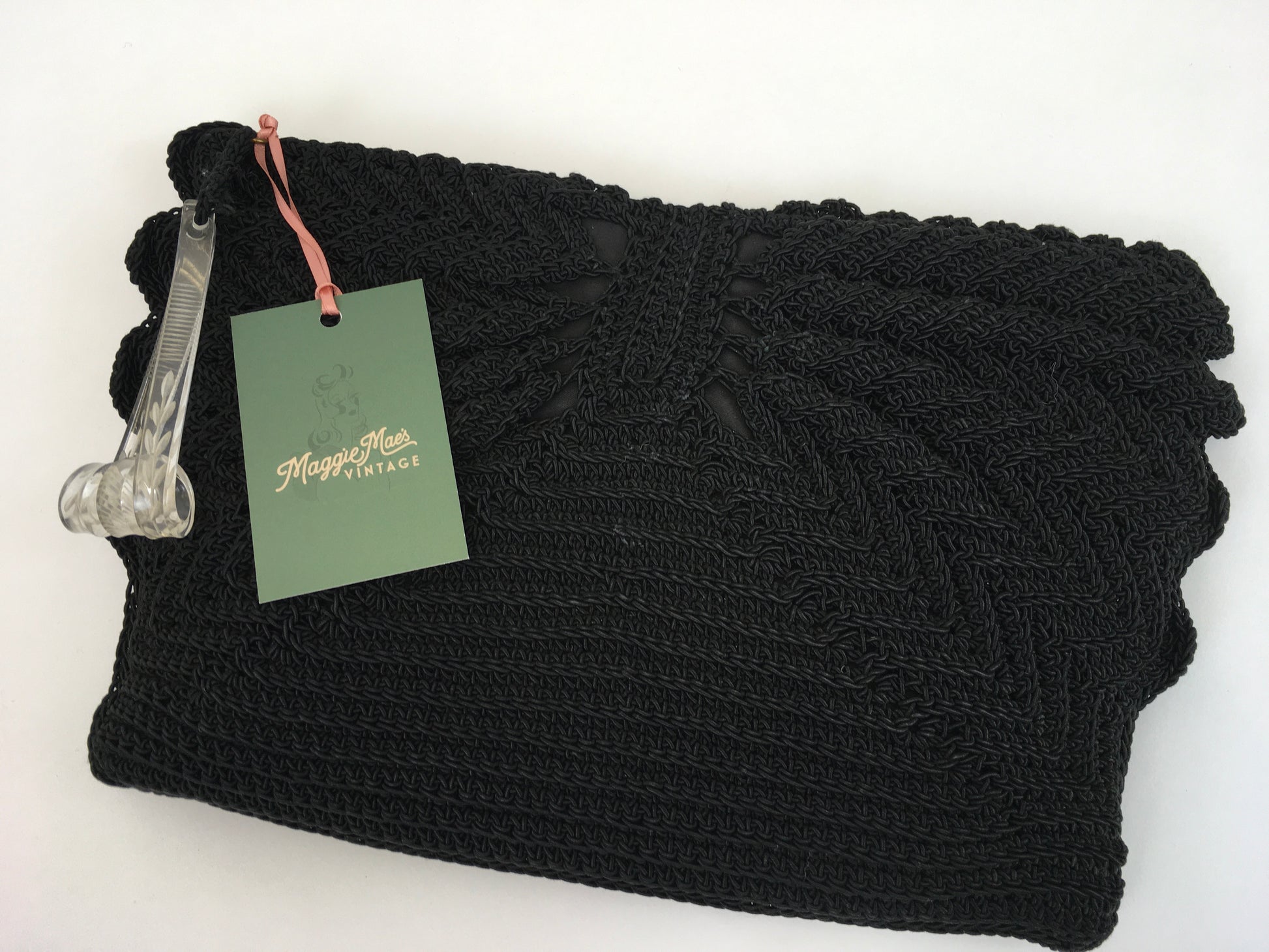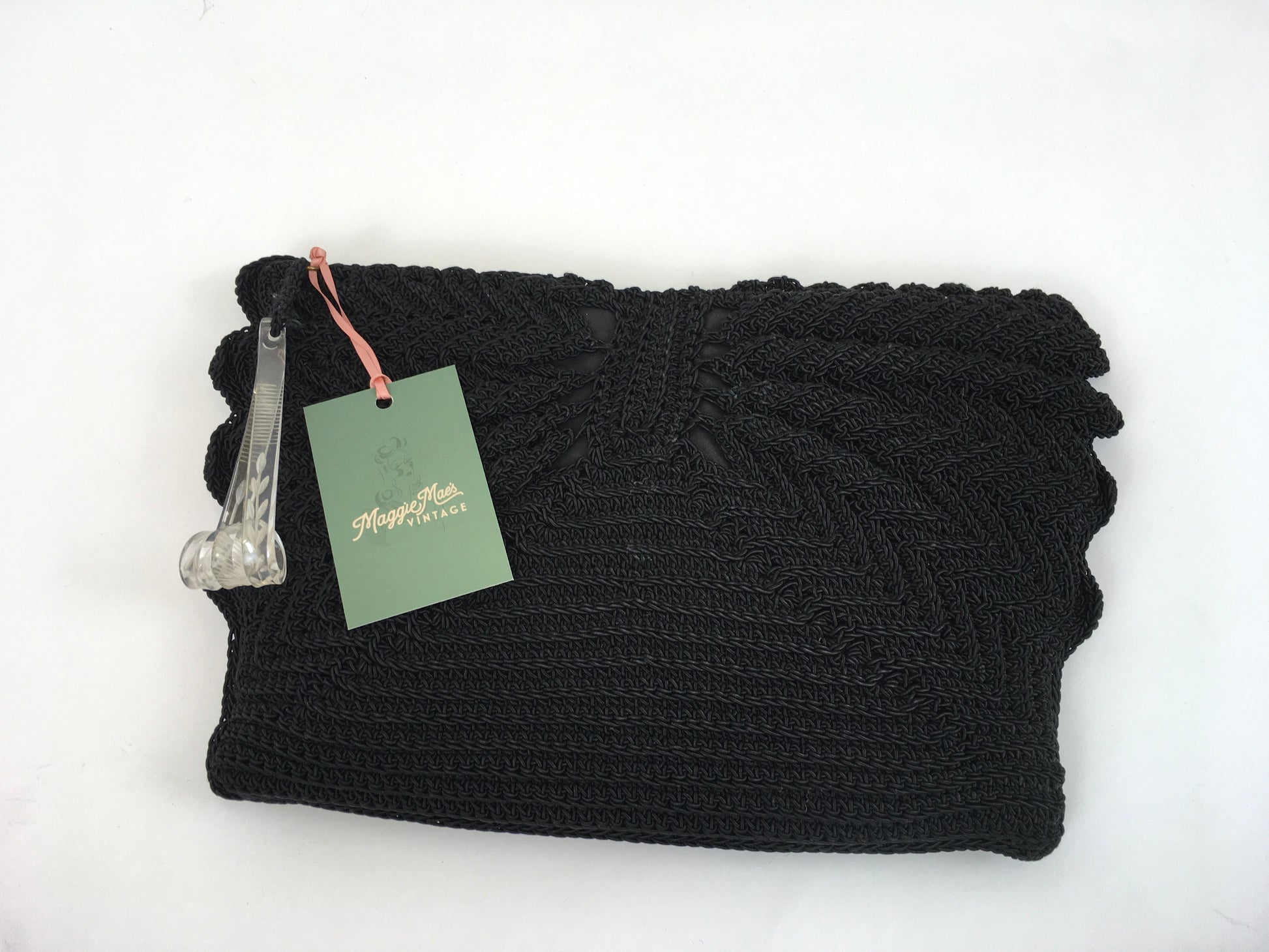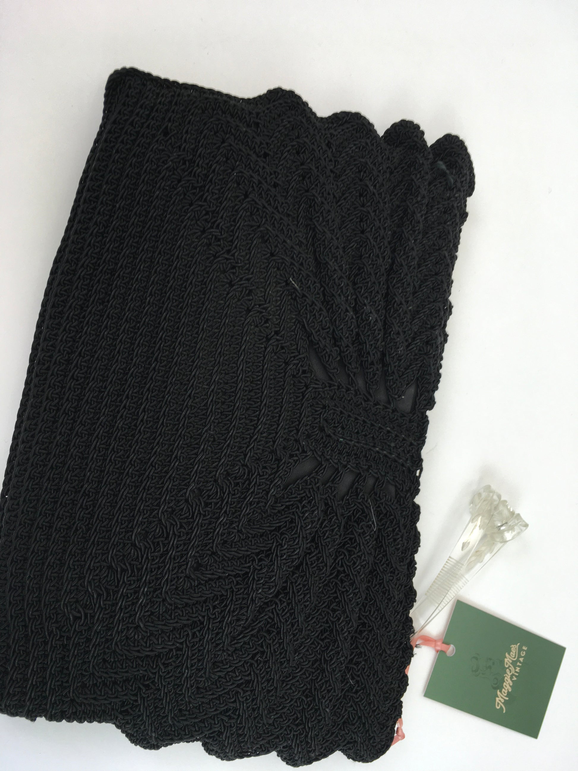 Vintage 1940s black crochet knit with beautiful fan detailing to both the front and back of the bag. The bag fastens with a metal zip and has a fabulous Chunky  lucite Zip pull. Measuring 12 1/2’ x 8’ this is a great bag for both day and evening occasions and fits all the essentials a lady could need.