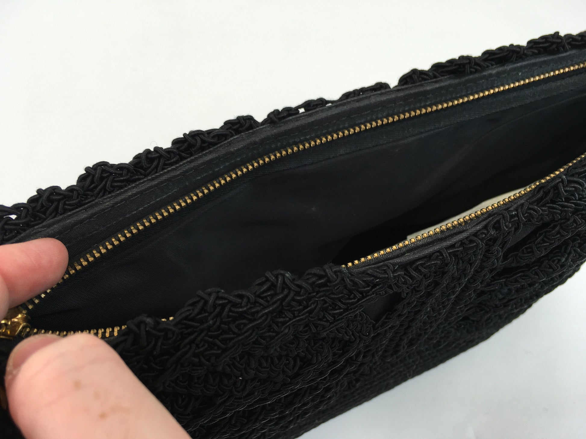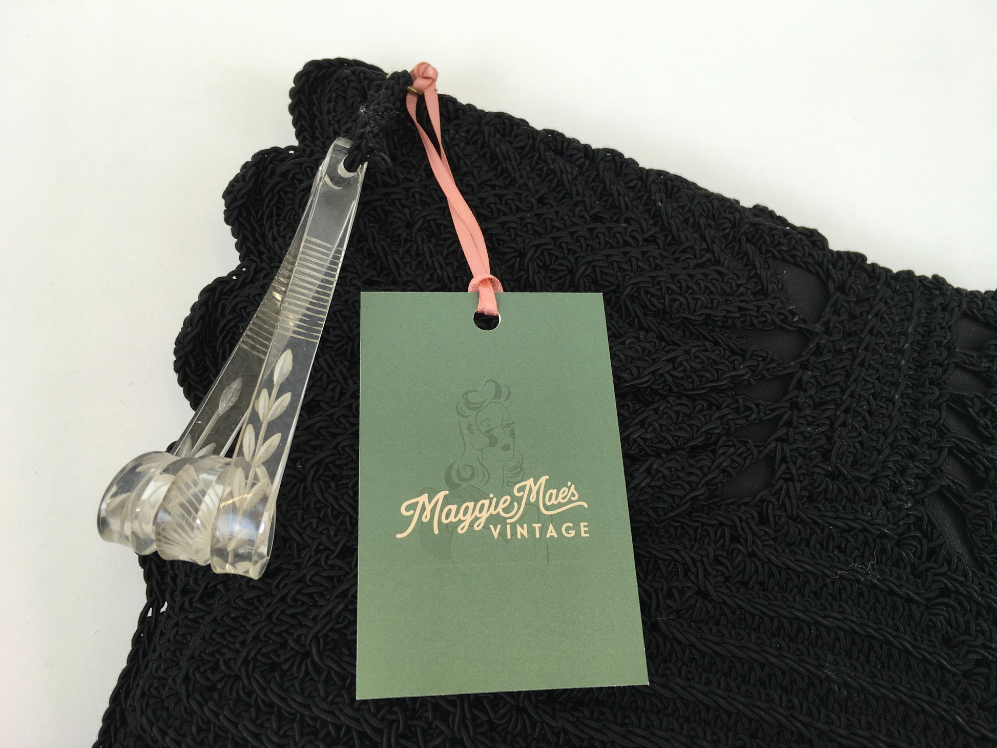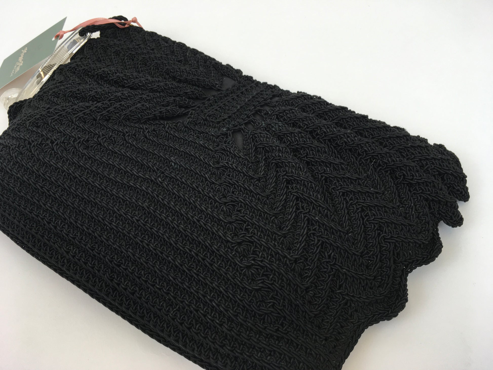 Vintage 1940s black crochet knit with beautiful fan detailing to both the front and back of the bag. The bag fastens with a metal zip and has a fabulous Chunky  lucite Zip pull. Measuring 12 1/2’ x 8’ this is a great bag for both day and evening occasions and fits all the essentials a lady could need.