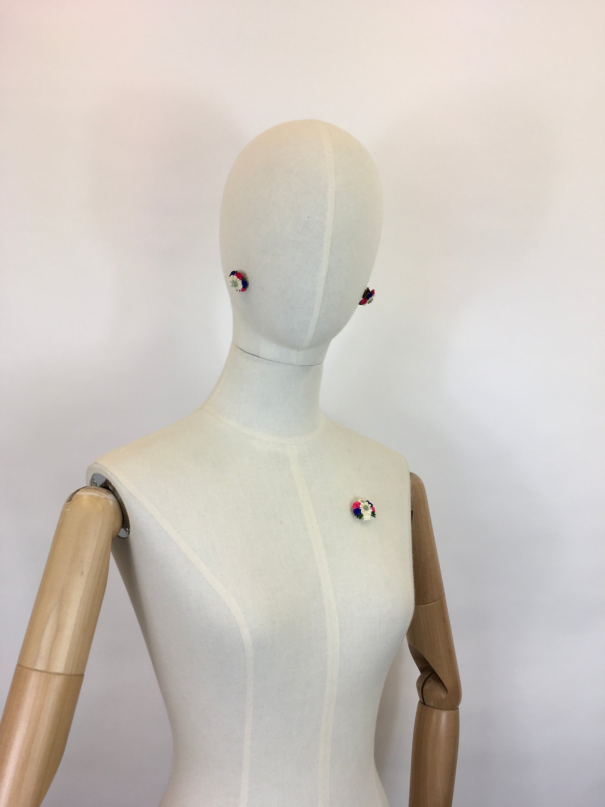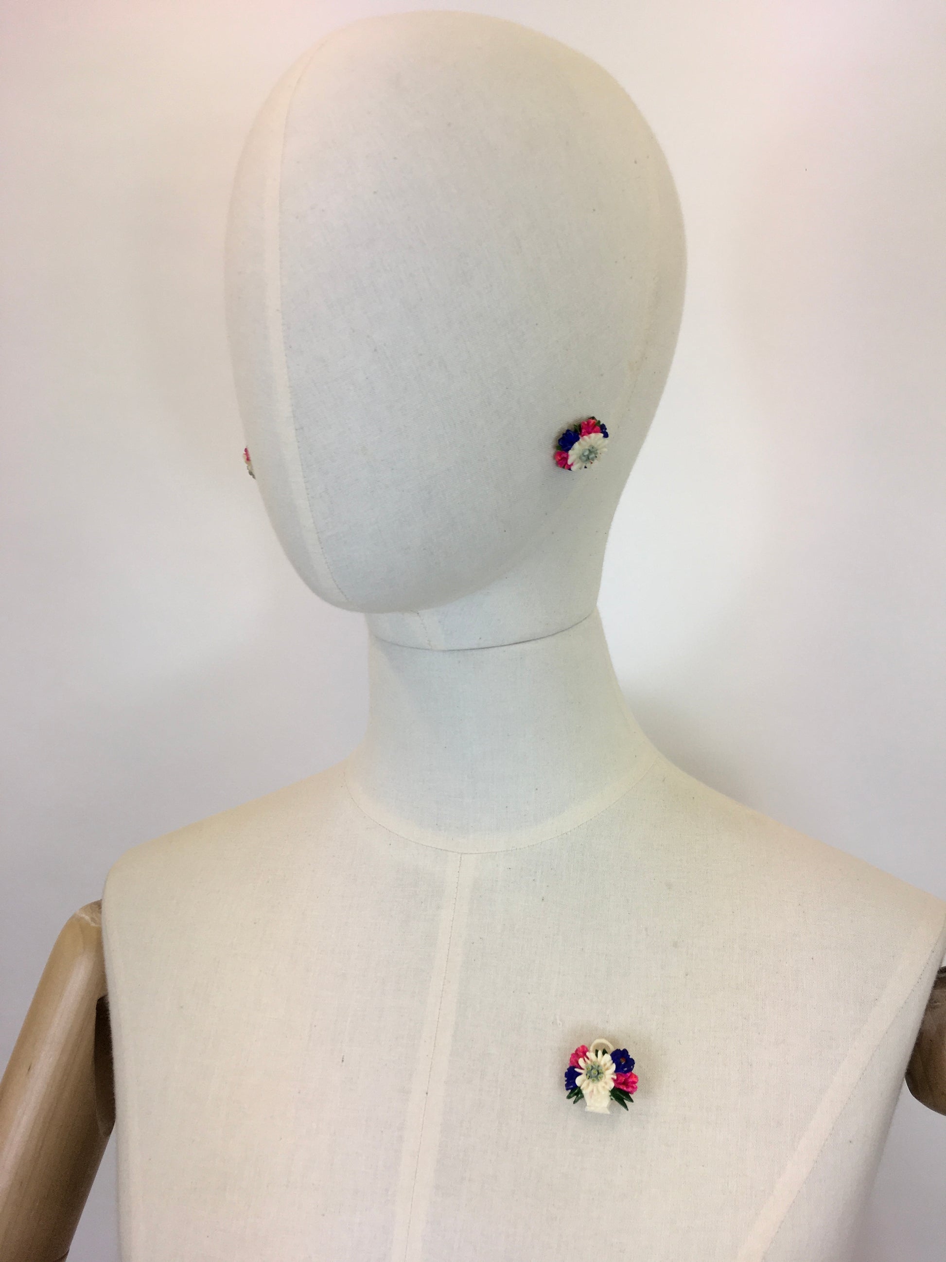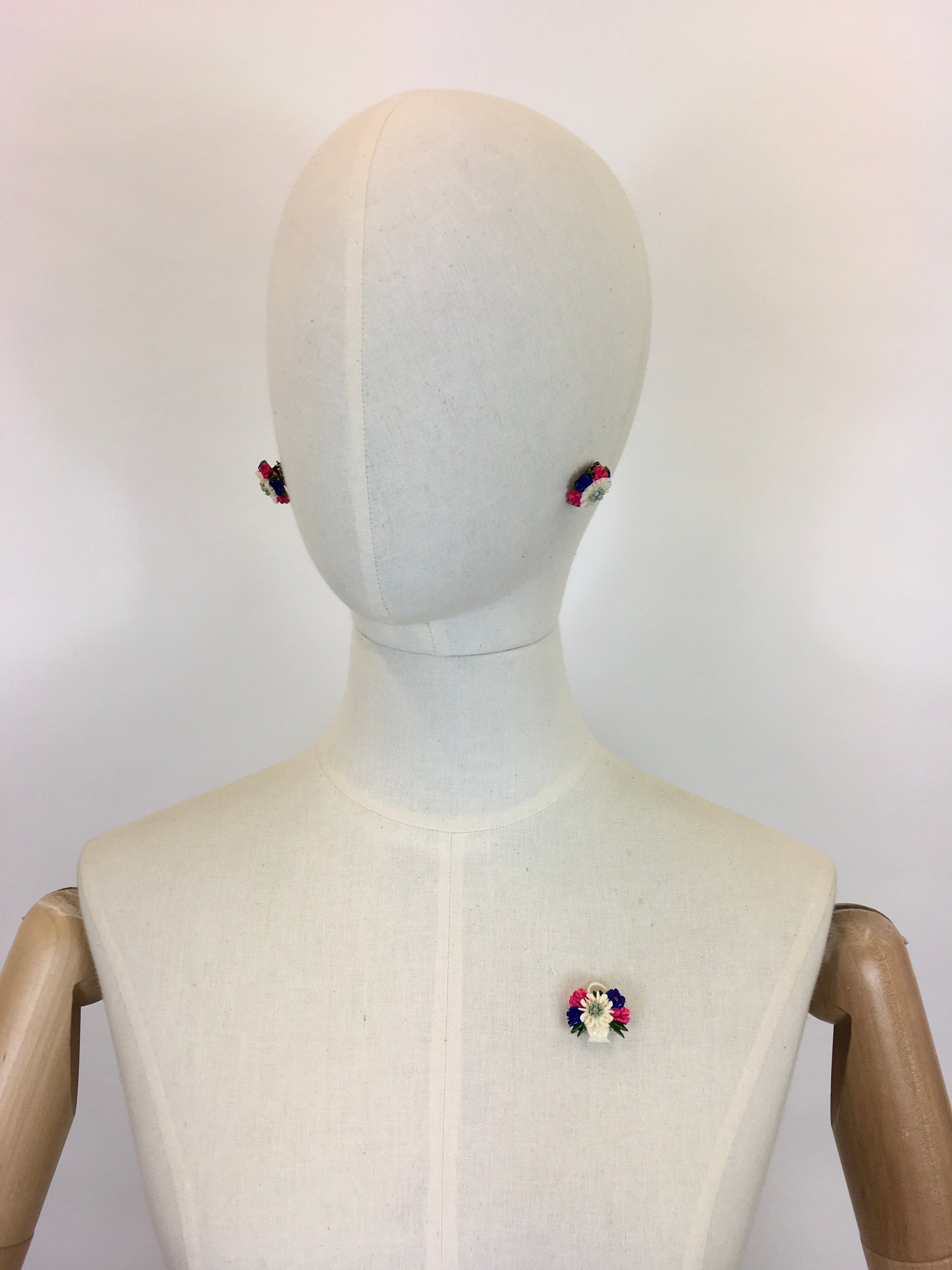Vintage 1940’s Darling set consisting of clip on earrings and a brooch. In a beautifully intricate and delicate edelweiss and floral combination. The brooch features a basket design with the florals sprawling out. In a beautiful primary colour combination of pink, blue, Green , ivory and neutrals. In lovely condition.