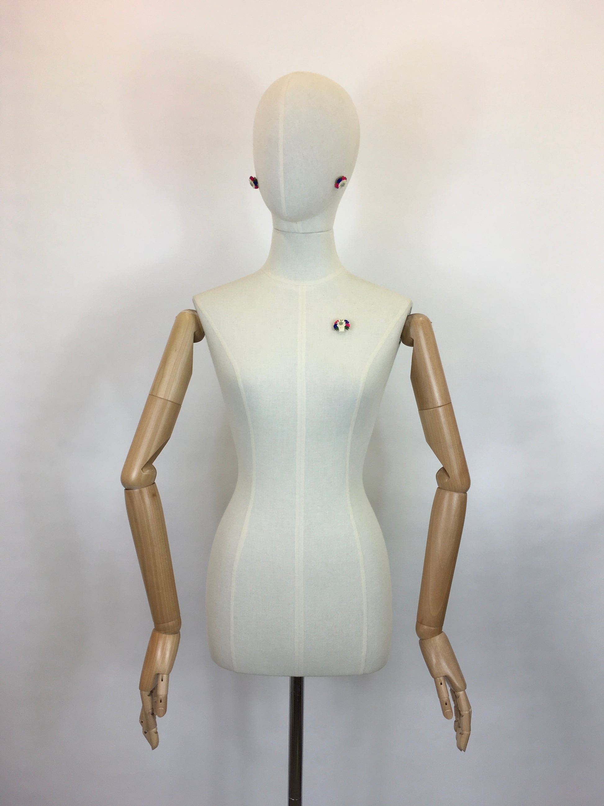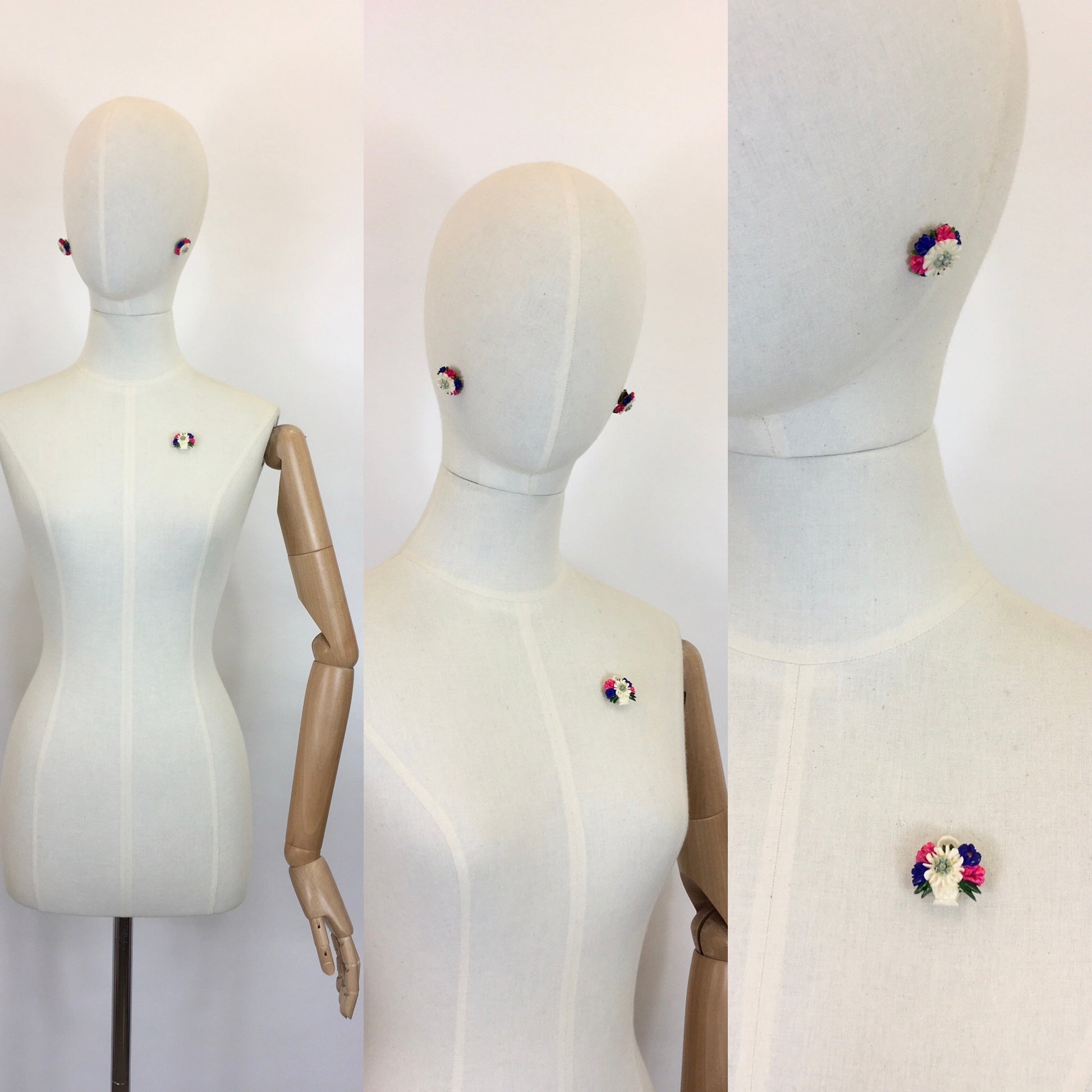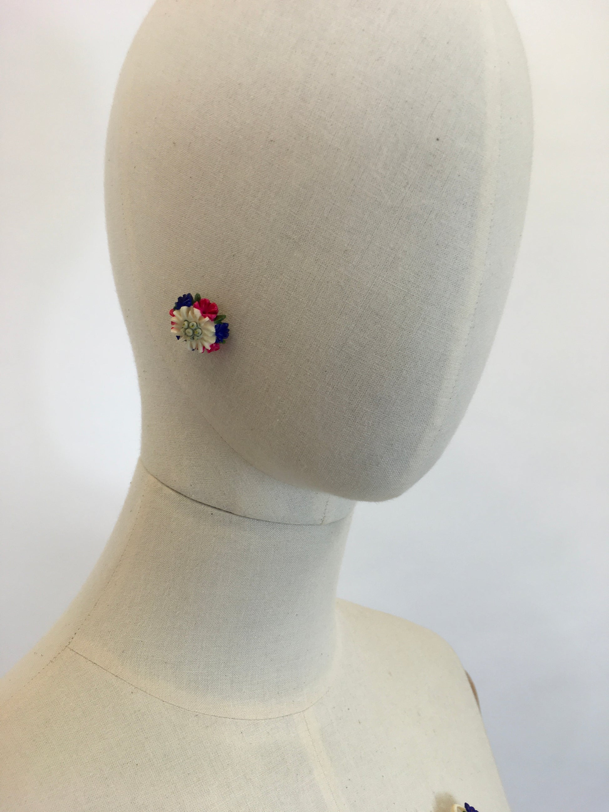 Vintage 1940’s Darling set consisting of clip on earrings and a brooch. In a beautifully intricate and delicate edelweiss and floral combination. The brooch features a basket design with the florals sprawling out. In a beautiful primary colour combination of pink, blue, Green , ivory and neutrals. In lovely condition.