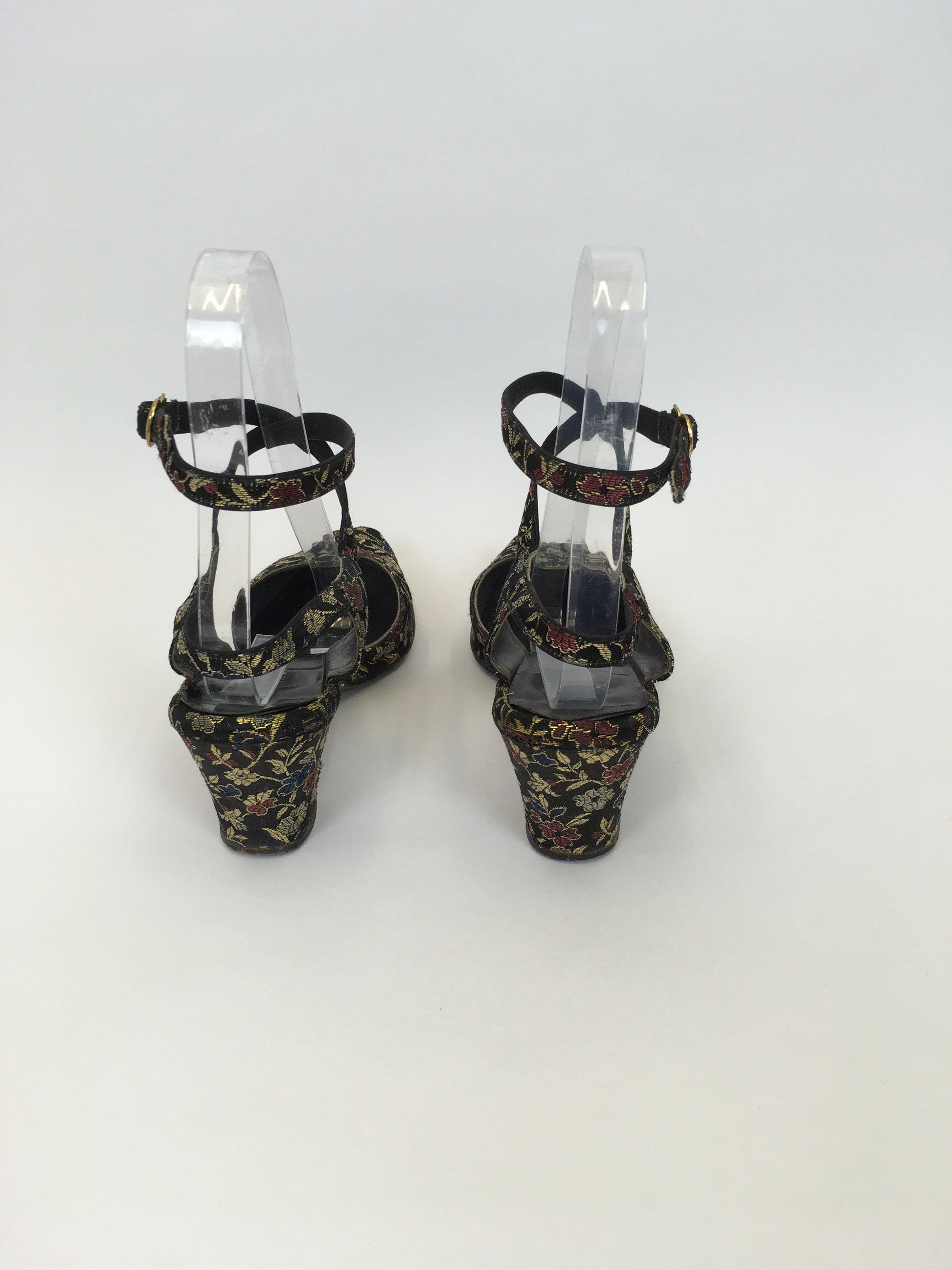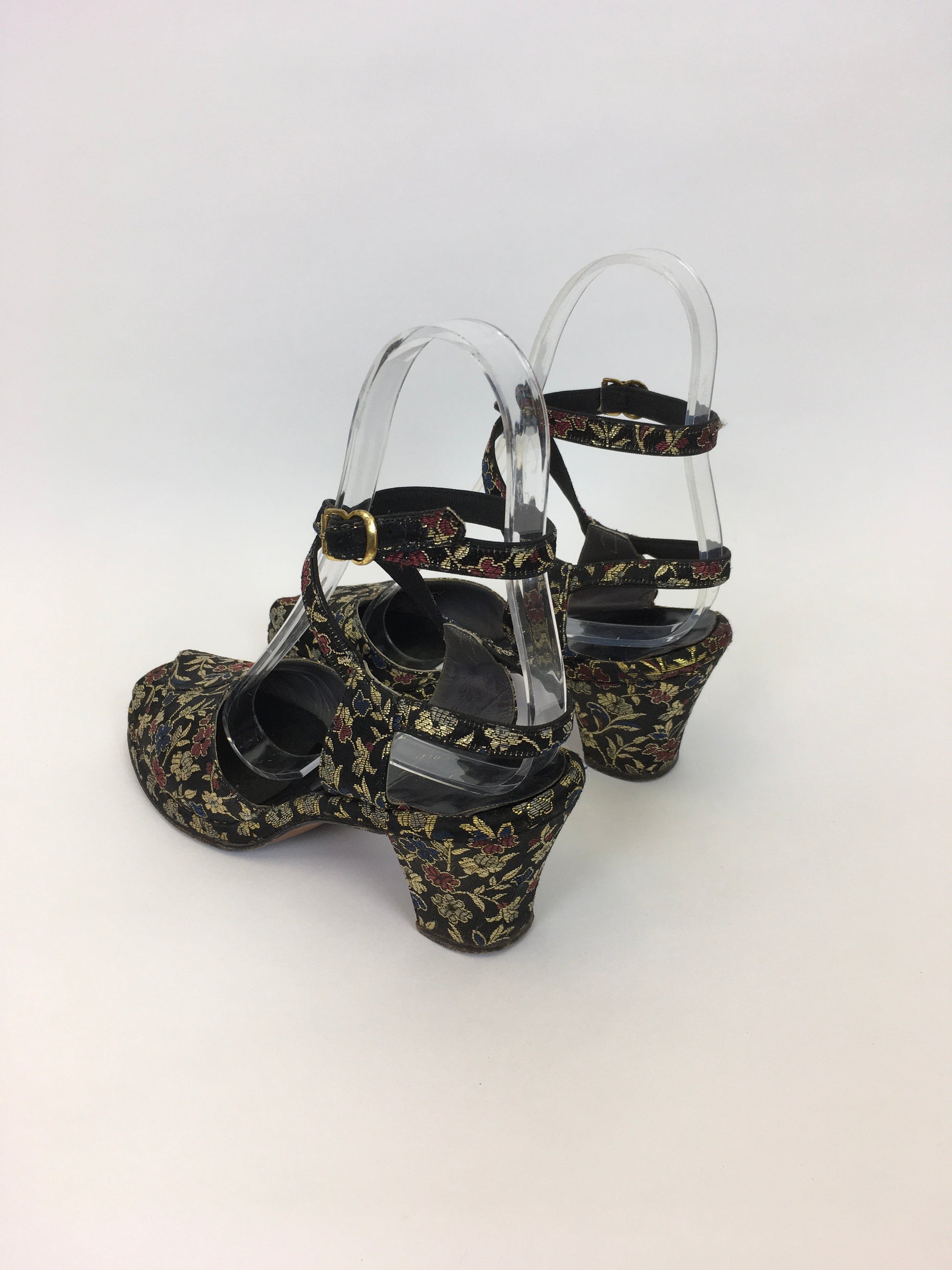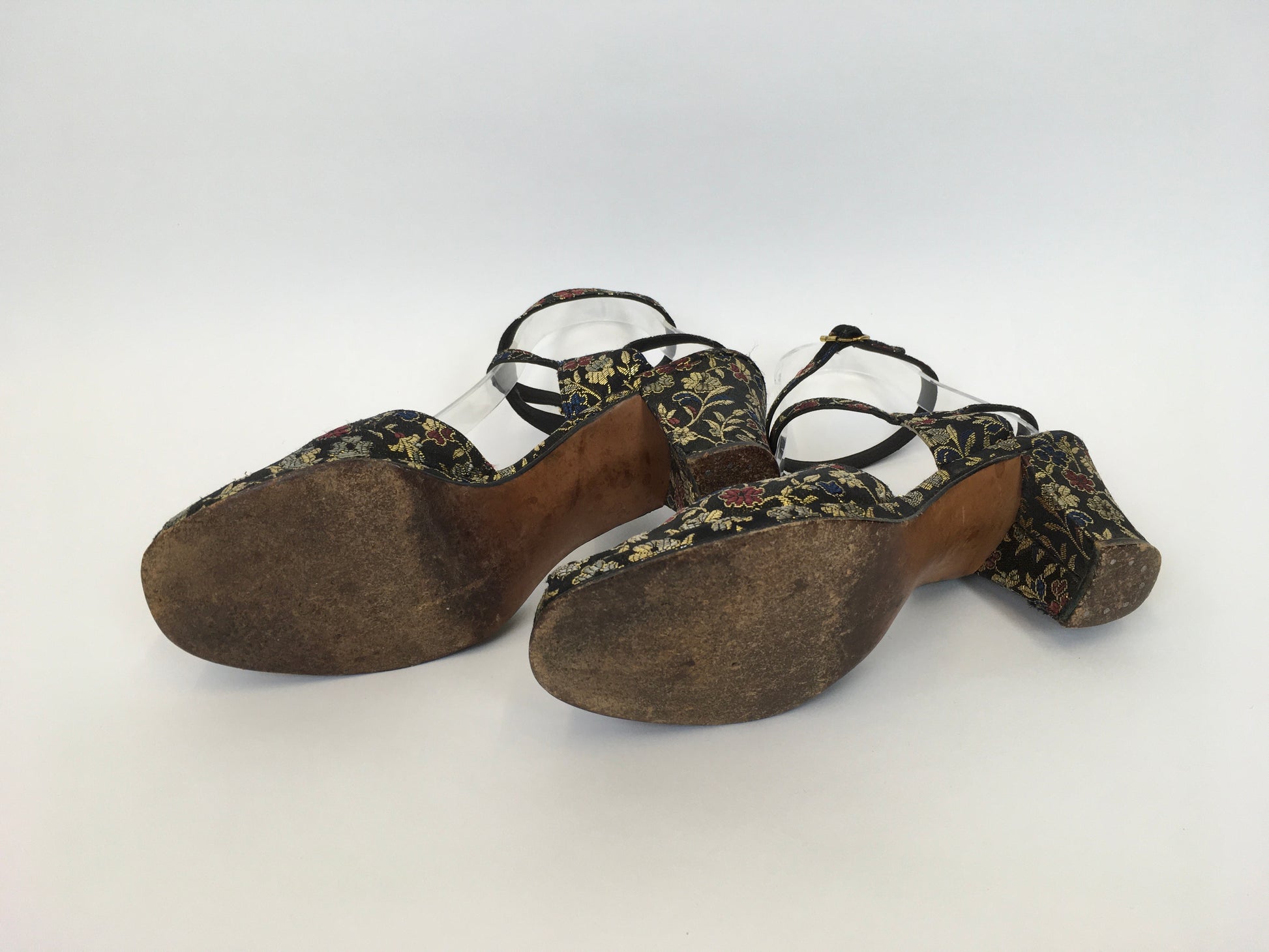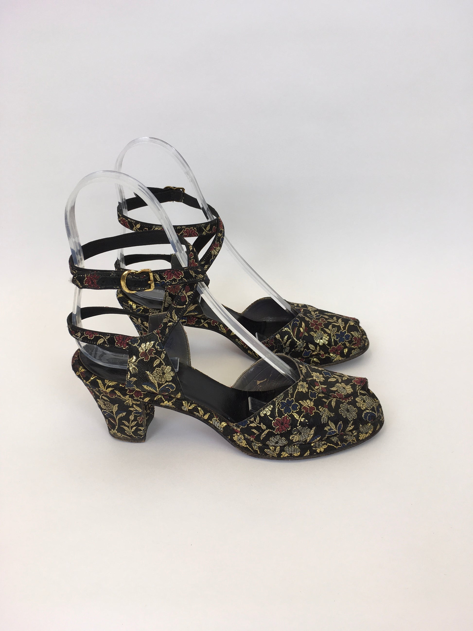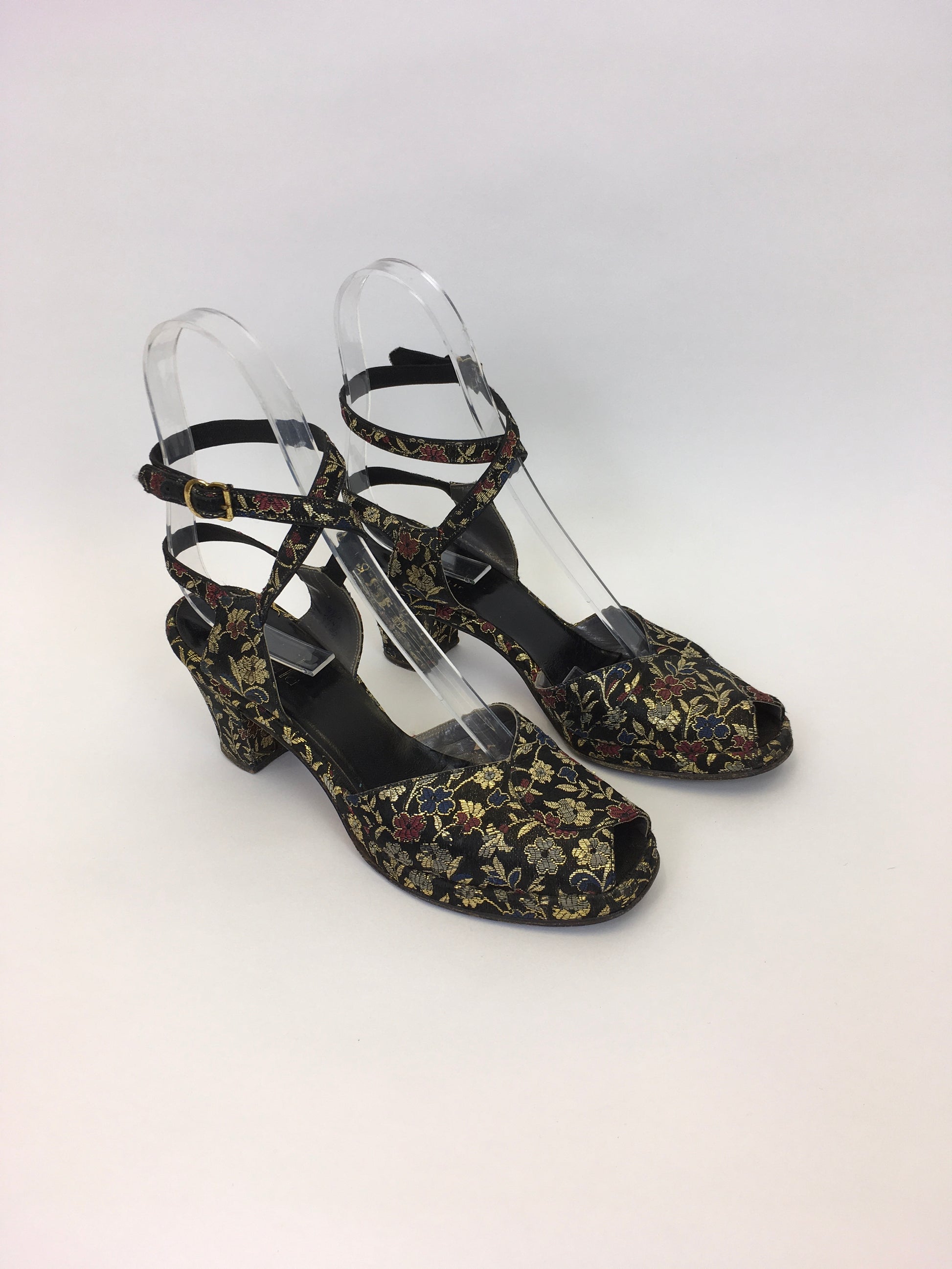 Original 1940s Heeled Sandals In A Beautiful Floral Brocade - Made by The Fabulous ‘ Colella’ American Label