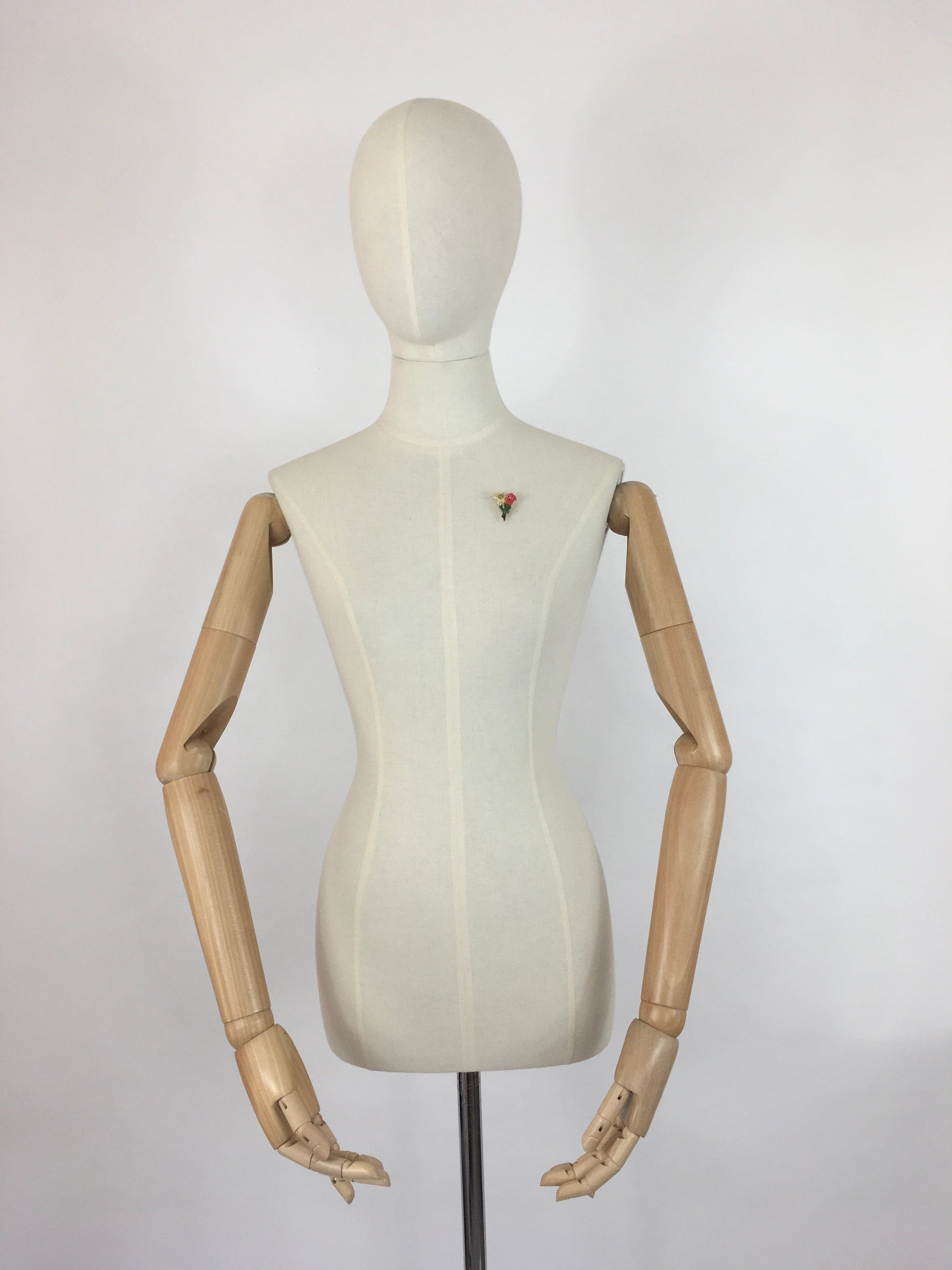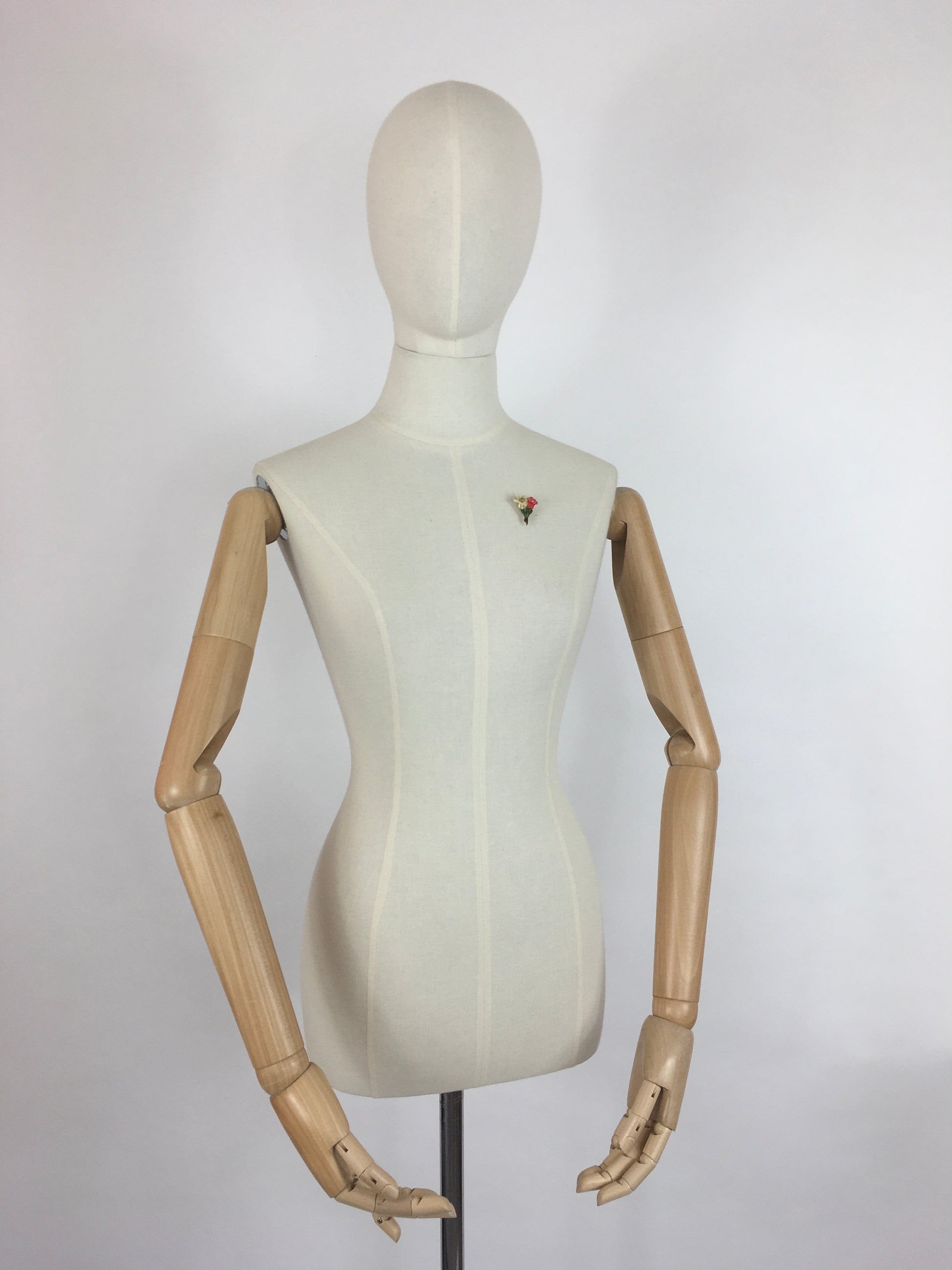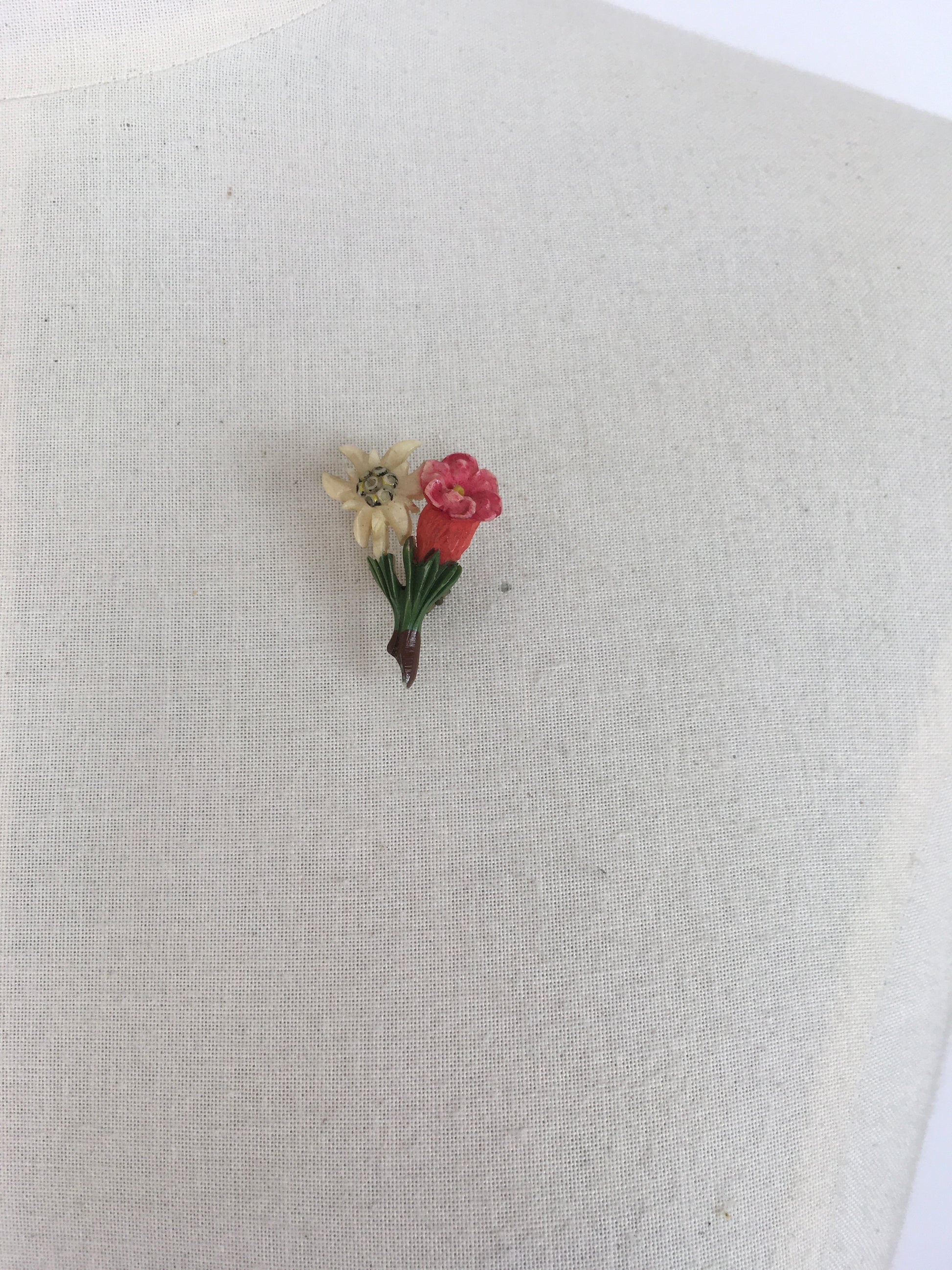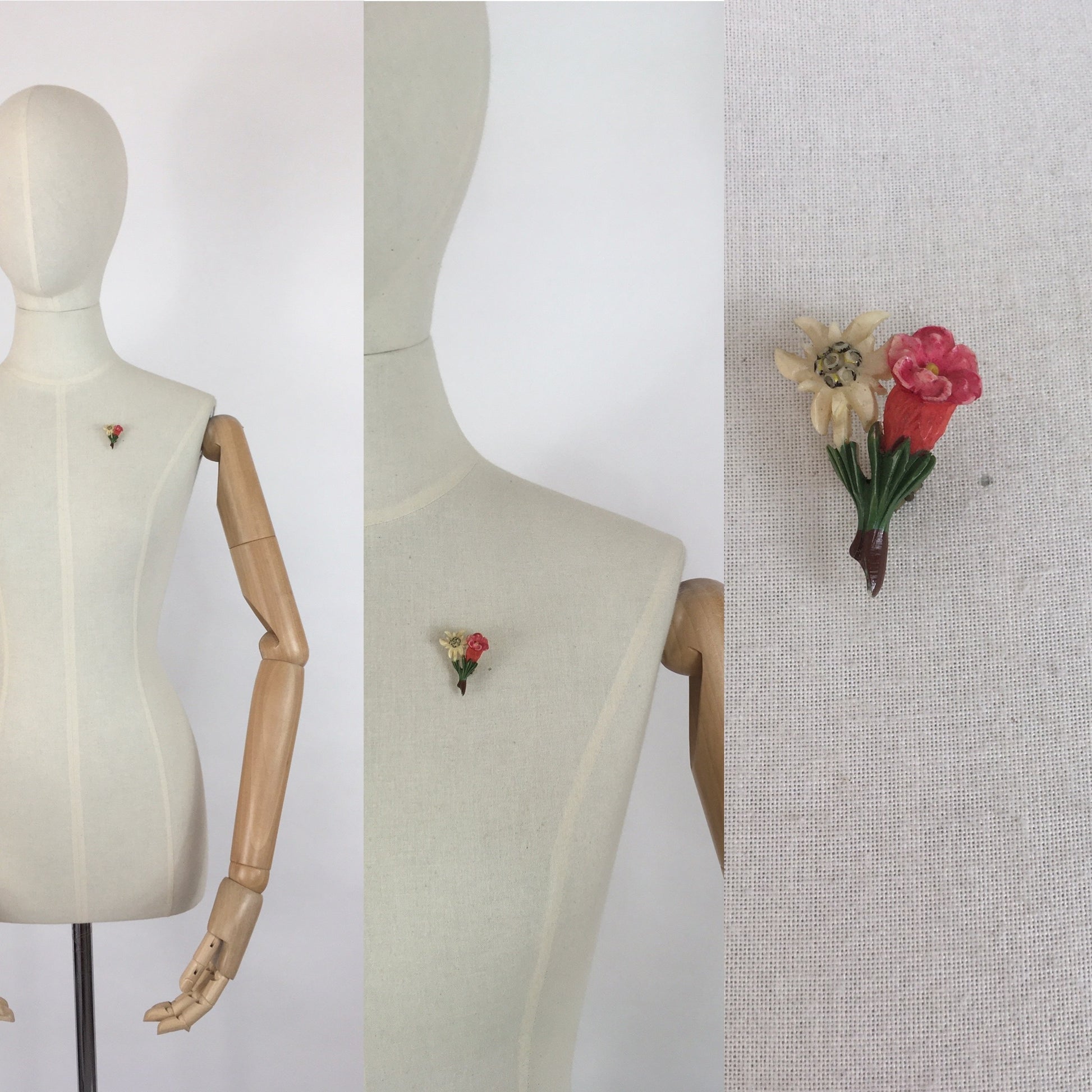 Vintage 1940s floral celluloid brooch in a lovely colour pallet of cream, red and green. Measuring 3 cm x 2 cm this little piece is a nice addition for a lapel of a jacket or a cardigan to bring a little detail to your outfit.