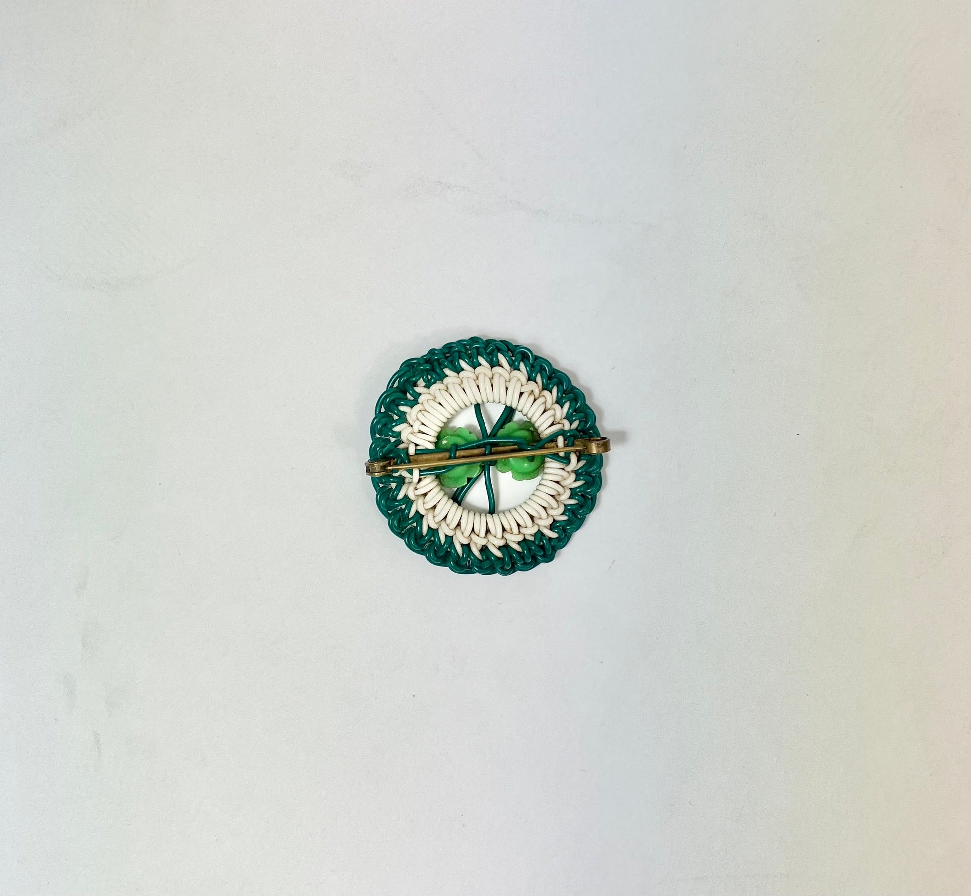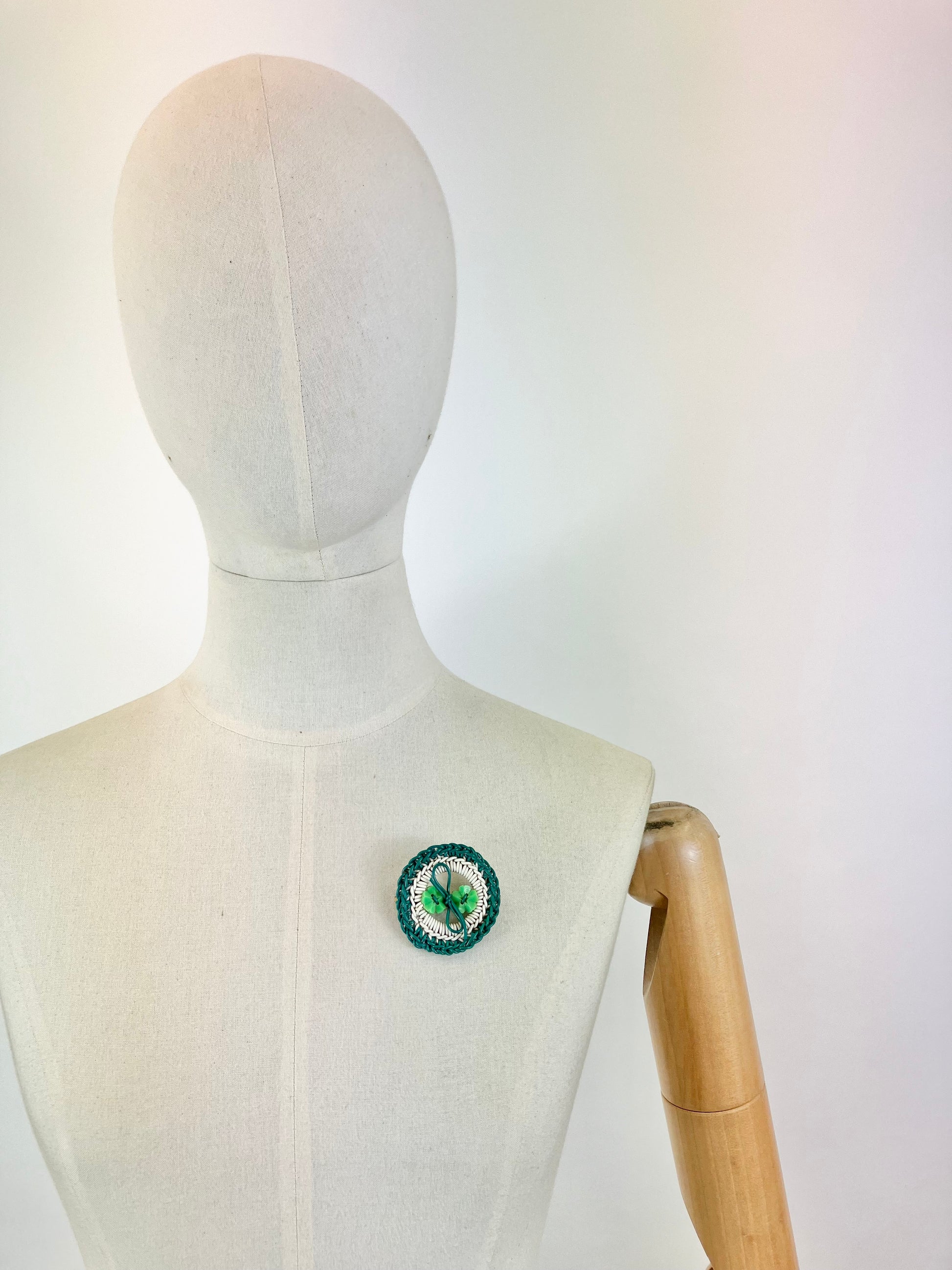 Original 1940's Make Do & Mend Cord Brooch - Jade Green / White