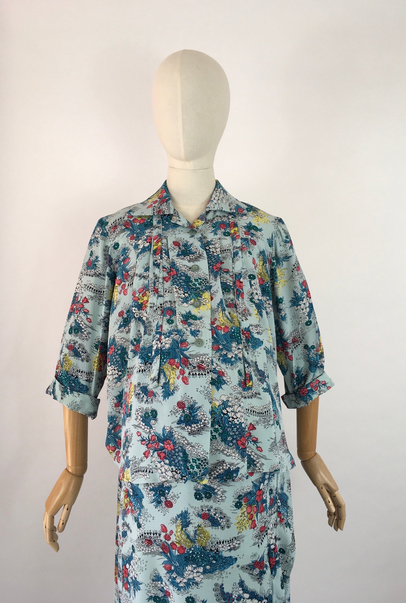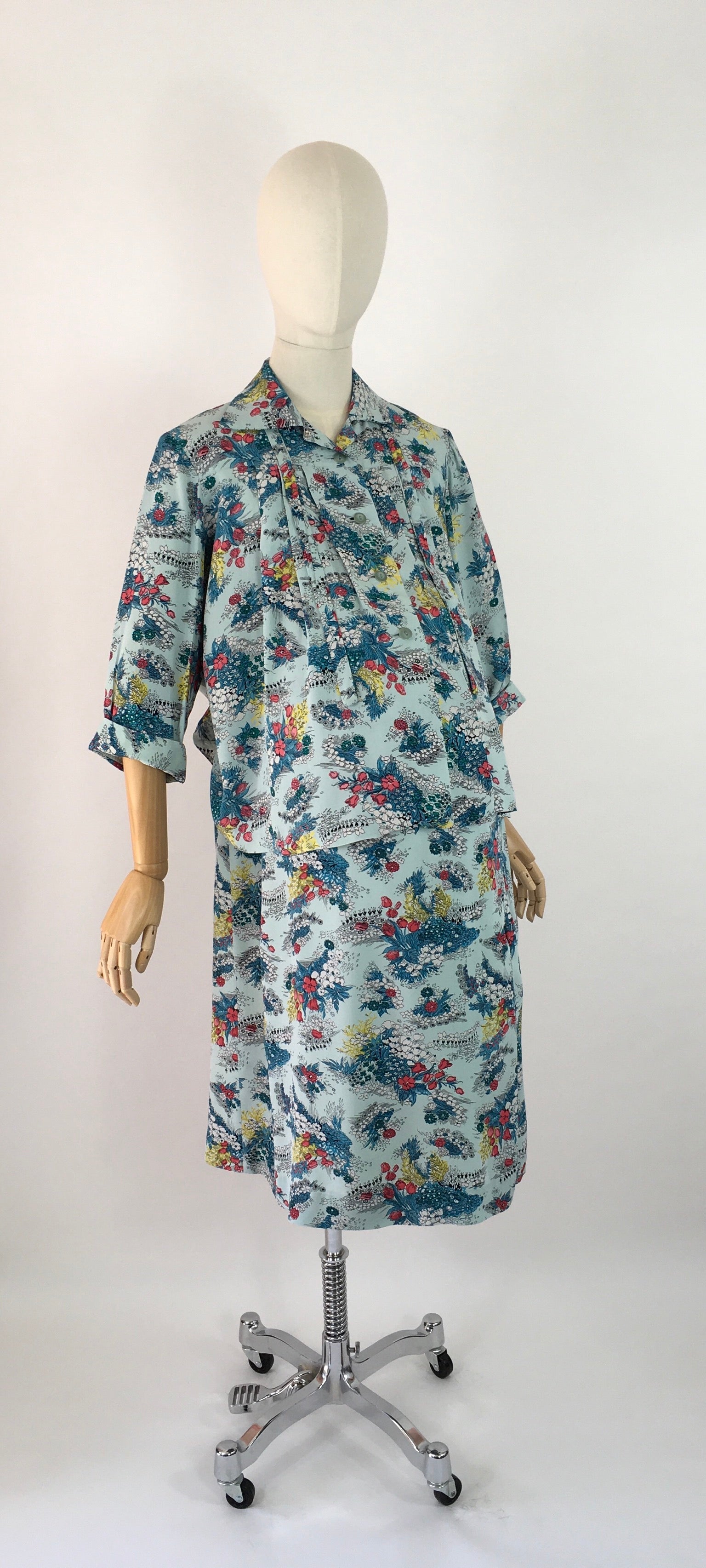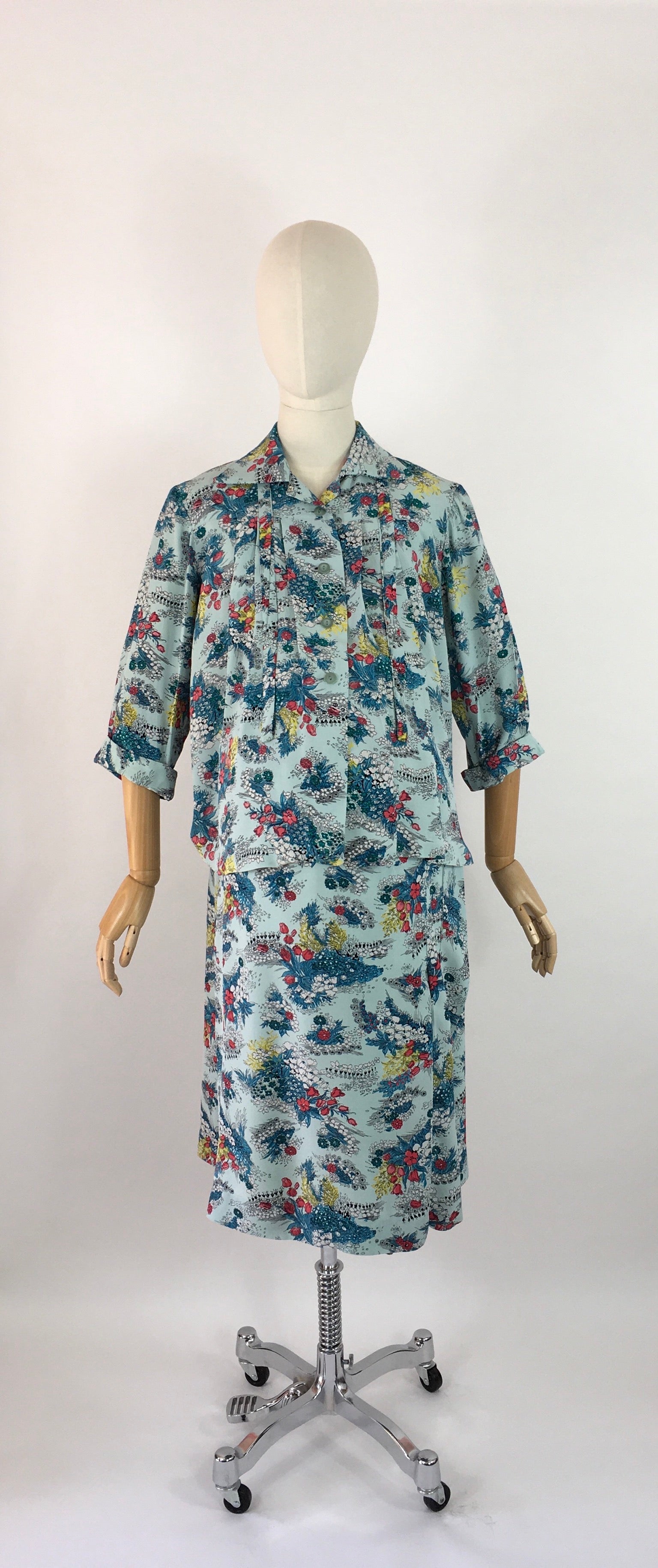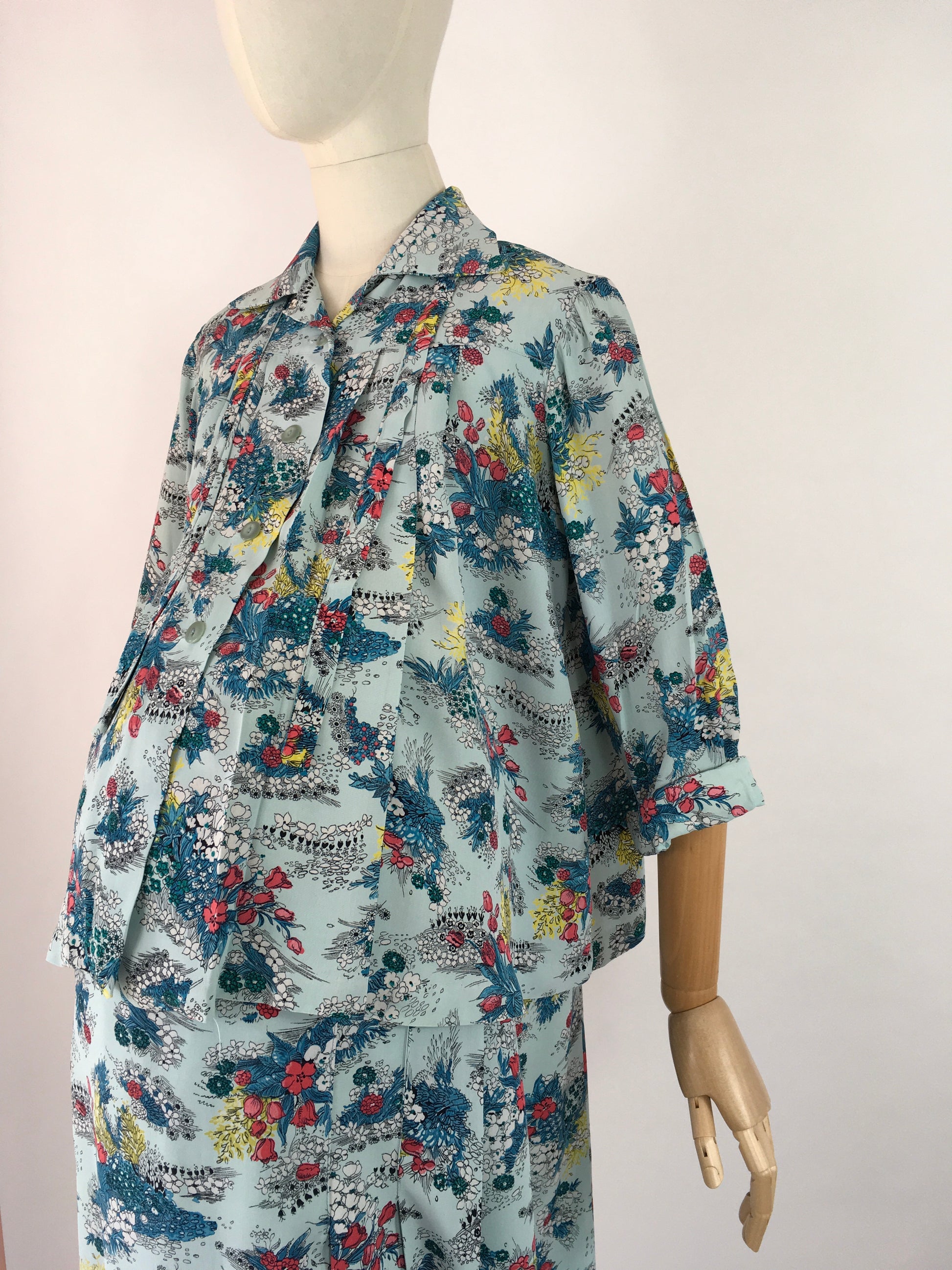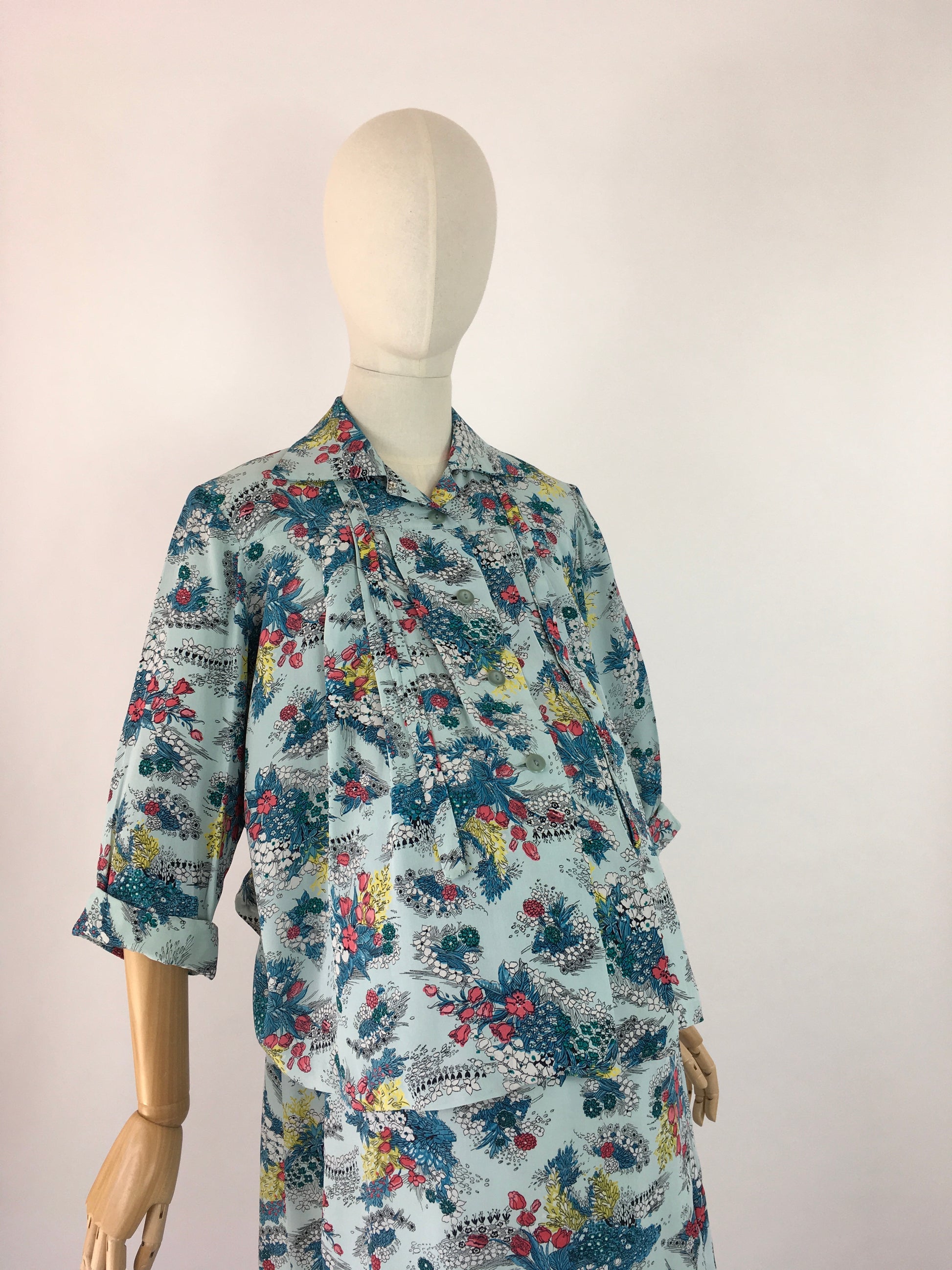 Amazing vintage 1940s Maternity 2 pc Suit made from a stunning floral print rayon in a lovely duck egg blue with reds, yellows and greens with a stencilled black. Featuring a fabulous smock stop blouse with collar, tie to the collar, button front and long sleeves with a turn up. Very roomy and looks fabulous open as well as buttoned up. The skirt is a fascinating construction from a large piece of fabric with several press stud fastenings for varying stages of pregnancy and sizes.
