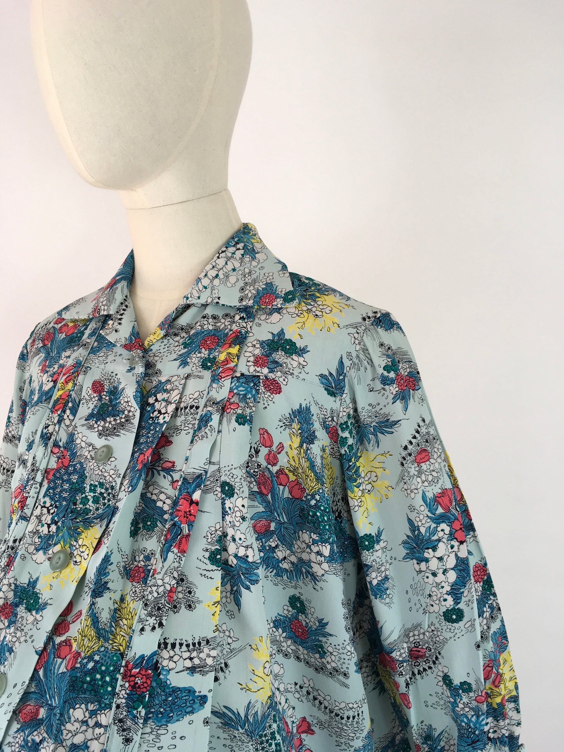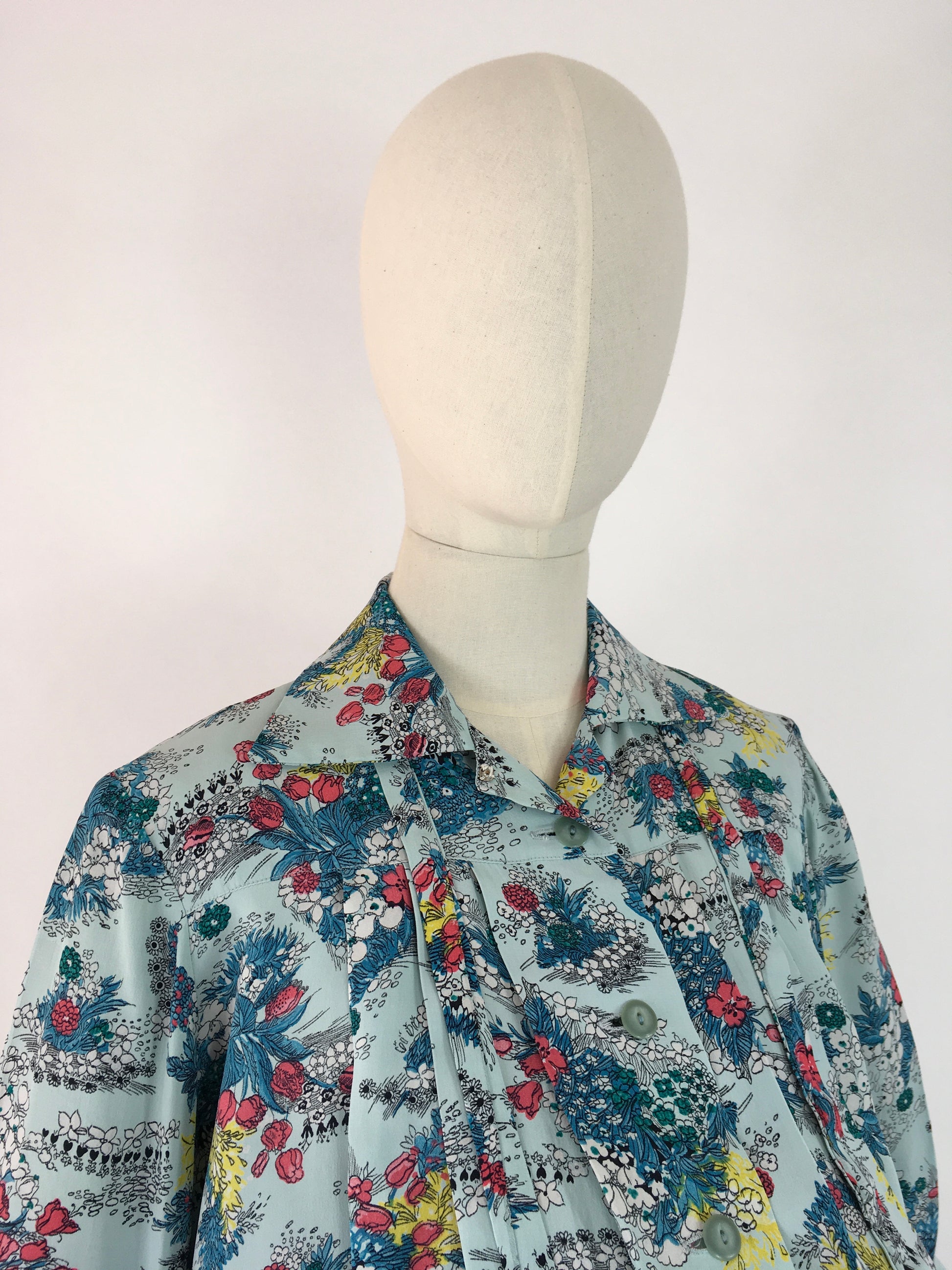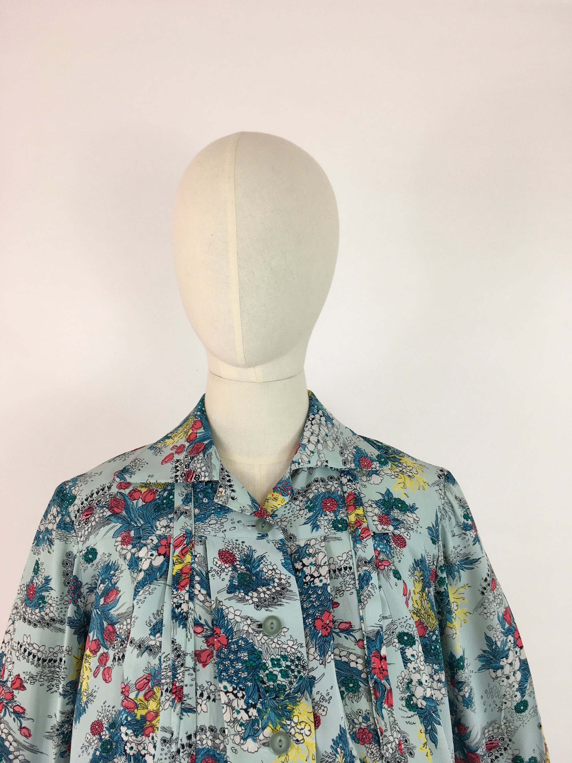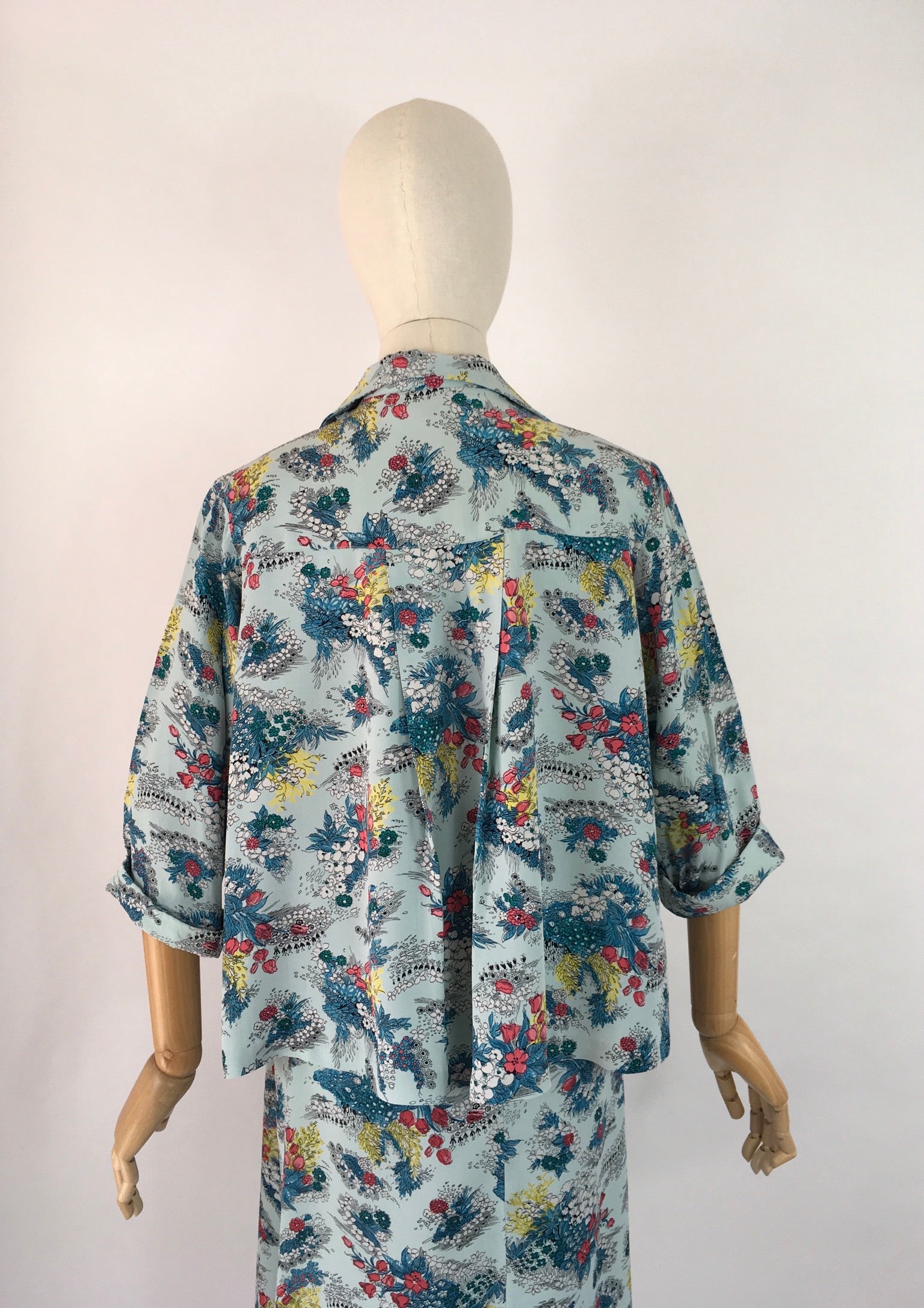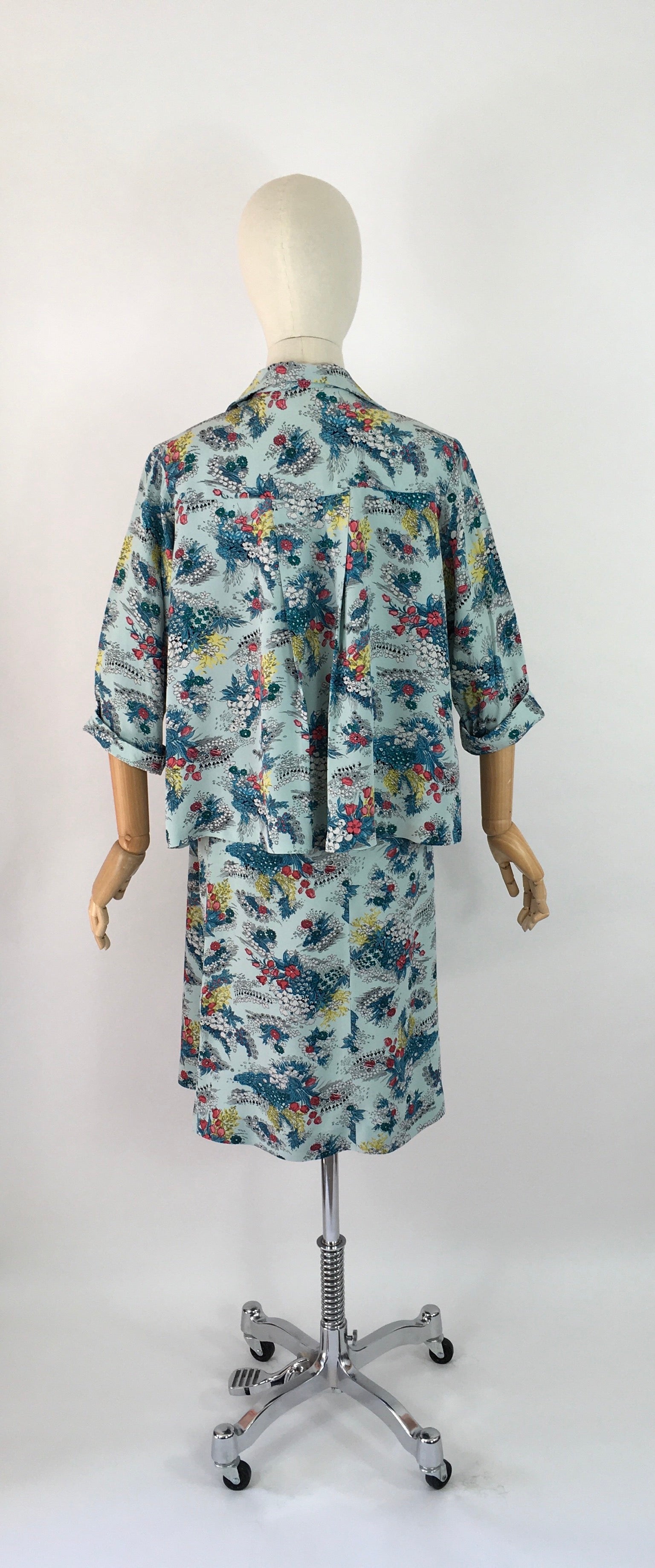 Amazing vintage 1940s Maternity 2 pc Suit made from a stunning floral print rayon in a lovely duck egg blue with reds, yellows and greens with a stencilled black. Featuring a fabulous smock stop blouse with collar, tie to the collar, button front and long sleeves with a turn up. Very roomy and looks fabulous open as well as buttoned up. The skirt is a fascinating construction from a large piece of fabric with several press stud fastenings for varying stages of pregnancy and sizes.