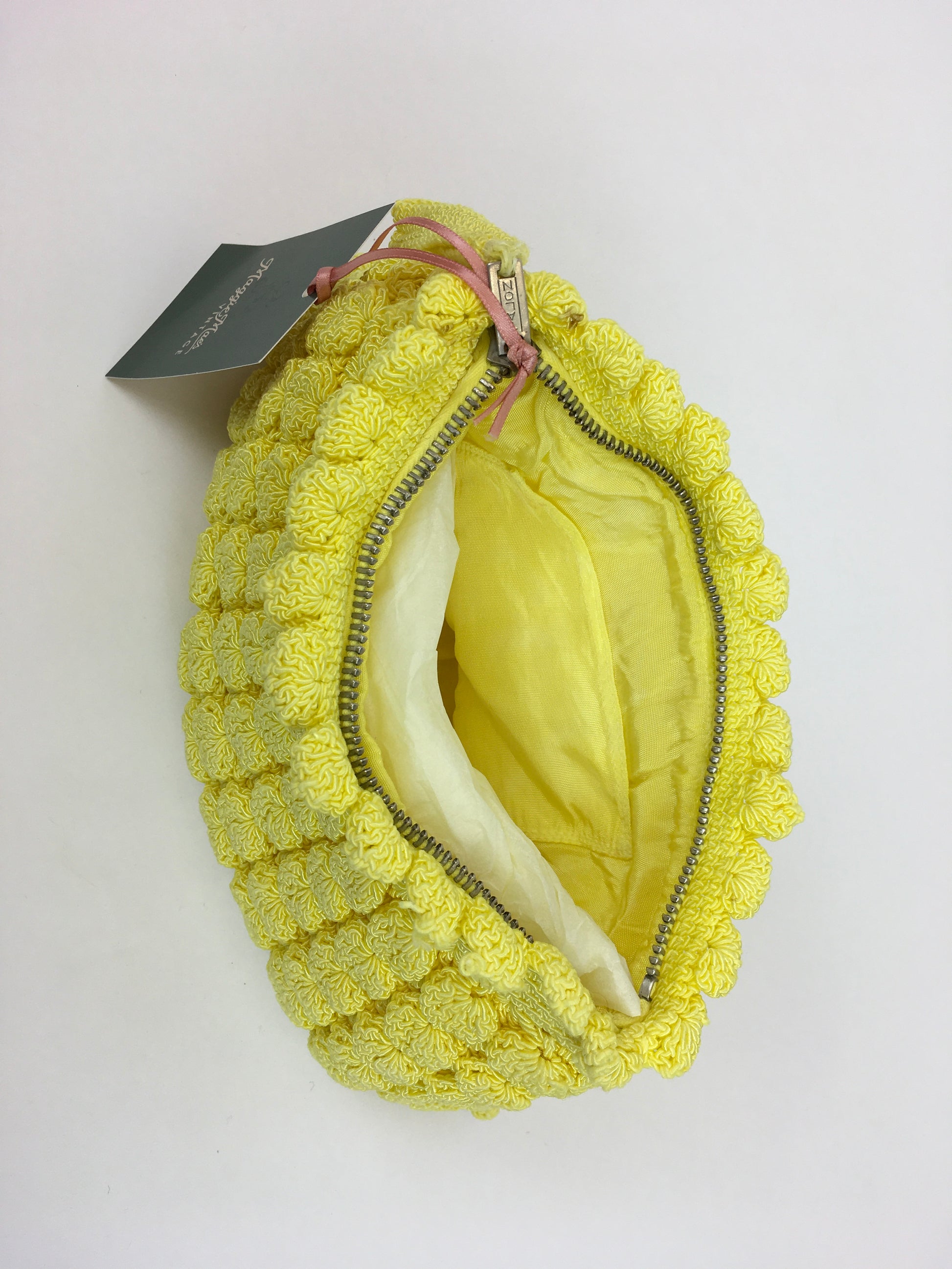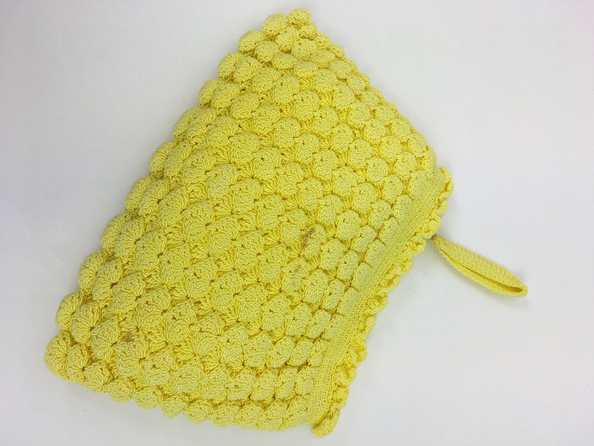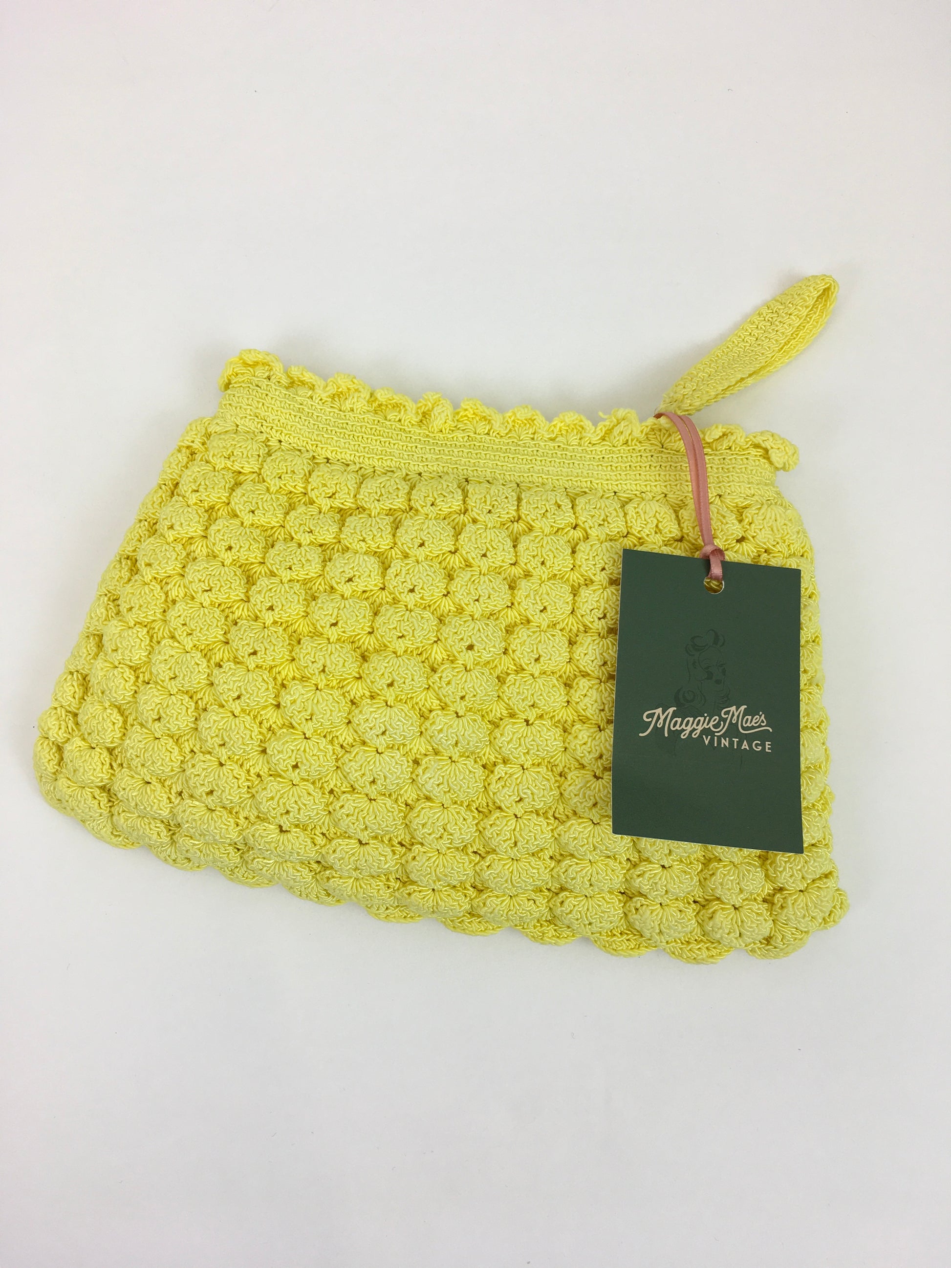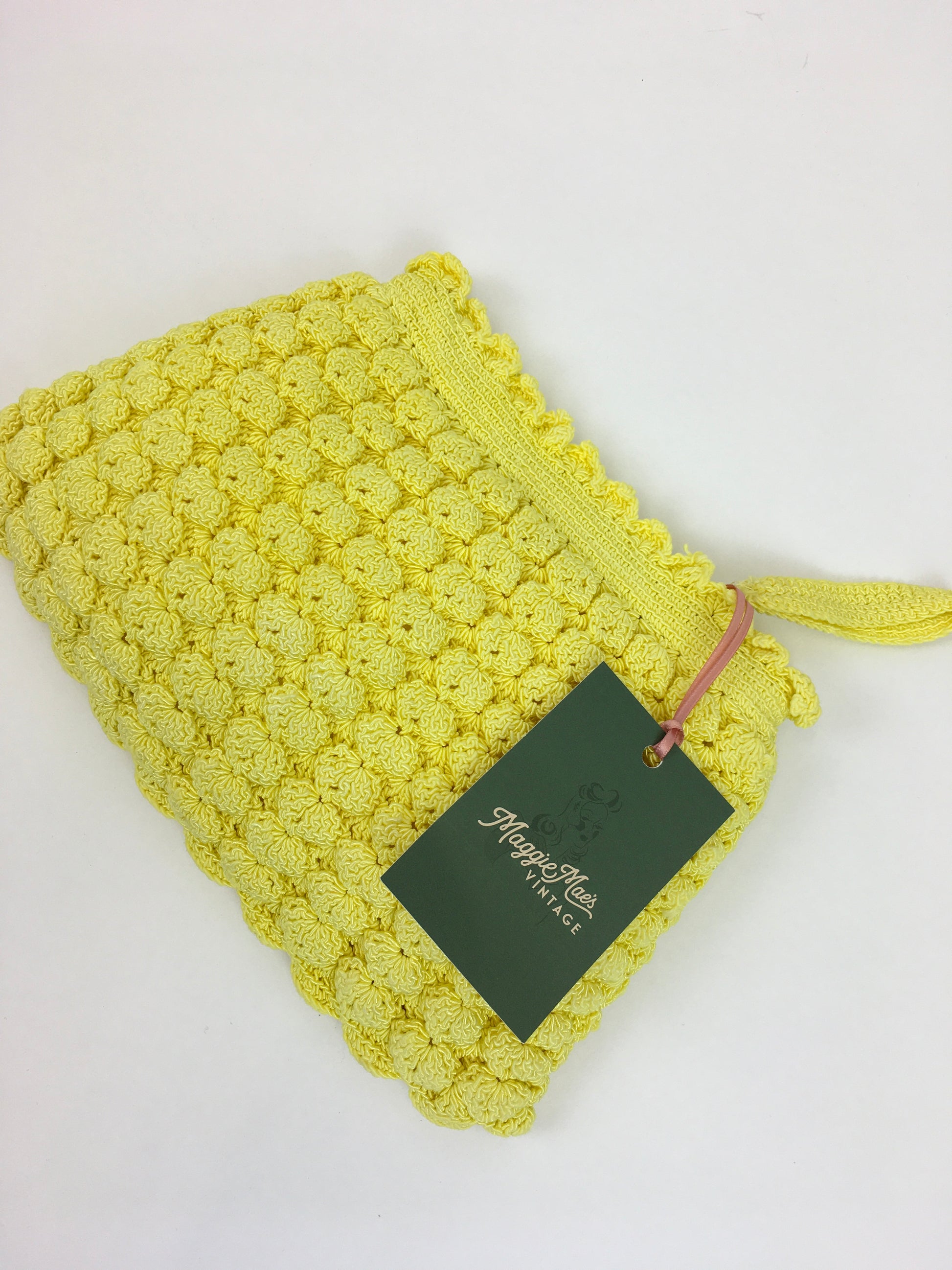 Vintage 1940s STUNNING yellow popcorn knit handbag. Such a fun piece and in such an amazing colour which is so difficult to find. Measuring 10’ x 7’ this is a great piece for both day and evening occasions and big enough to fit in a modern day phone, lipstick and other essentials.