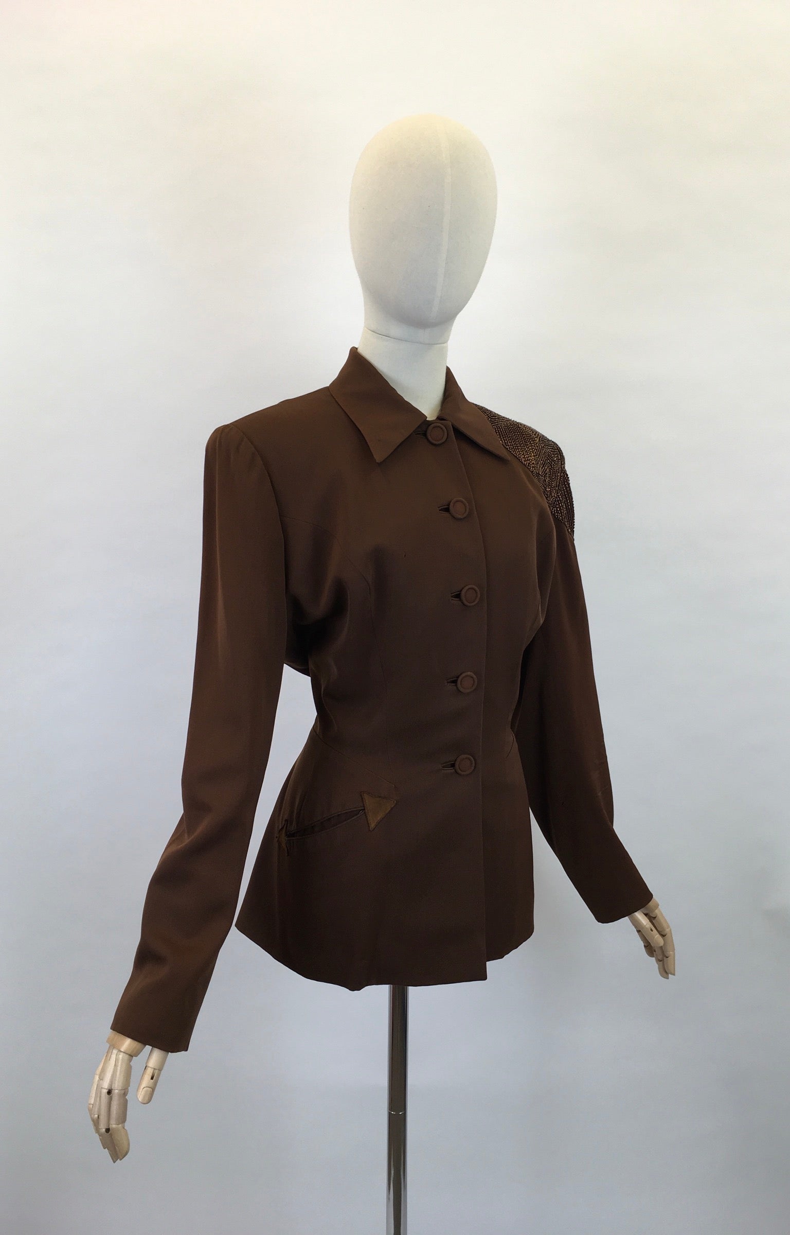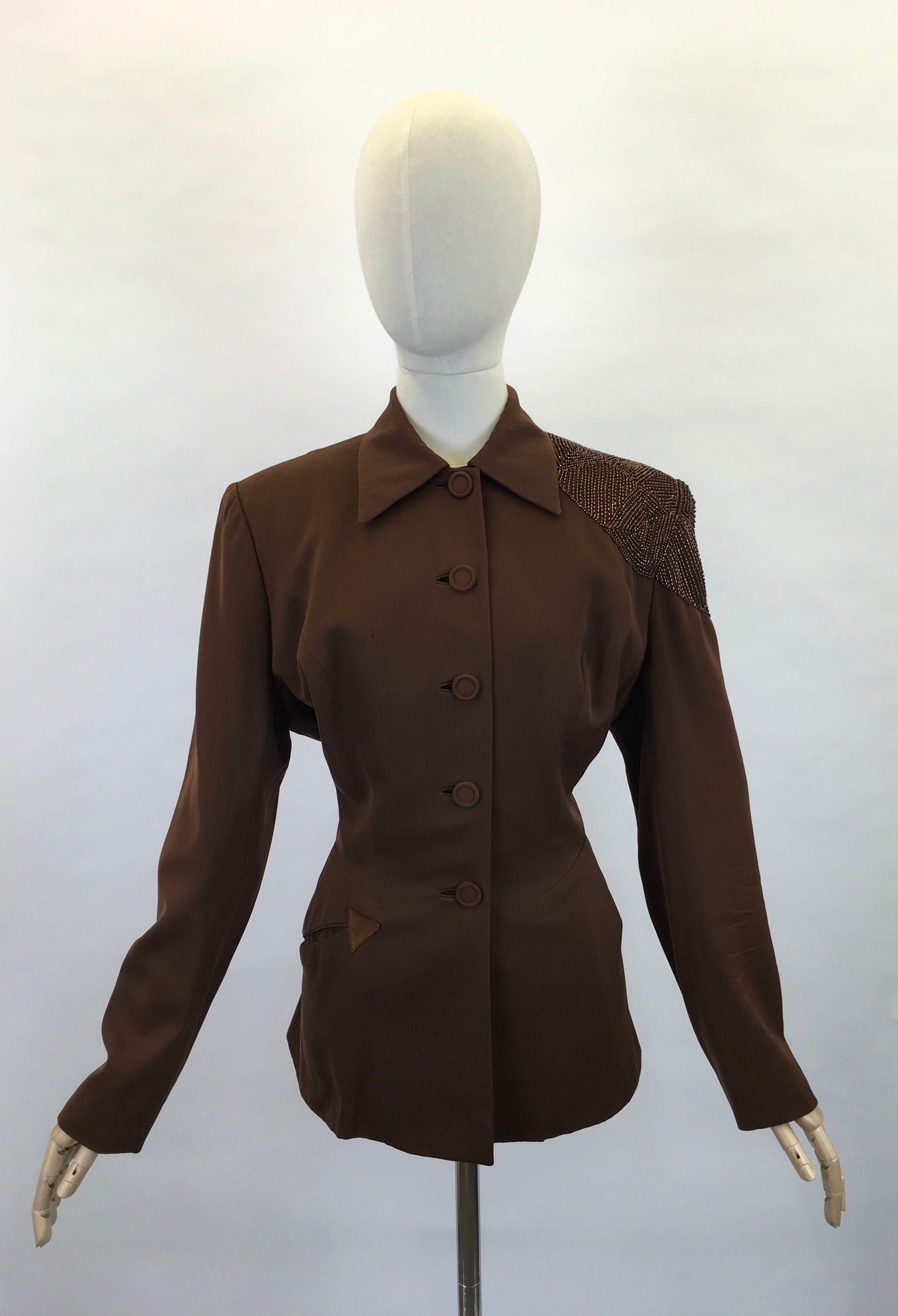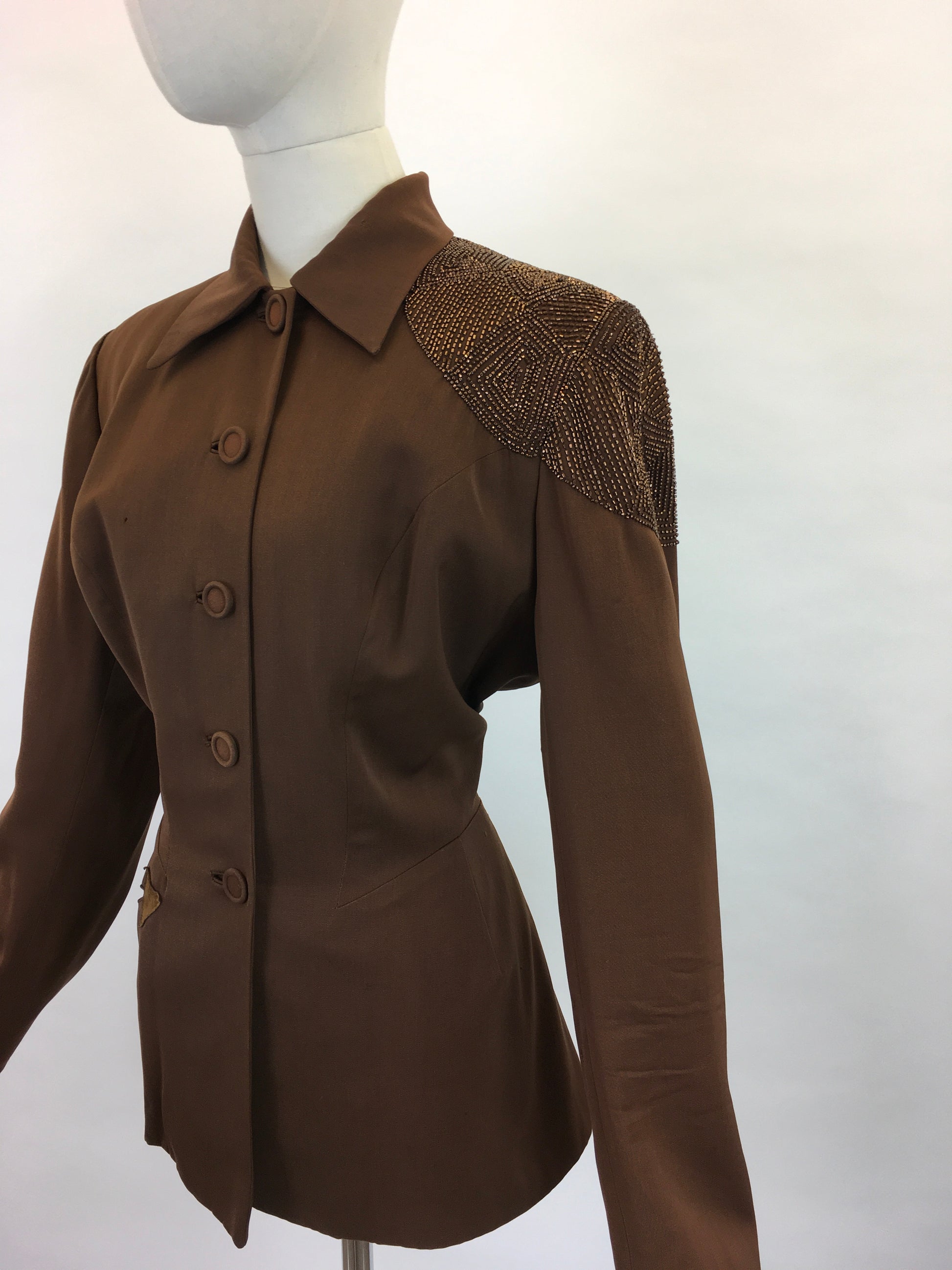 Vintage 1940s FAB ‘ Fred A Block’ stunning brown jacket. Featuring strong shoulder pads, long sleeve, self covered button front, amazing shaped pointed collar and sensational beaded bronze detailing to the shoulder. The jacket features arrow detailing to the edge of the pocket. Not without its flaws ( see condition report below) but this piece is a sensation and still has lots of life left in her.