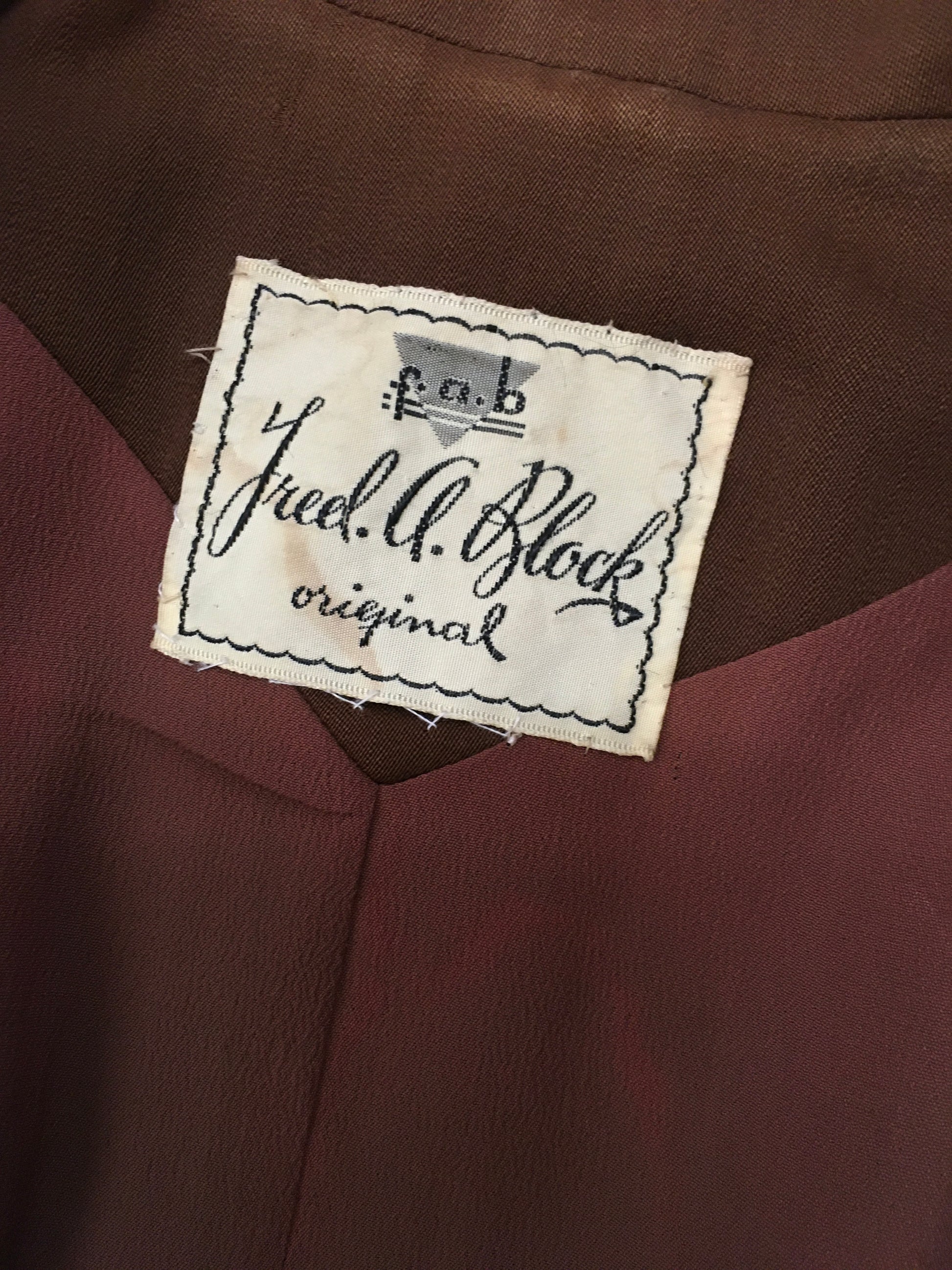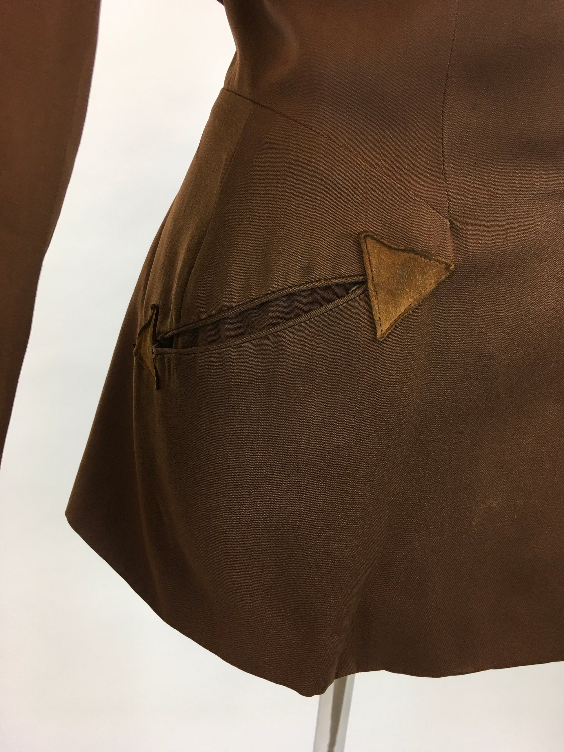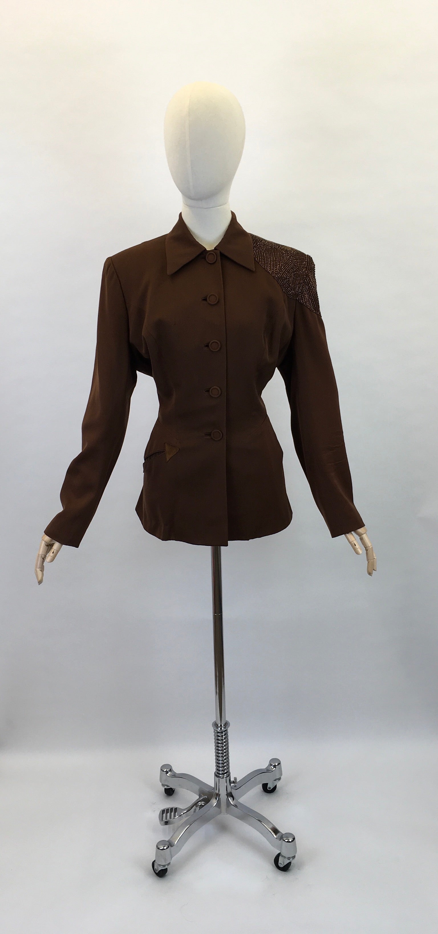 Vintage 1940s FAB ‘ Fred A Block’ stunning brown jacket. Featuring strong shoulder pads, long sleeve, self covered button front, amazing shaped pointed collar and sensational beaded bronze detailing to the shoulder. The jacket features arrow detailing to the edge of the pocket. Not without its flaws ( see condition report below) but this piece is a sensation and still has lots of life left in her.