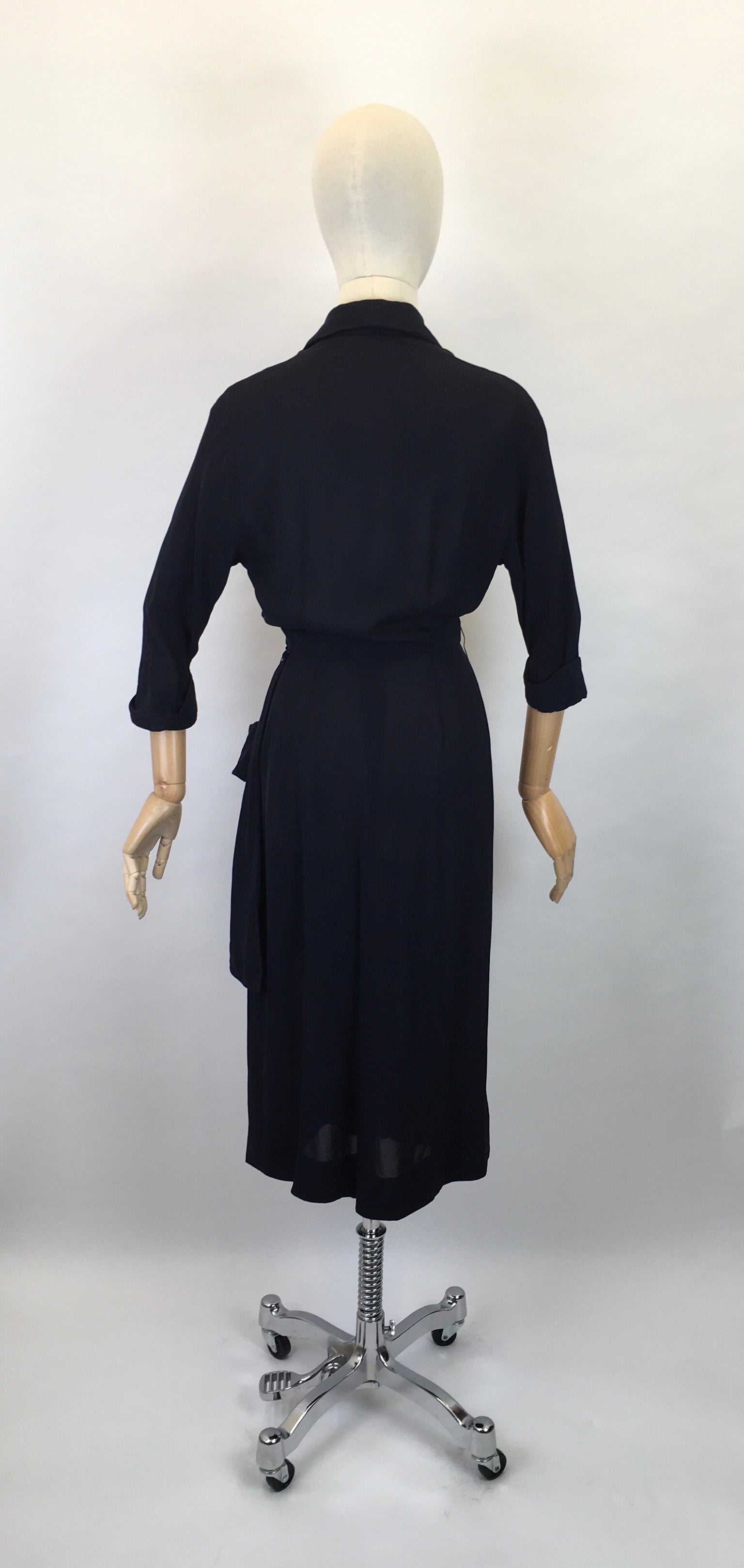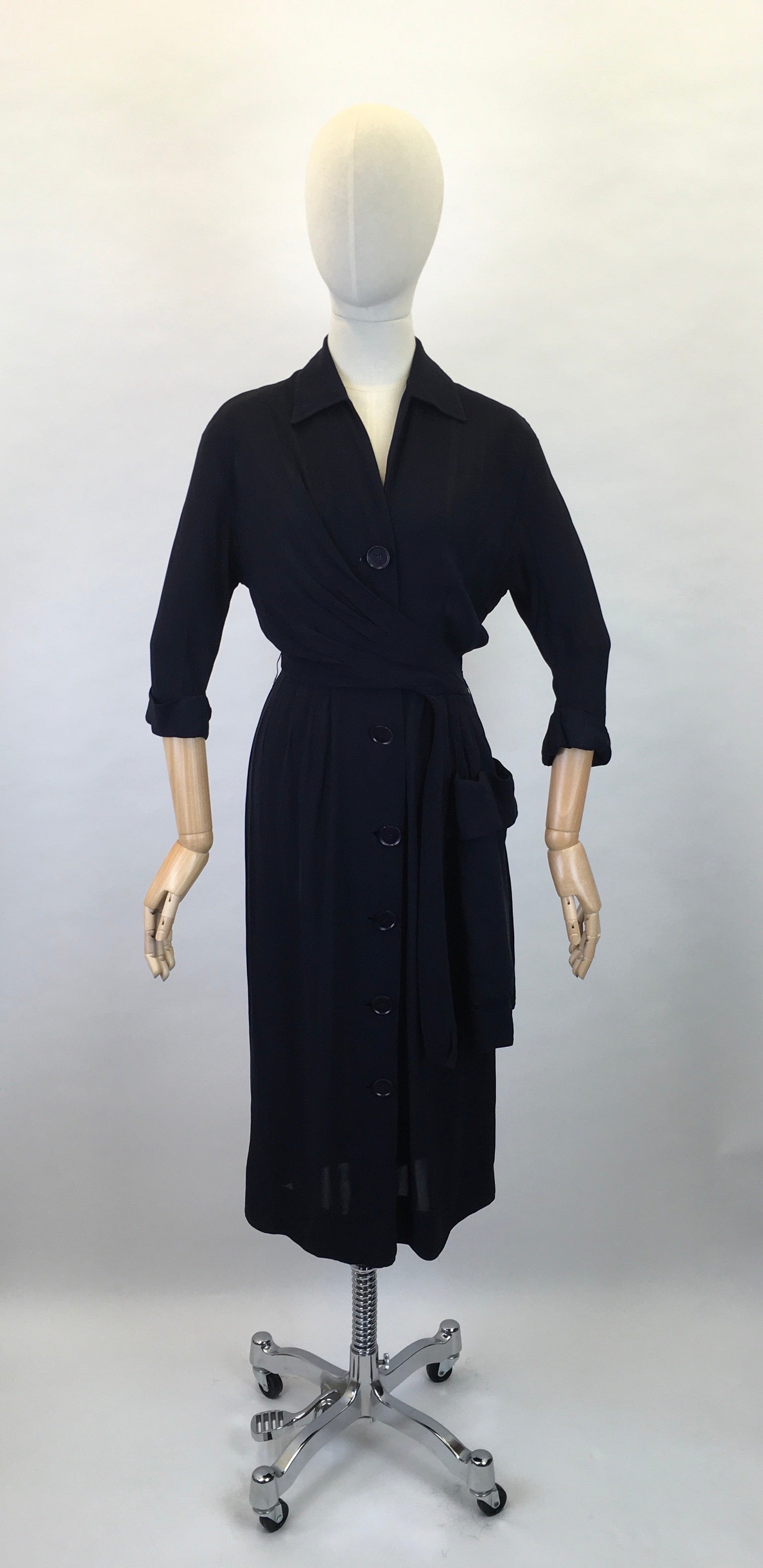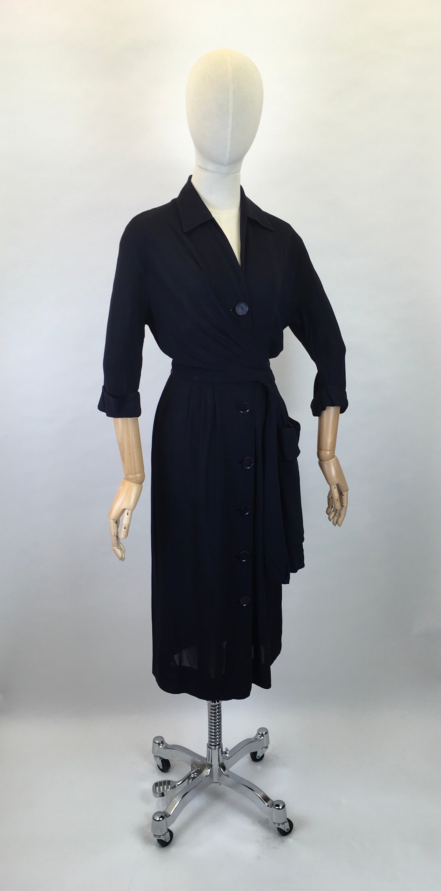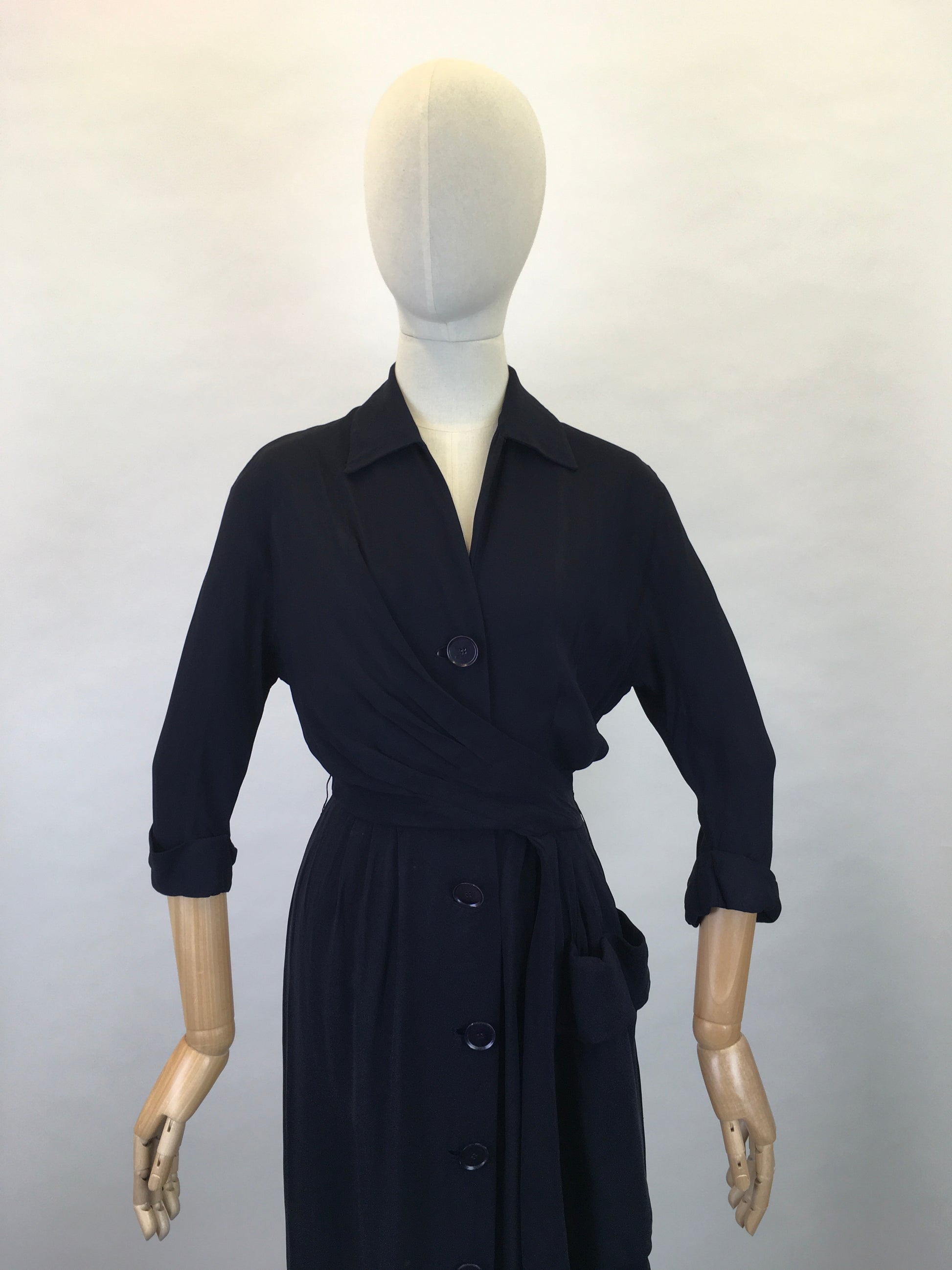 Vintage 1940’s stunning Navy dress made by Couture Designer ‘ Herbert Sondheim ‘ New York. Created in an effortlessly chic sheer rayon in Navy. Oozing appeal and effortless style with its seamless silhouette featuring long sleeve, button front with an almost wrap like extra panel to the front which crosses over and press stud fastens creating a hip swag with pocket detailing. One of the most fabulous silhouettes we have ever seen !