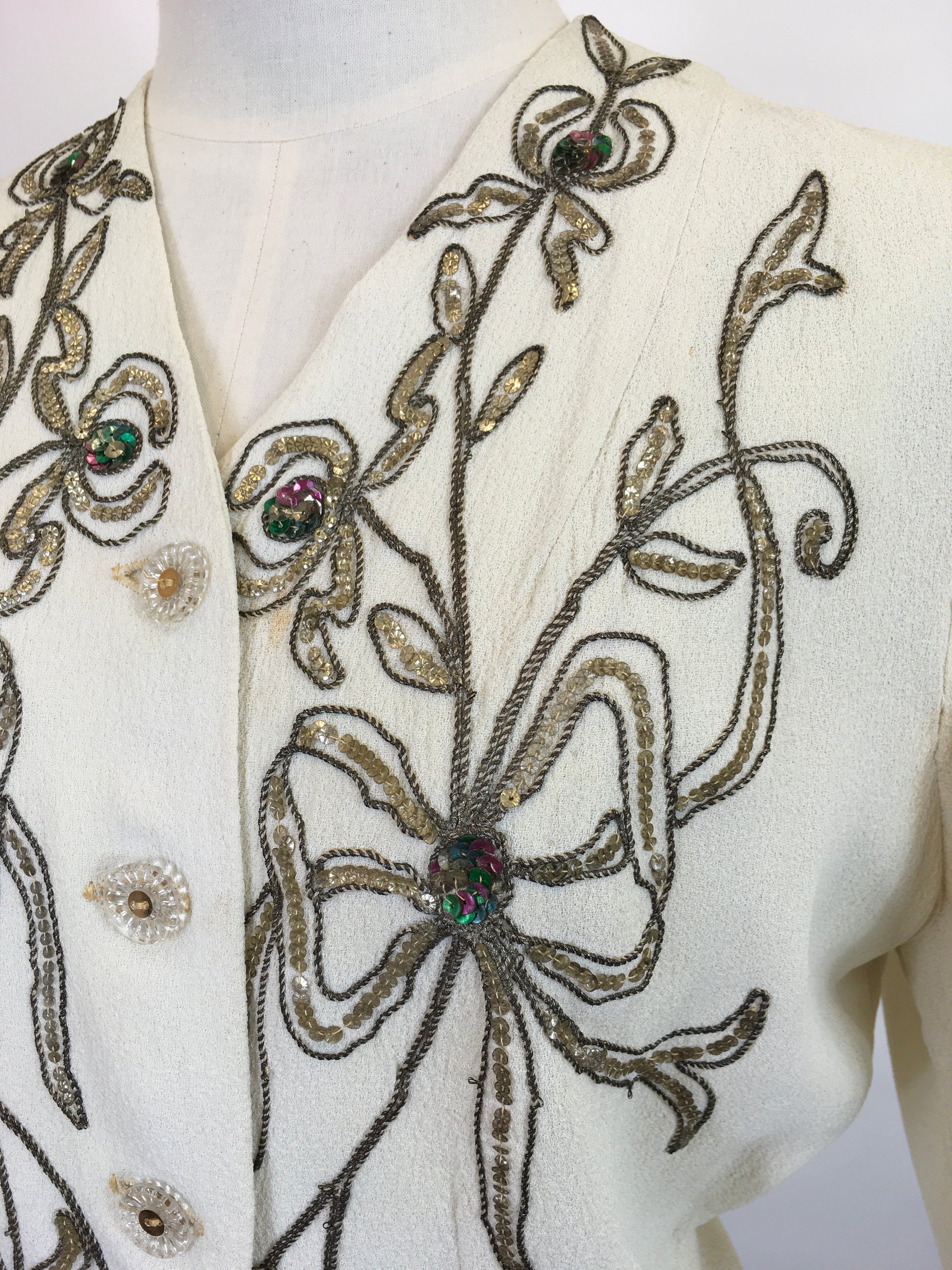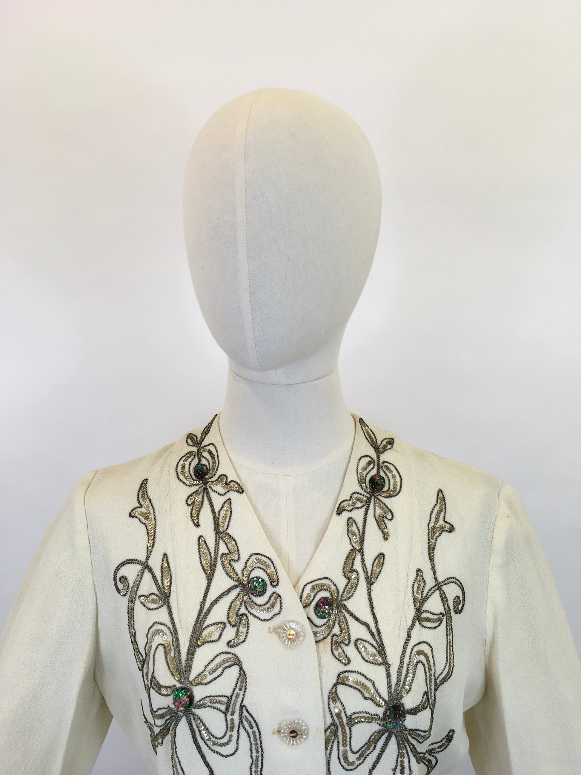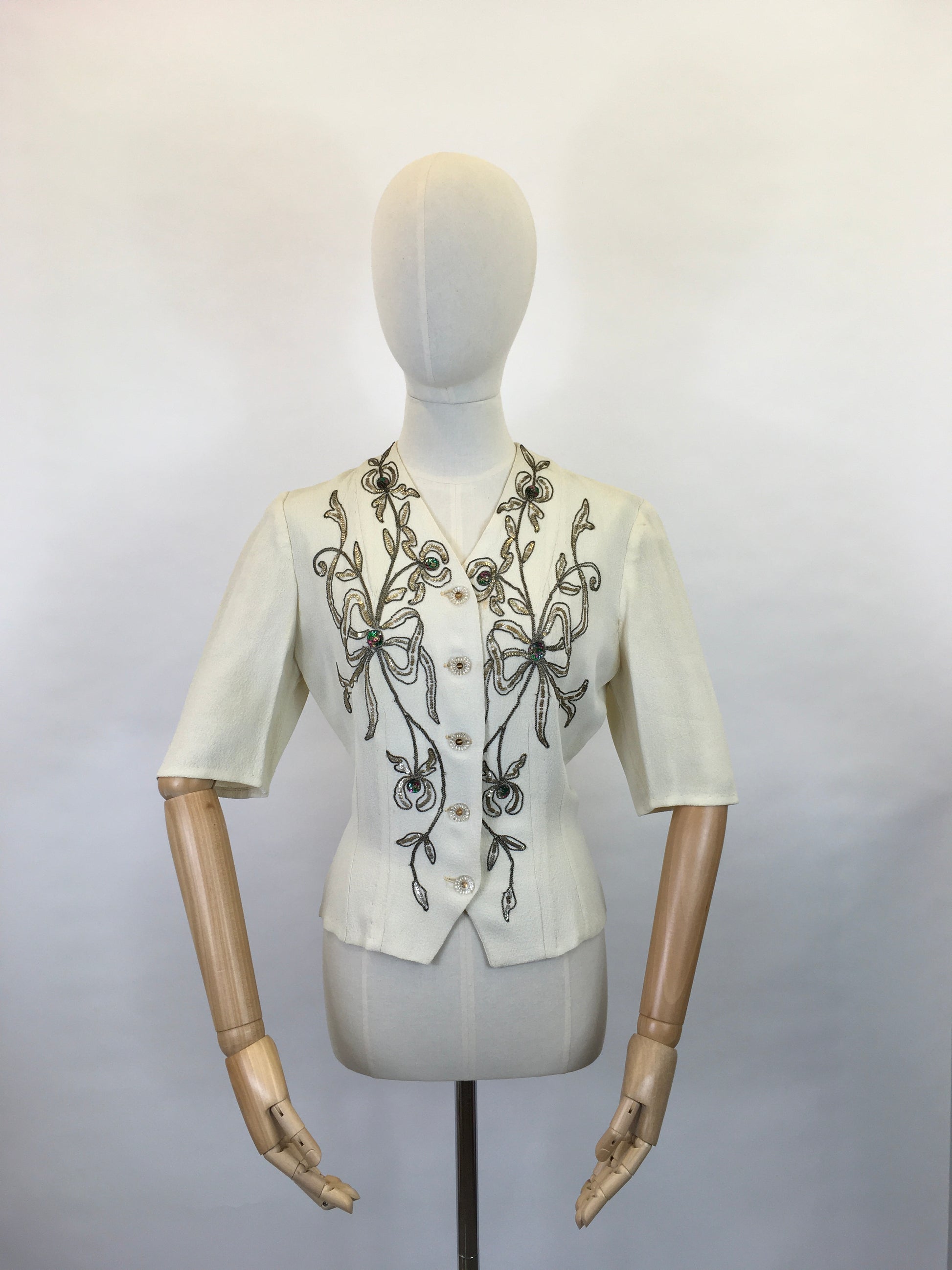 Vintage 1940’s STUNNING Ivory crepe blouse with gorgeous beaded and sequinned embellishment In swirling ribbons print. Fastens with beautiful glass shaped buttons with gold inner circle. Enhanced by a classic 40’s silhouette, this piece has a short sleeve, buttoned front which falls into a pointed hem, has back darts for a draped shaping to the waist. This piece would look stunning with a pair of wide leg evening slacks or as part of a suit ensemble.