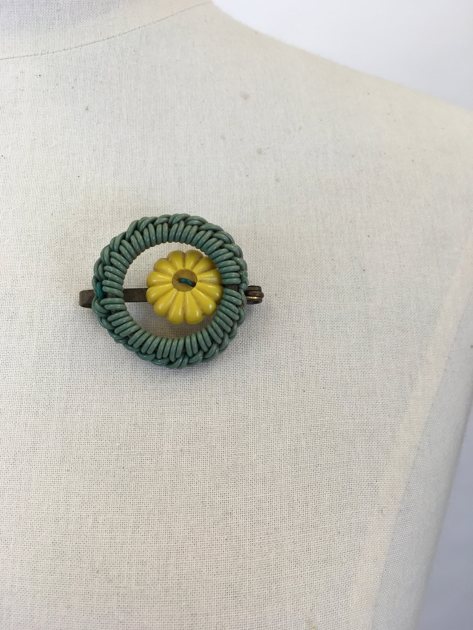Original 1940s Telephone Cord Brooch - In Soft Green with a Sunshine Yellow Button Detailing