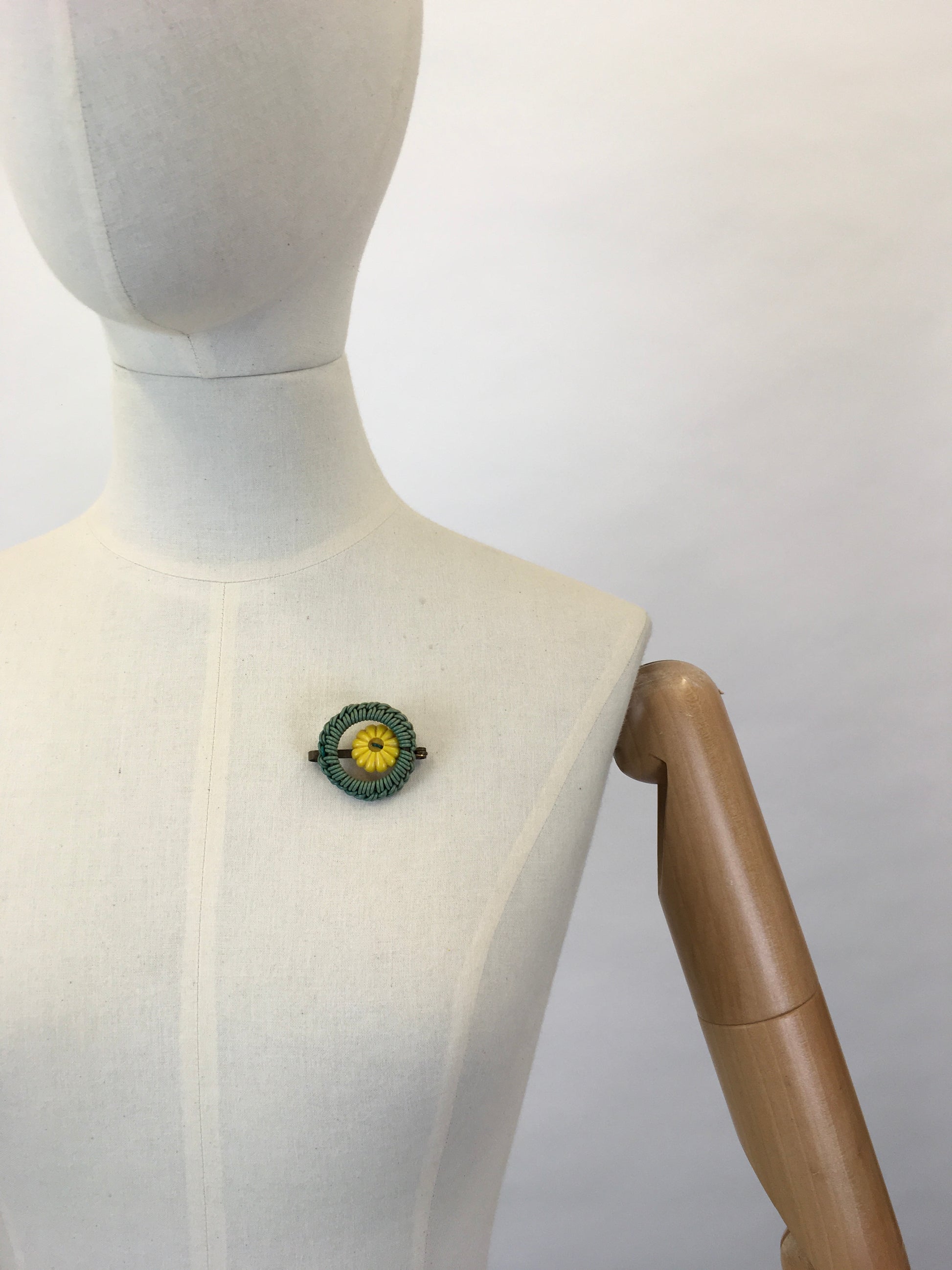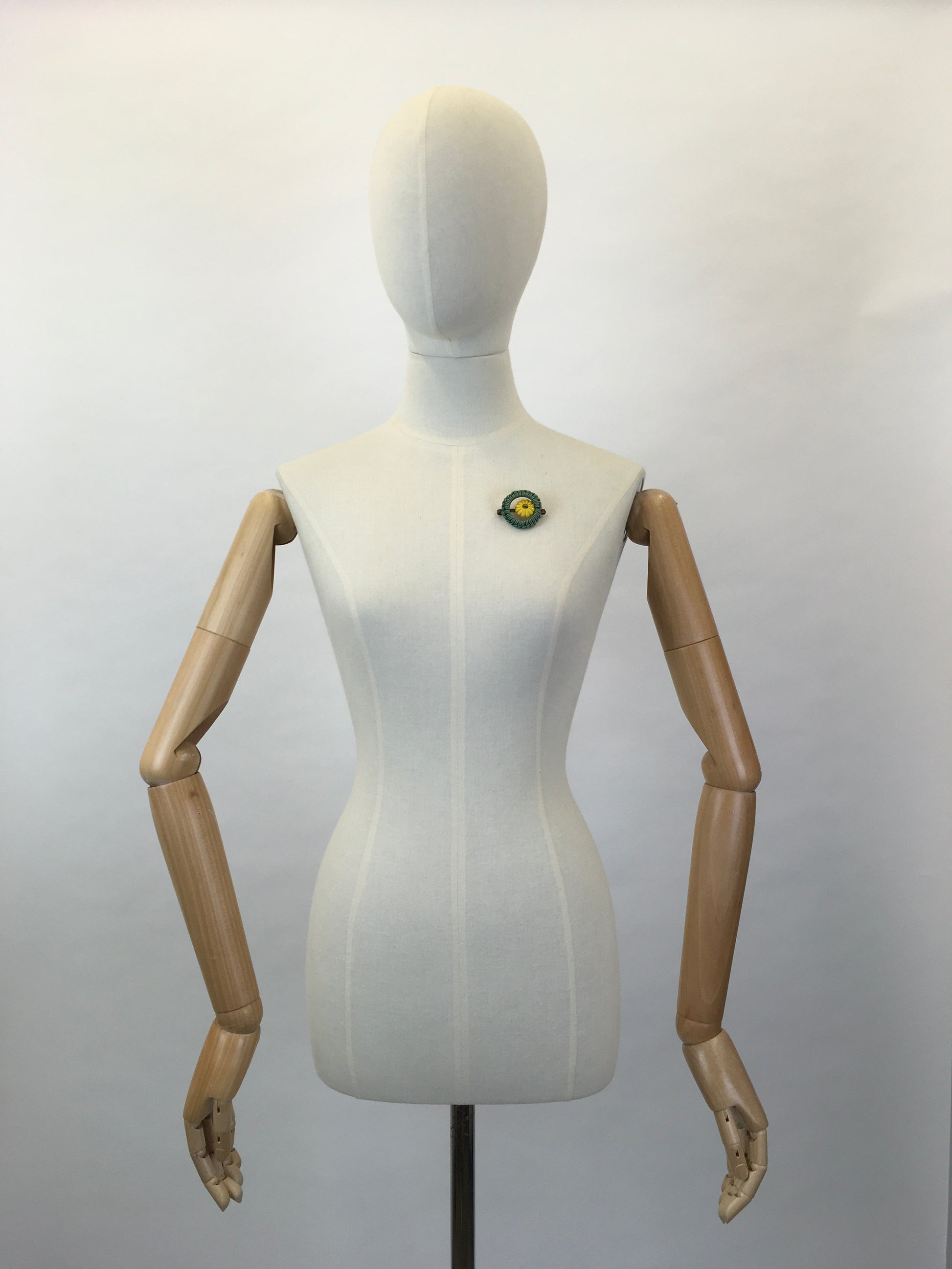 Vintage 1940s telephone cord brooch in a lovely soft green with yellow button detailing. The back pin is in great condition. Measuring 1.5’ x 1.5’ this is a lovely statement piece for a jacket, cardigan or dress. A lovely piece of nostalgia for everyday wear.