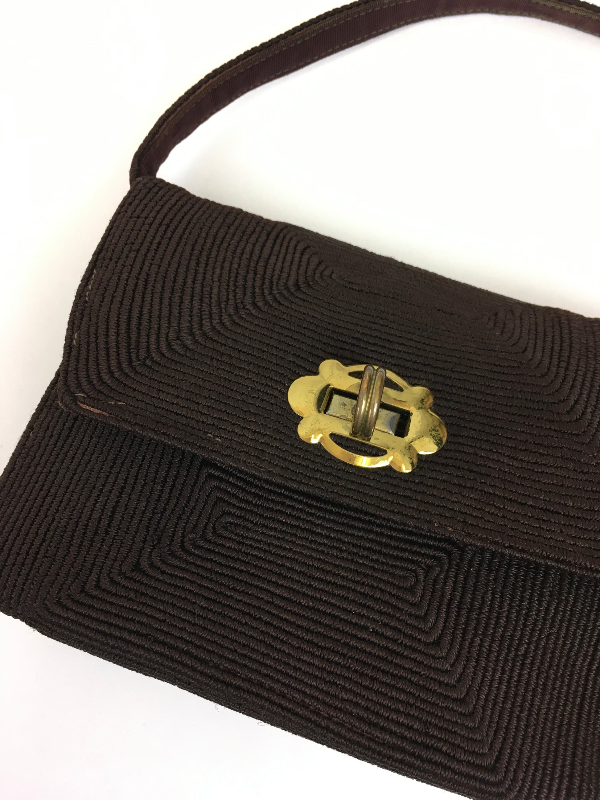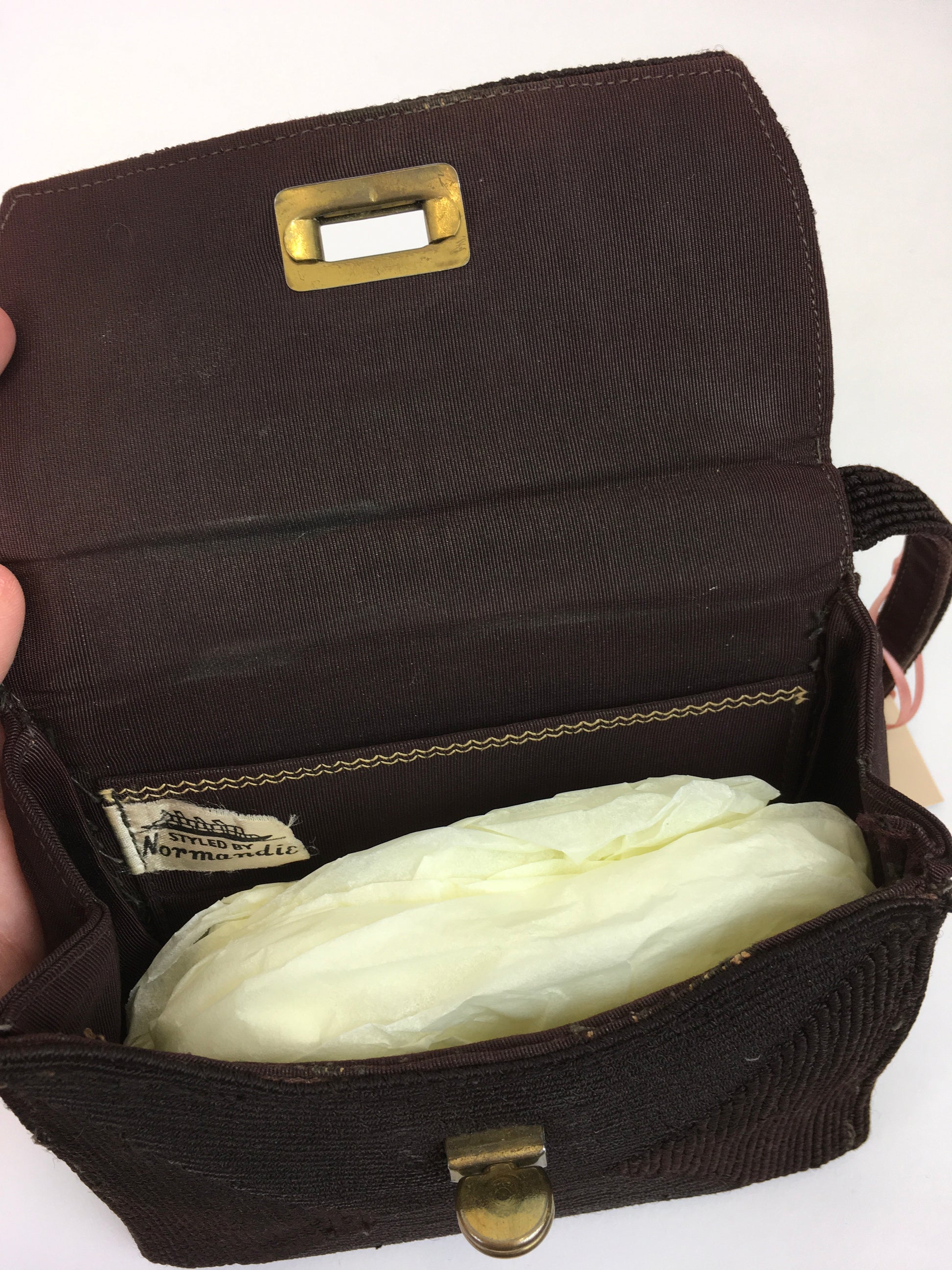 Vintage 1940s Darling little Corde warm brown handbag with a ‘ Styled by Normandic’  Label. Such a dinky little bag and great for an evening occasion. Measuring 6’ x 5’ this is a good size for a phone, lipstick and some pennies for evening cocktails. Has a small handle and brass clasp.