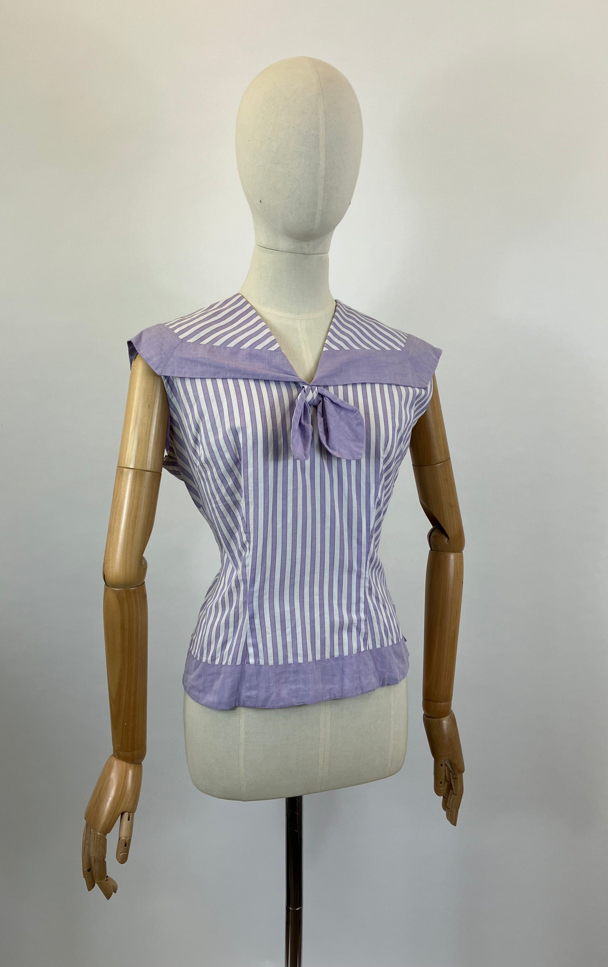 A lovely summer blouse with a large sailor type collar, necktie and it being sleeveless. Side opening buttons complement in all lilac covering. Bust darts and darts to the waist. A contrast band at the waistline to complement once again.