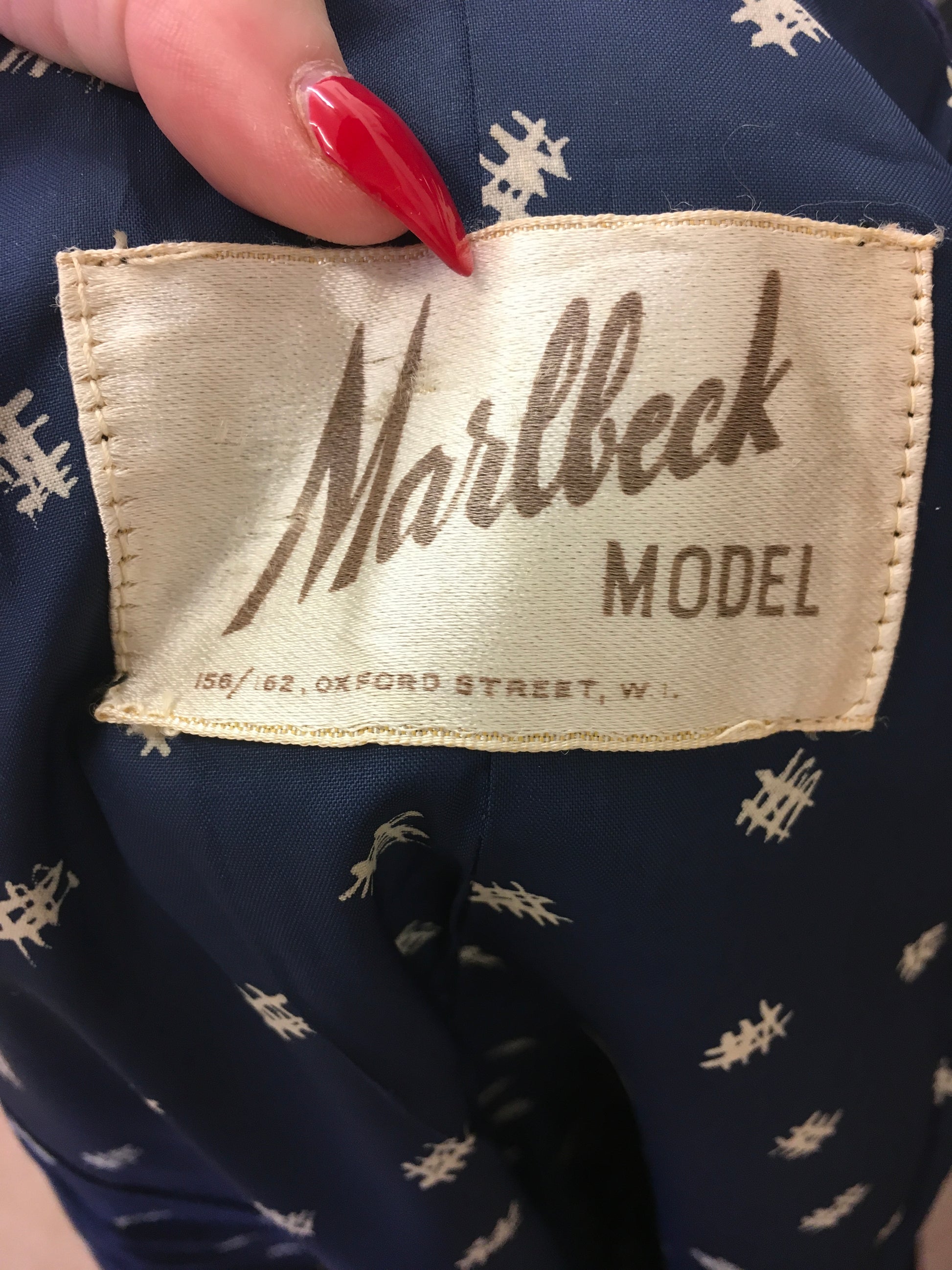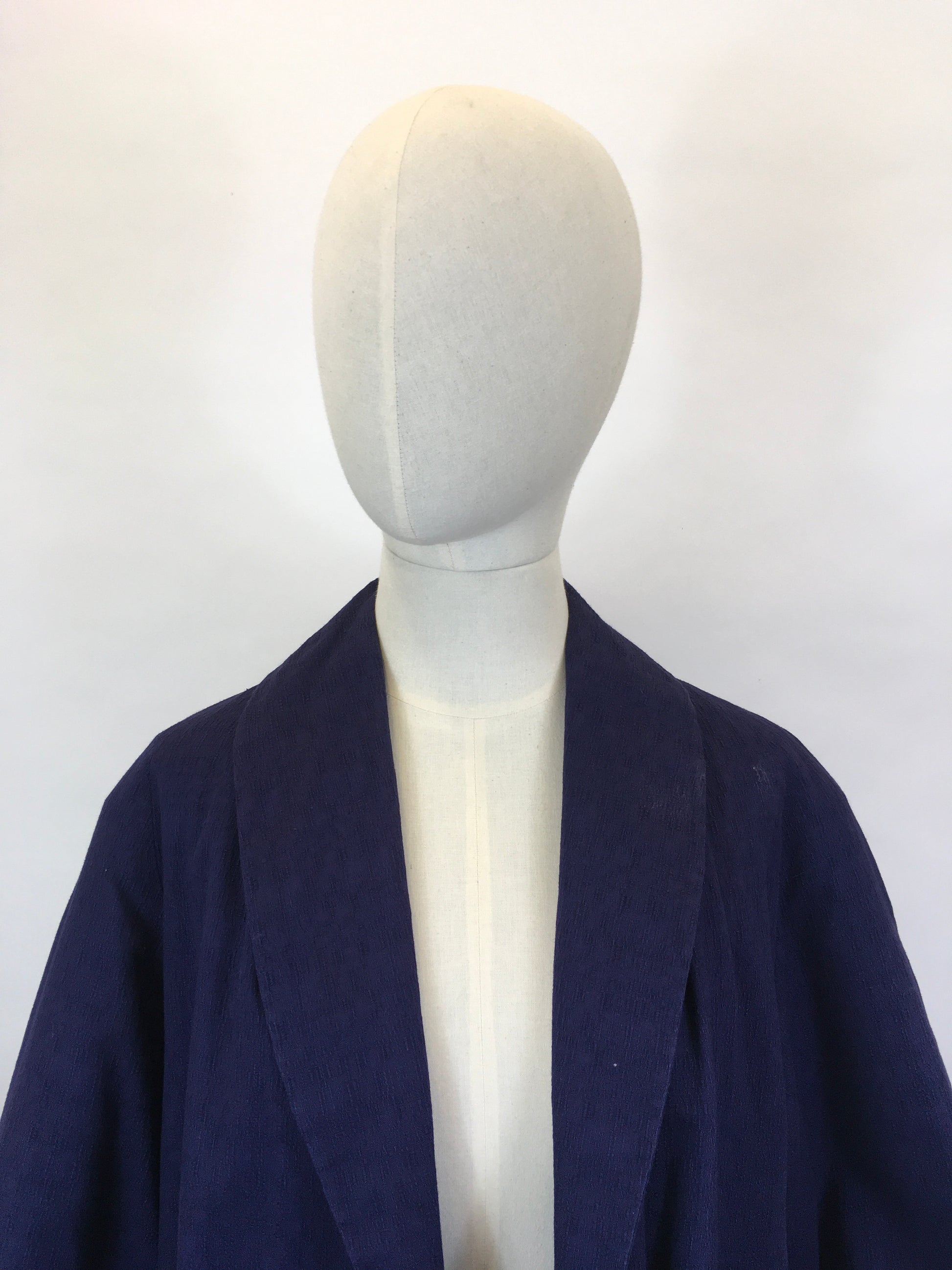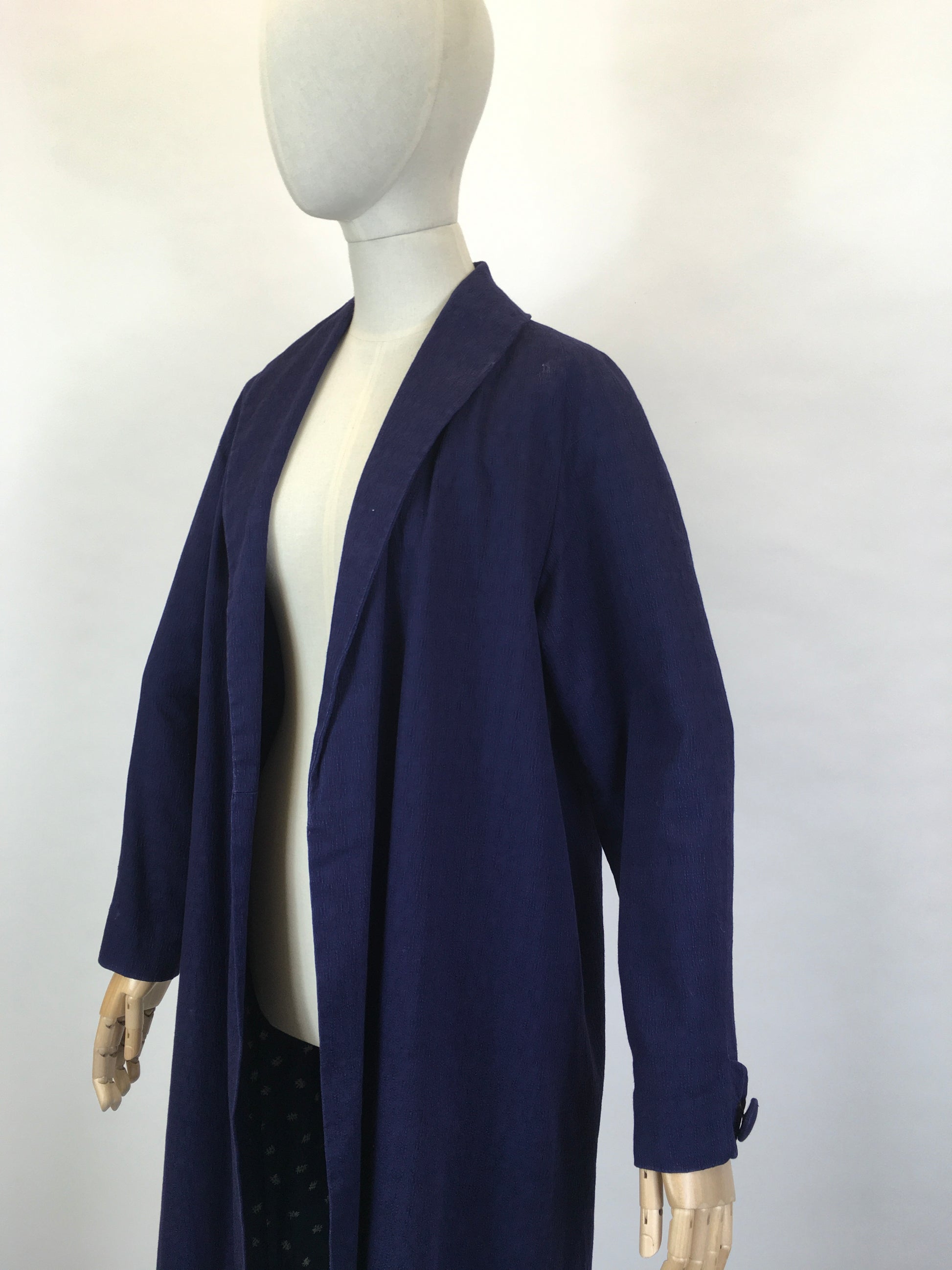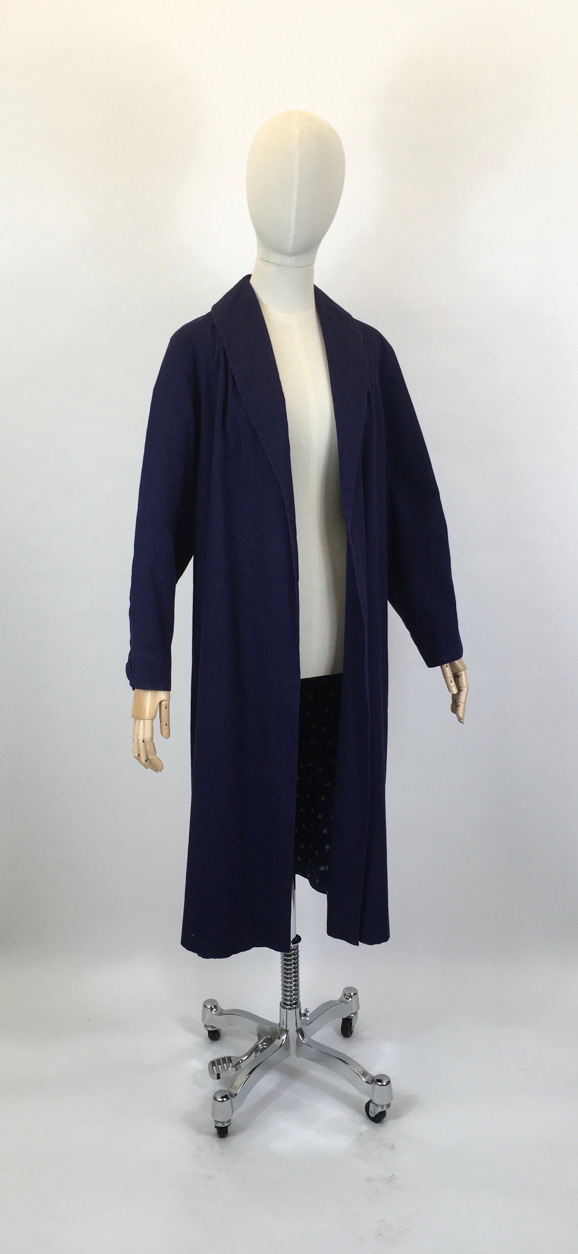 Vintage 1950’s fabulous edge to edge duster coat in a lovely midnight blue textured cloth. The coat is fully lined in a contrasting print by ‘ Marlbeck Model’. A fabulous classic 50’s lightweight coat, great for layering over blouses, knitwear and Capri pants or over the top of dresses. Great to give you the classic 50’s silhouette.