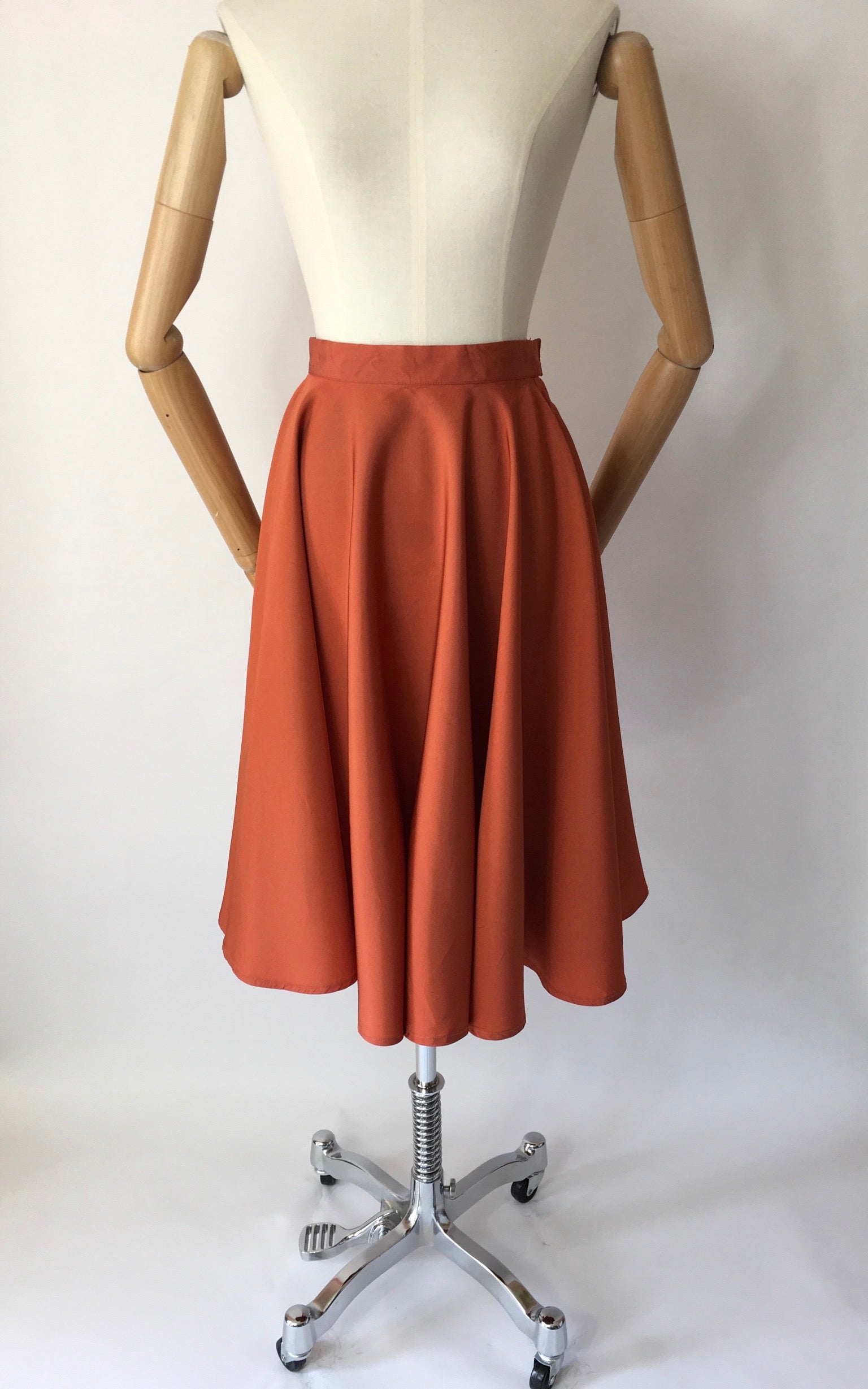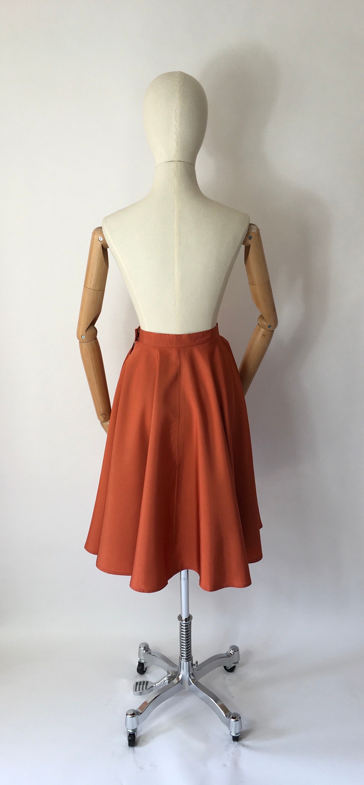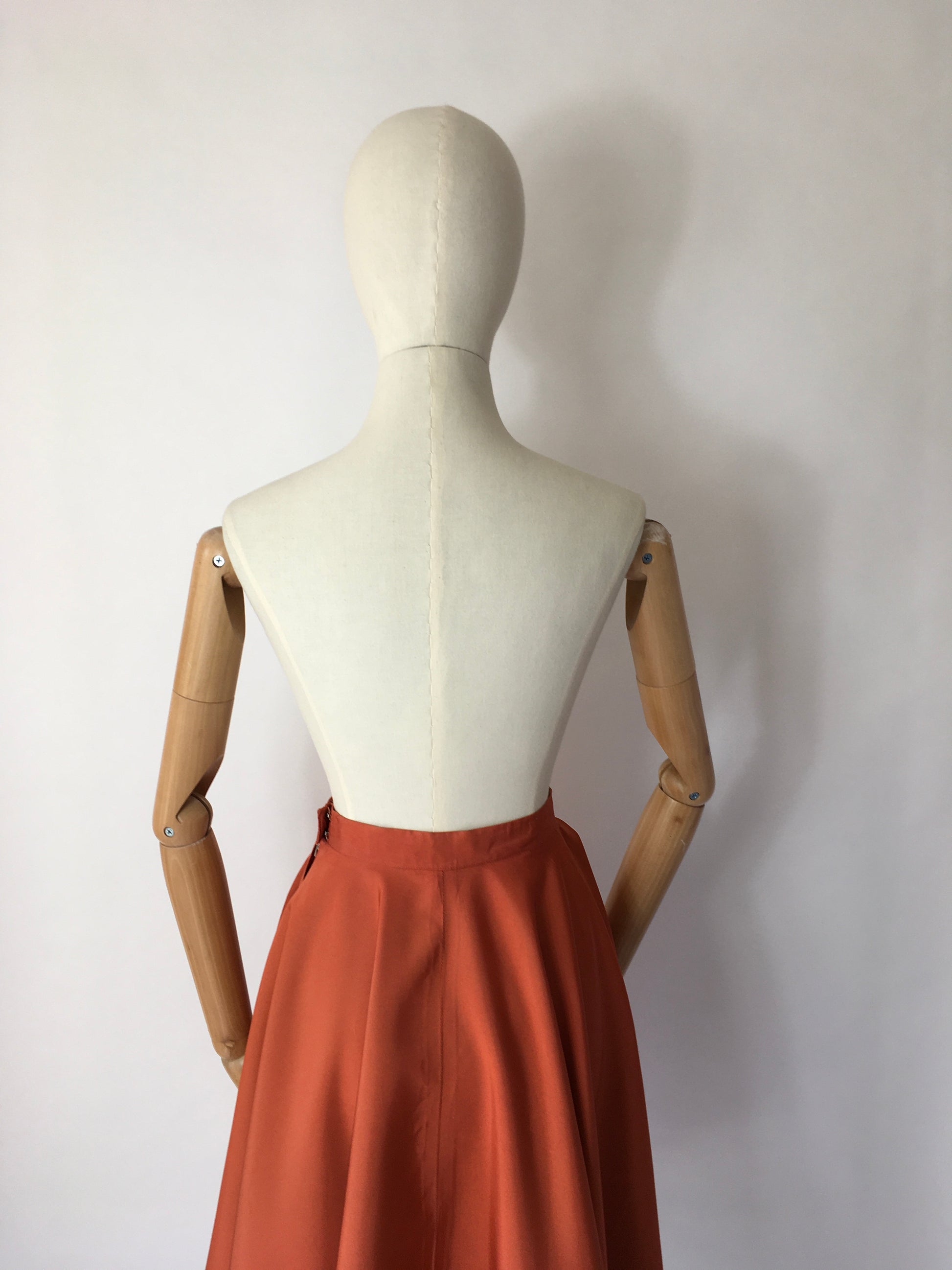 Vintage early 1950’s full circular skirt made by ‘ Fespa Fashions of London ‘. Made from a lovely rust taffeta blend this skirt has so much movement, great for dancing in. Not without her flaws as she has a mark but in very wearable condition, please see below for more details. Fastens with a lovely metal side zip and hook and eye fastening.