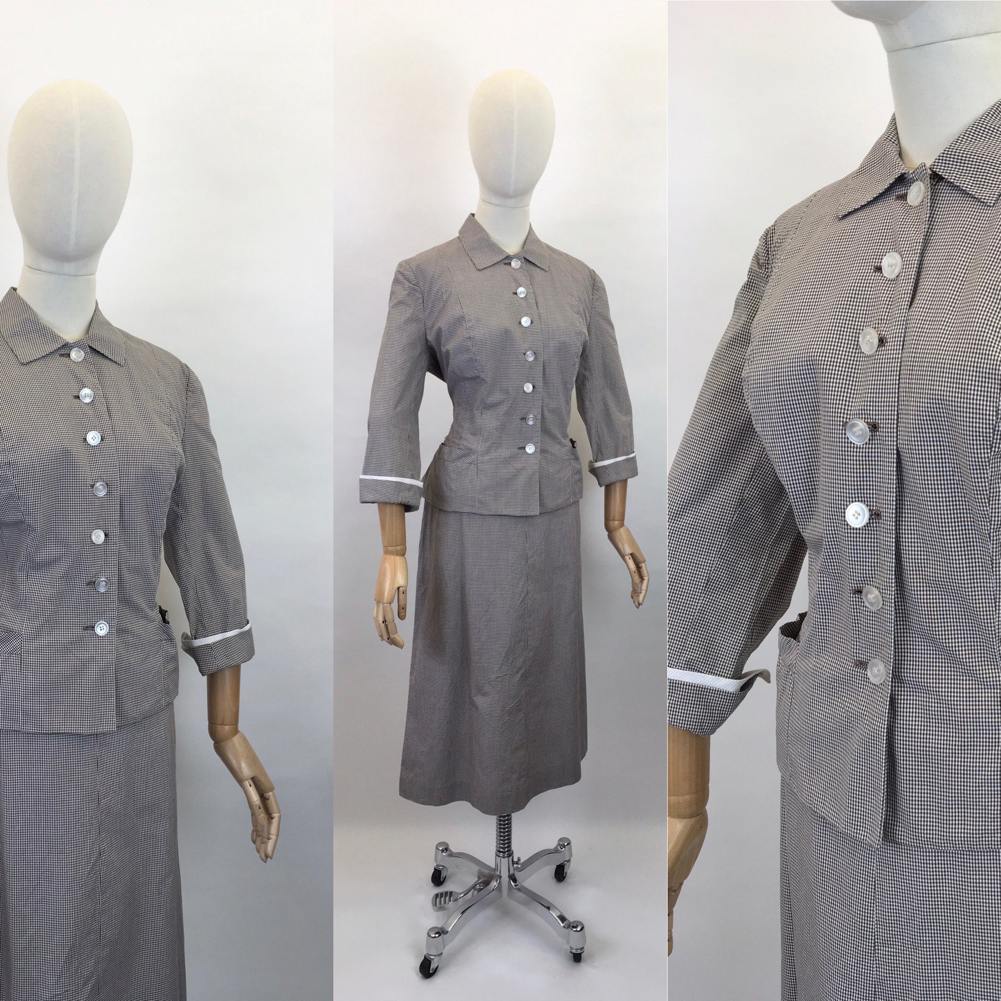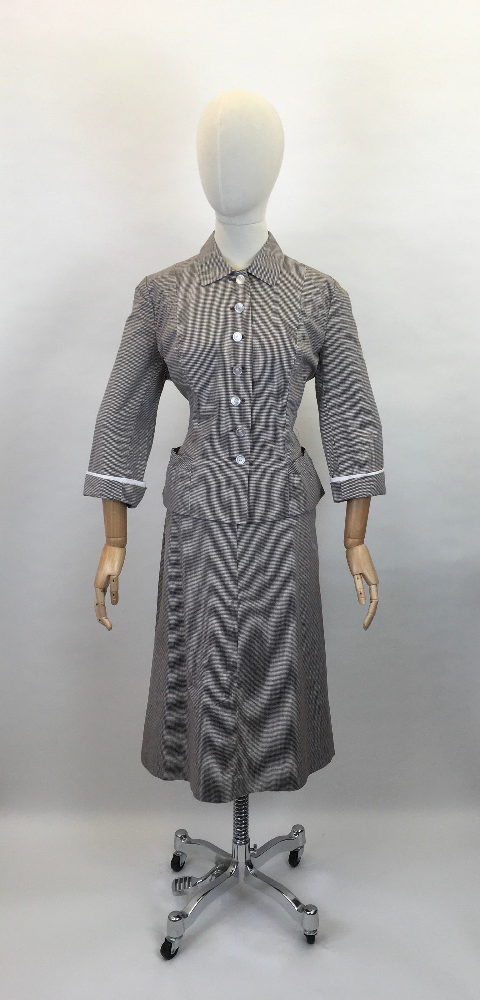Vintage 1950s 2 pc summer suit made by ‘ Glenhaven’ in a lovely brown and white check Cotton. Featuring a classic 50’s silhouette this is a great lightweight summer suit which is fabulous worn as a 2pc or equally styled with other pieces as separates. The jacket has a beautiful Peter Pan collar neckline with button front, long sleeve with turn back cuff and contrast  white panel, and a cinched in waist.  Has belt loops but missing original belt, can be worn with a contrast belt to pull it in and create the correct silhouette. The skirt is a simple a line shape with a metal side zip fastening and button.