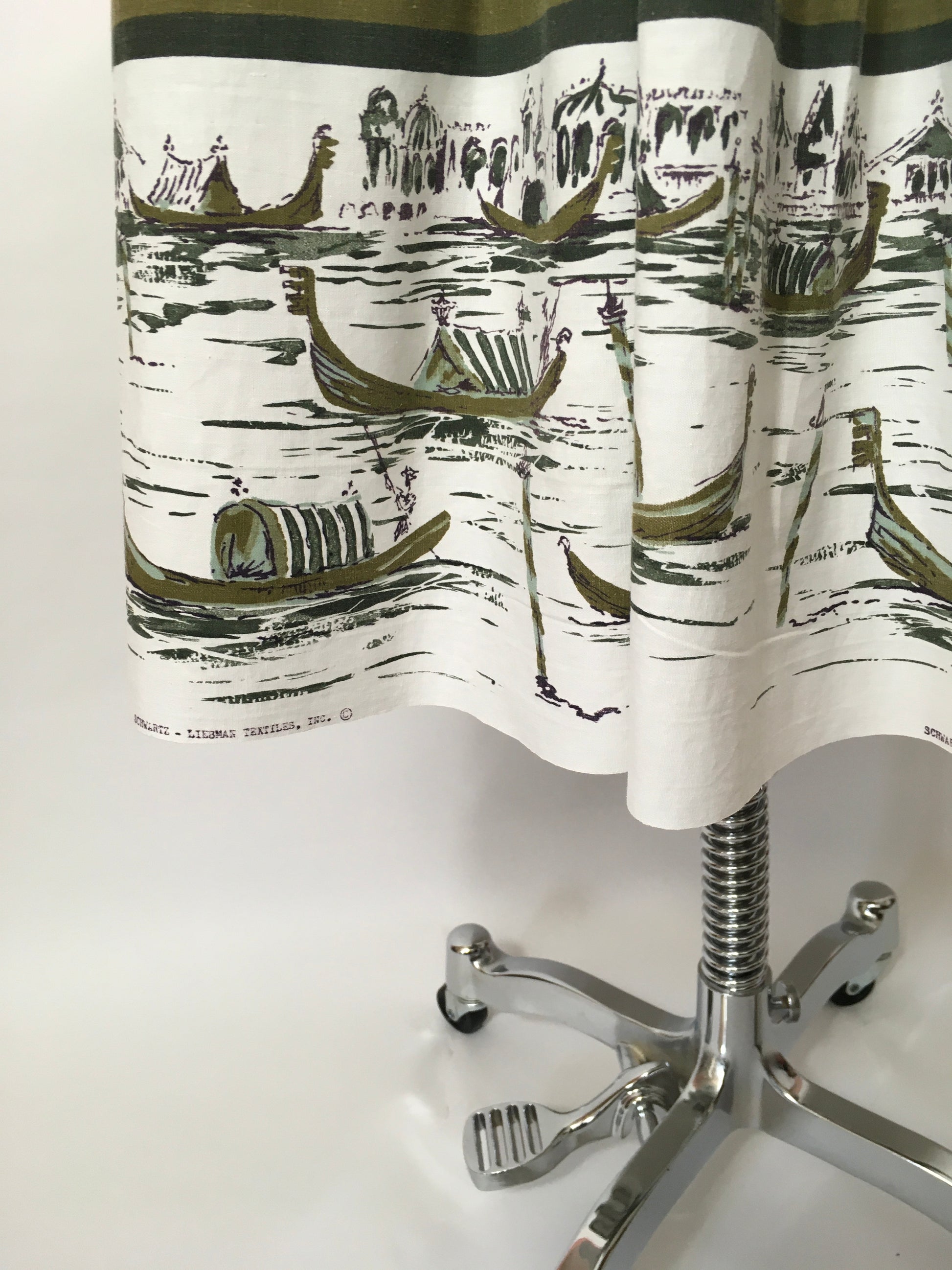 Vintage 1950’s amazing scenic print novelty skirt. Featuring a classic pleated full skirt, cinched in waistband with metal zip and button fastening. The fabric is a lovely cotton featuring buildings, horse and carts, victorian characters and gondolas on the river in a lovely colour palette of muddy browns and greens. To the selvedge printed ‘ Schwartz. Liebman Textiles Inc.’