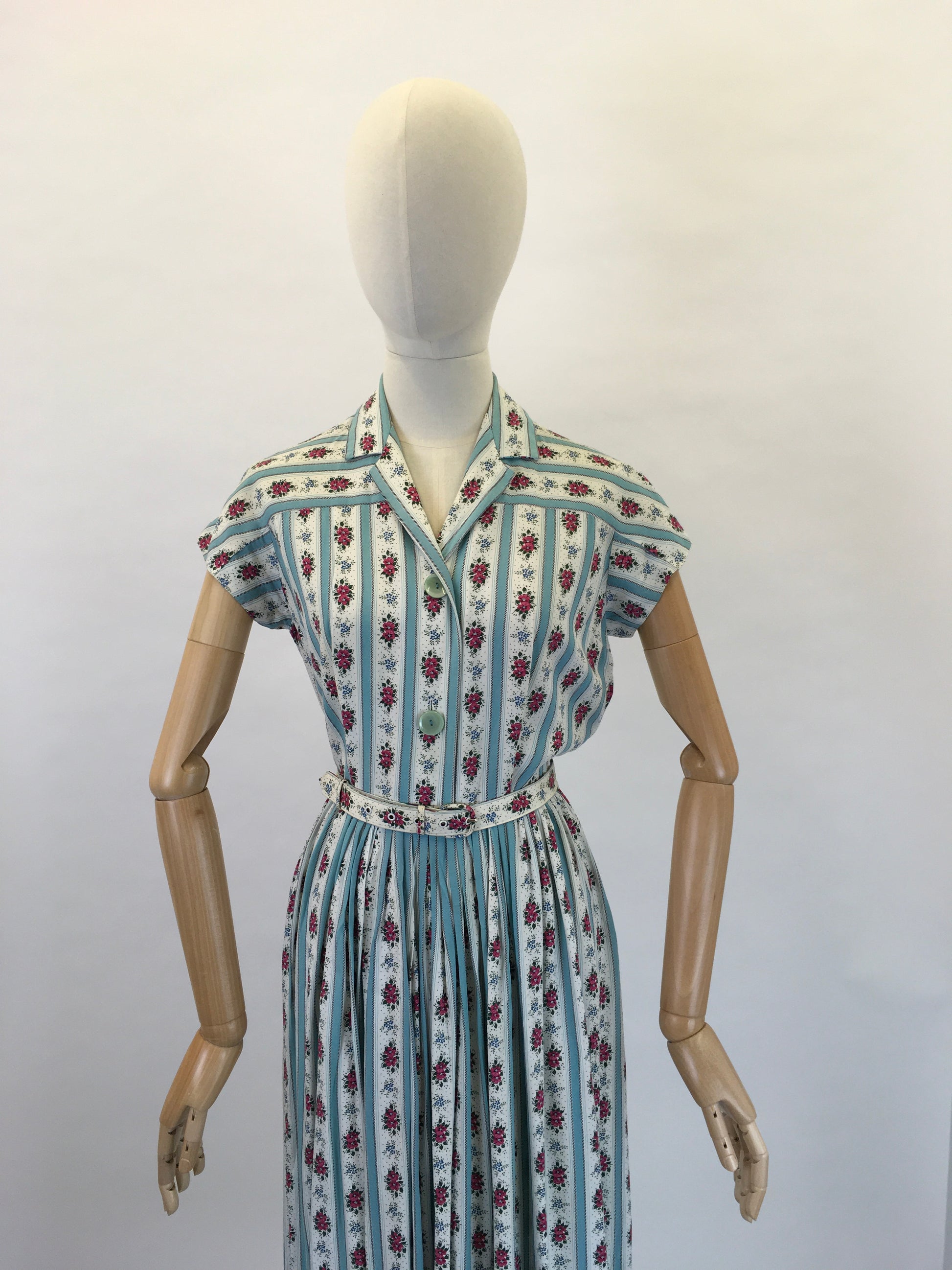 Vintage 1950s Darling St.Michael ‘ Marspun’ Cotton Day Dress in a beautiful floral print In blues, pinks and whites. Featuring a button front to the waist, collar detailing, original belt and pleated skirt. This dress is a classic easy to wear 50’s number, great for all year round wear with layering and various accessories.