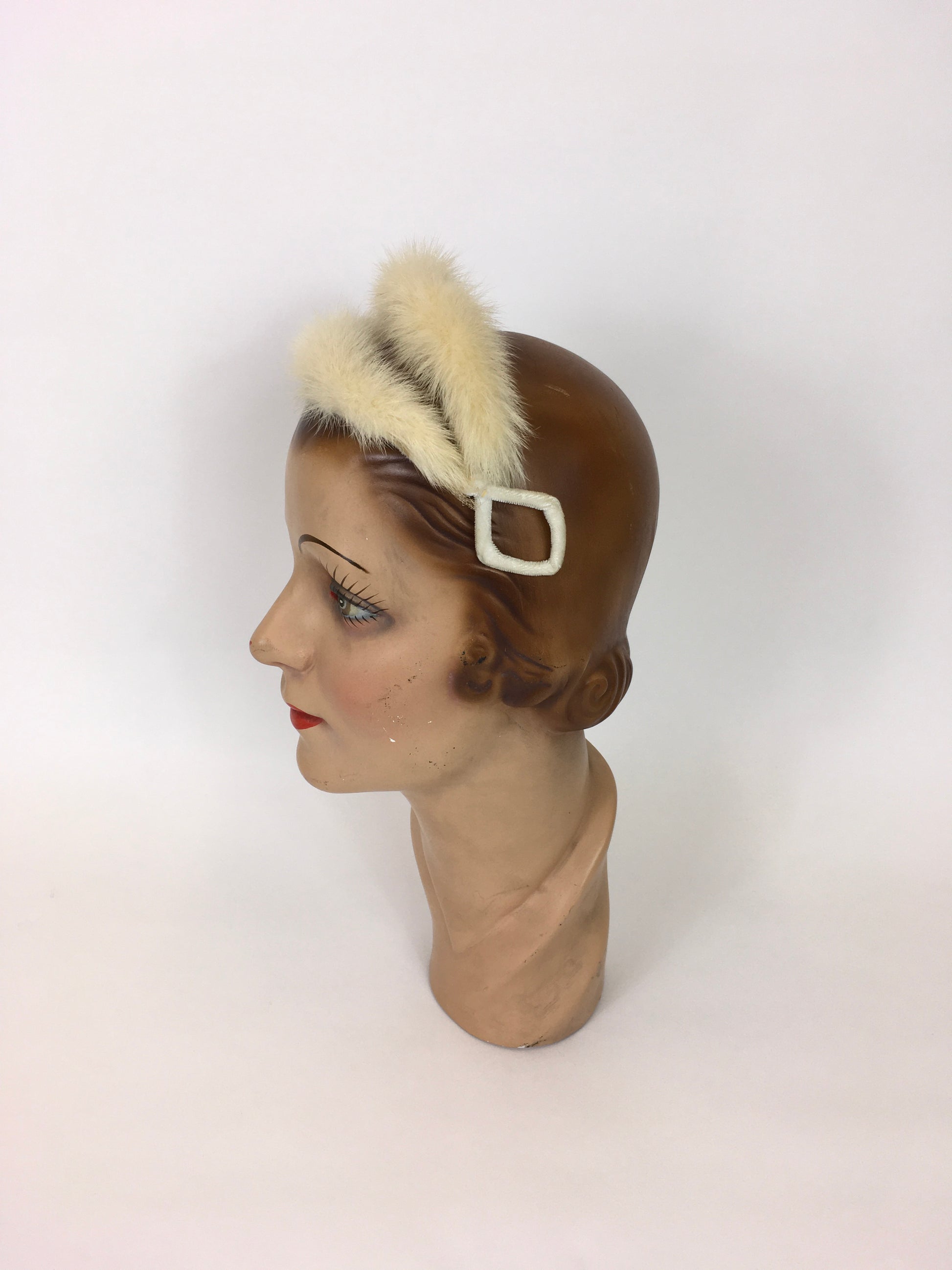 Vintage 1950’s Stunning blonde mink headpiece. Made in a structured wire frame covered in cream velvet and adorned with the mink trim. Such a lovely piece for an occasion with 50’s wear. It would look fabulous at a winter wedding. One size.