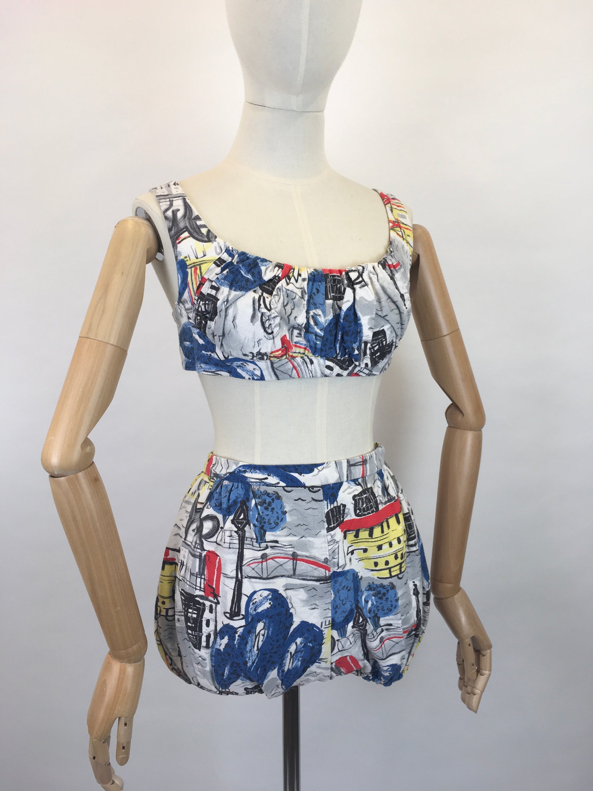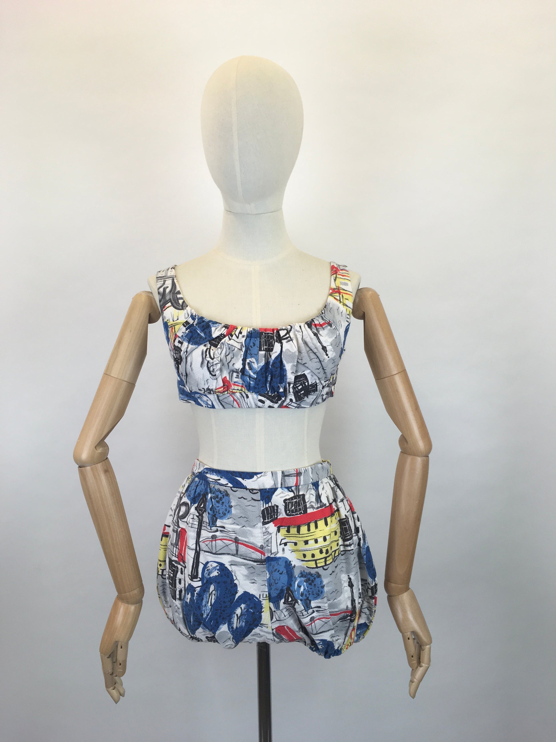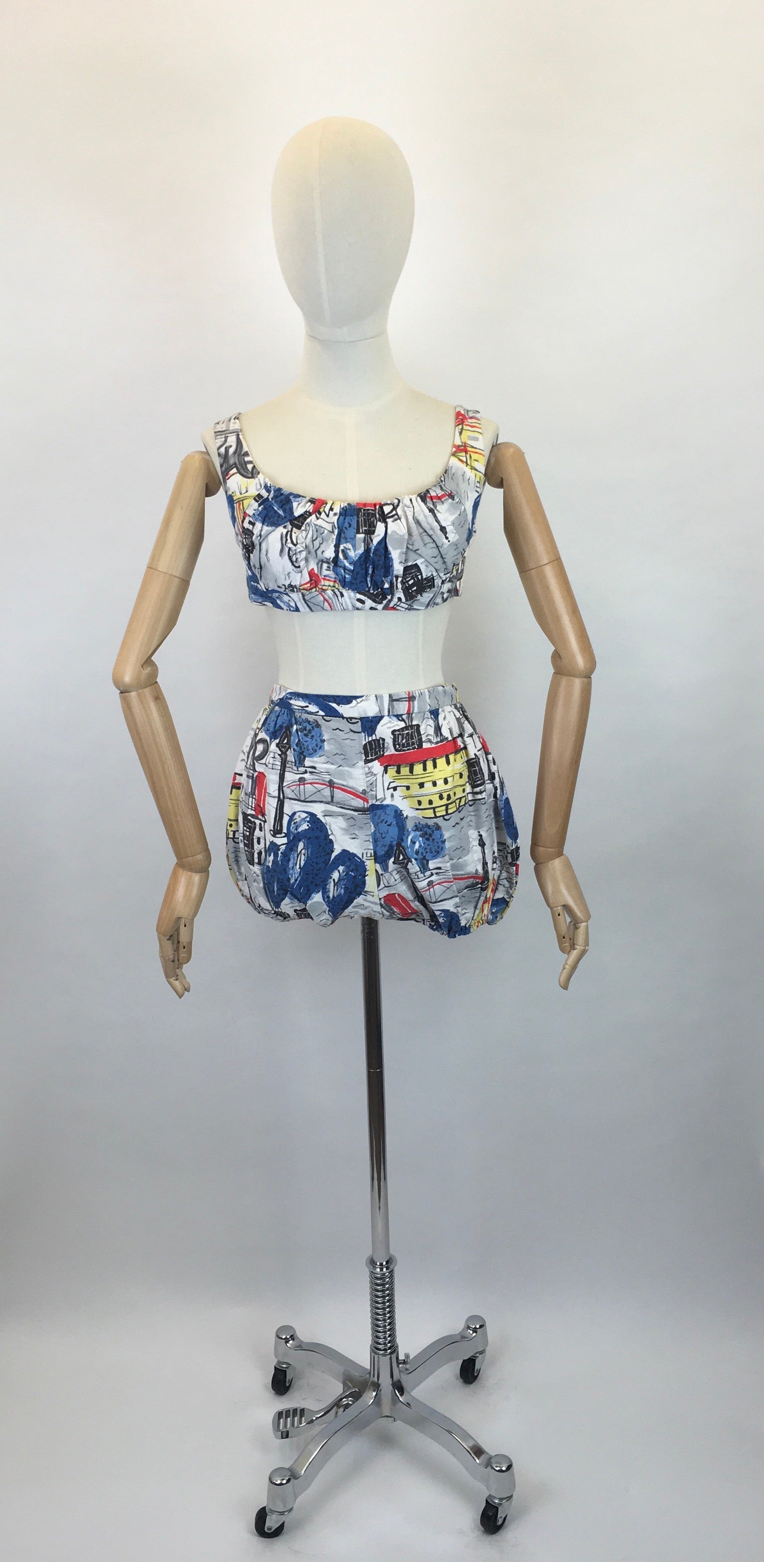 Utterly fabulous vintage 1950s 4 pc sun suit consisting of Sun Top, blouse, bloomer shorts and overlay skirt. Made from a fabulous novelty print barkcloth fabric with pops of bright red, yellow and blues with hues of soft greys and charcoal. Great to be able to be worn all together or wearing separates with other items to create different outfits. Such a fabulous set and even better it’s complete. The sun top features a simple band construction with ruched bust detailing and button back band. The romper shorts features elasticated hem and a metal zip to the rear for fastening. The sun blouse features a lovely shaped collar, button front and small pocket feature and the skirt is a fabulous pleated number with button down front.