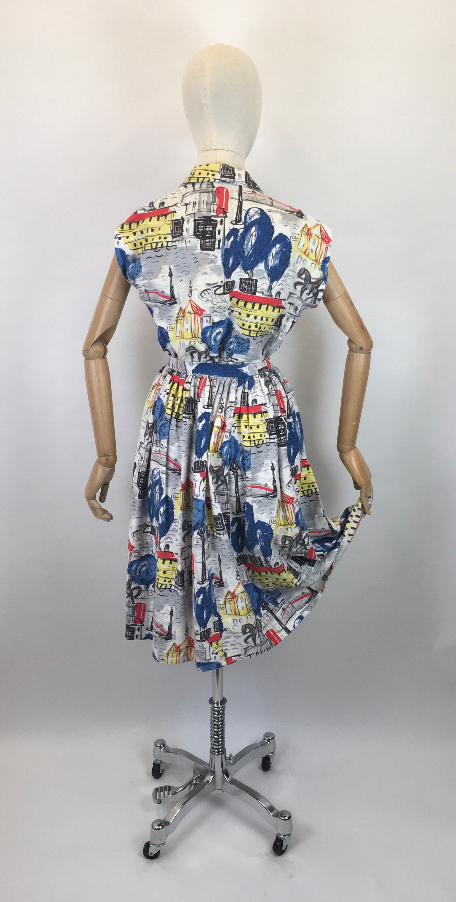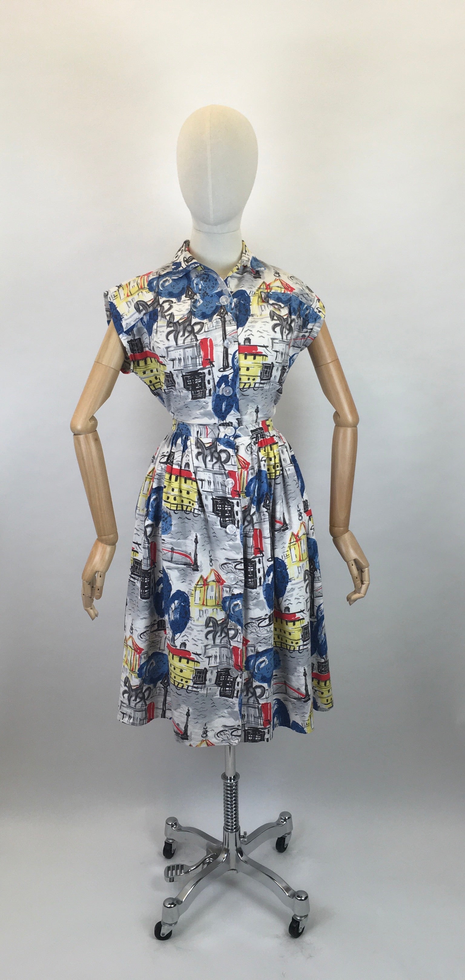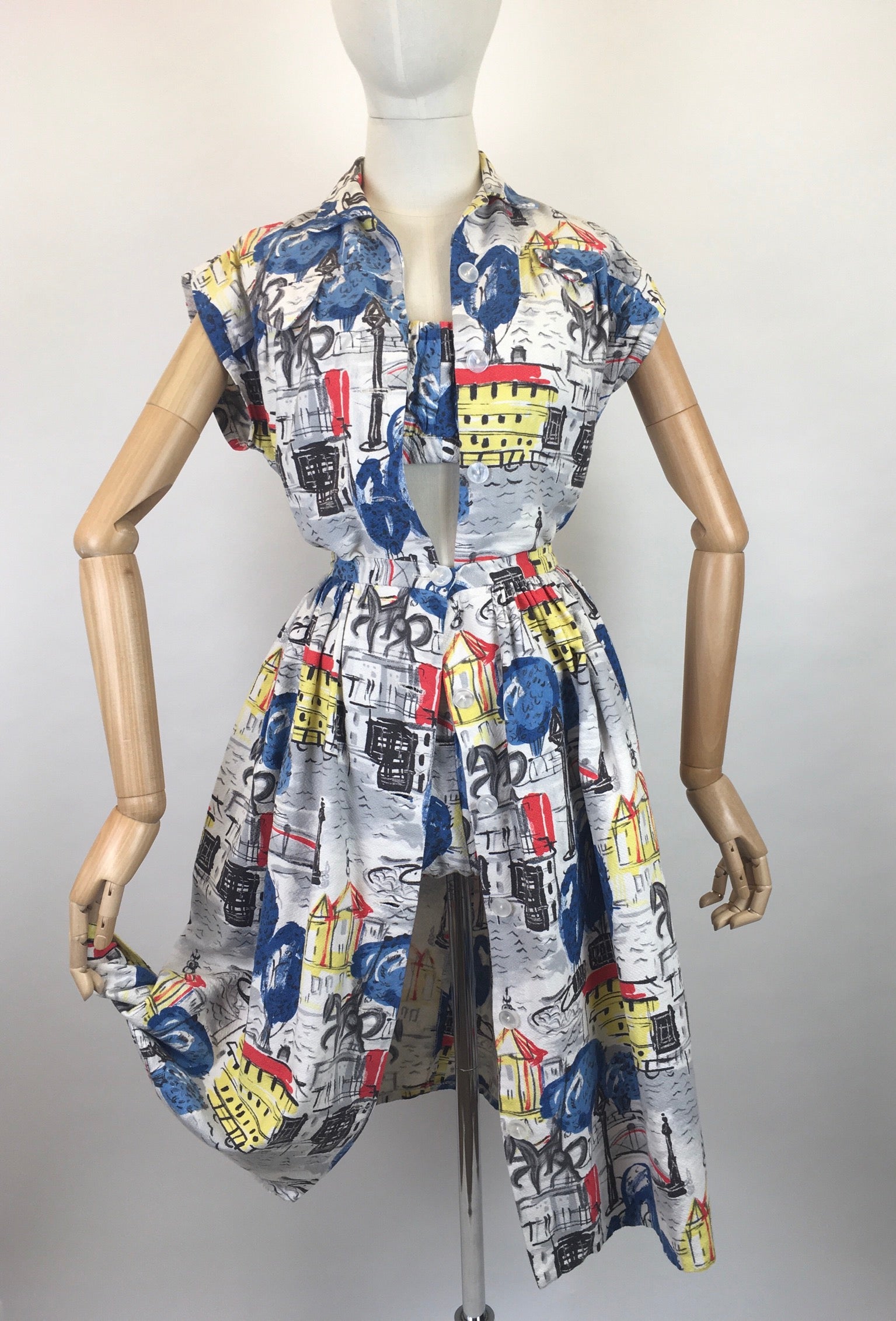 Utterly fabulous vintage 1950s 4 pc sun suit consisting of Sun Top, blouse, bloomer shorts and overlay skirt. Made from a fabulous novelty print barkcloth fabric with pops of bright red, yellow and blues with hues of soft greys and charcoal. Great to be able to be worn all together or wearing separates with other items to create different outfits. Such a fabulous set and even better it’s complete. The sun top features a simple band construction with ruched bust detailing and button back band. The romper shorts features elasticated hem and a metal zip to the rear for fastening. The sun blouse features a lovely shaped collar, button front and small pocket feature and the skirt is a fabulous pleated number with button down front.