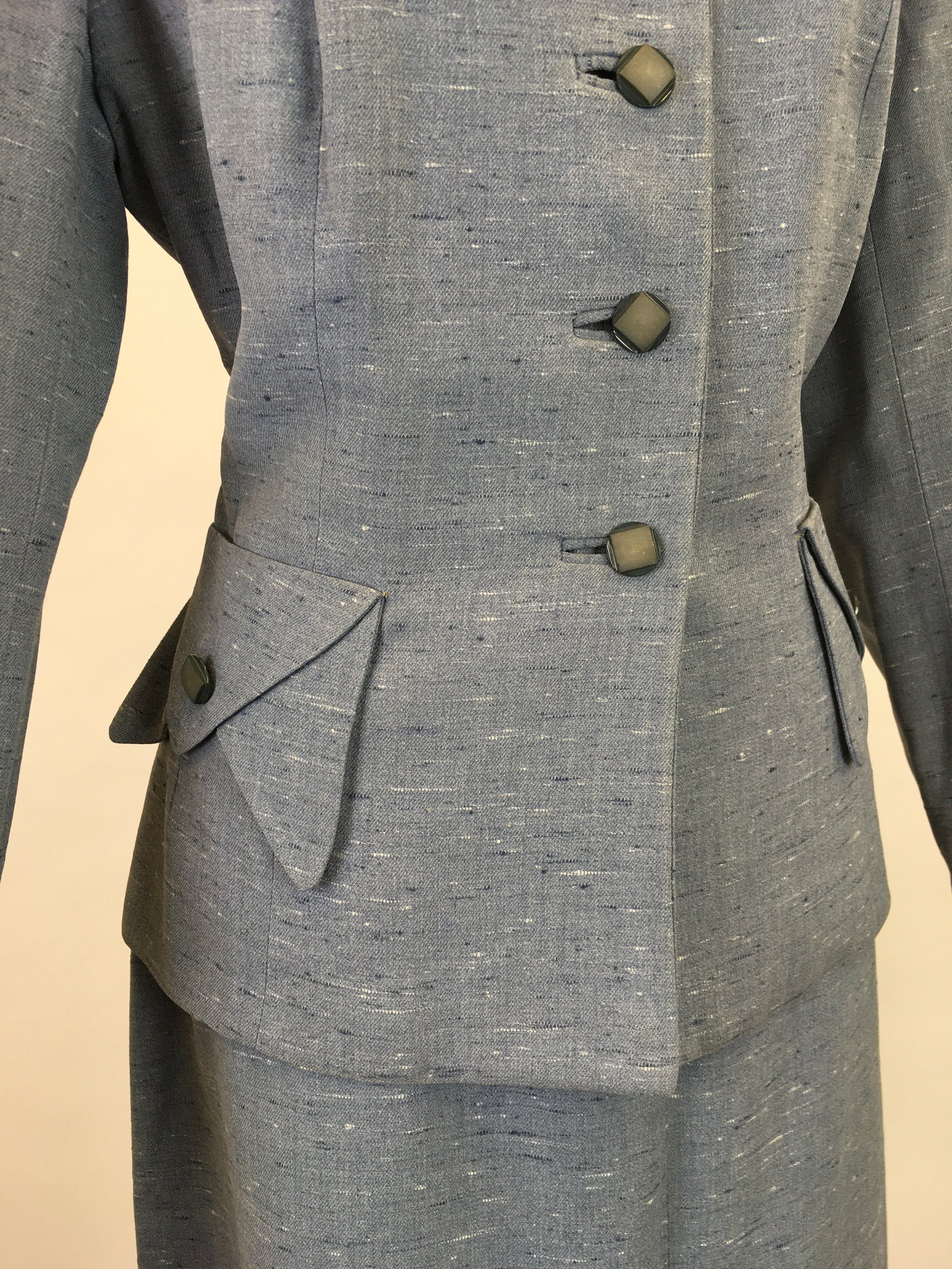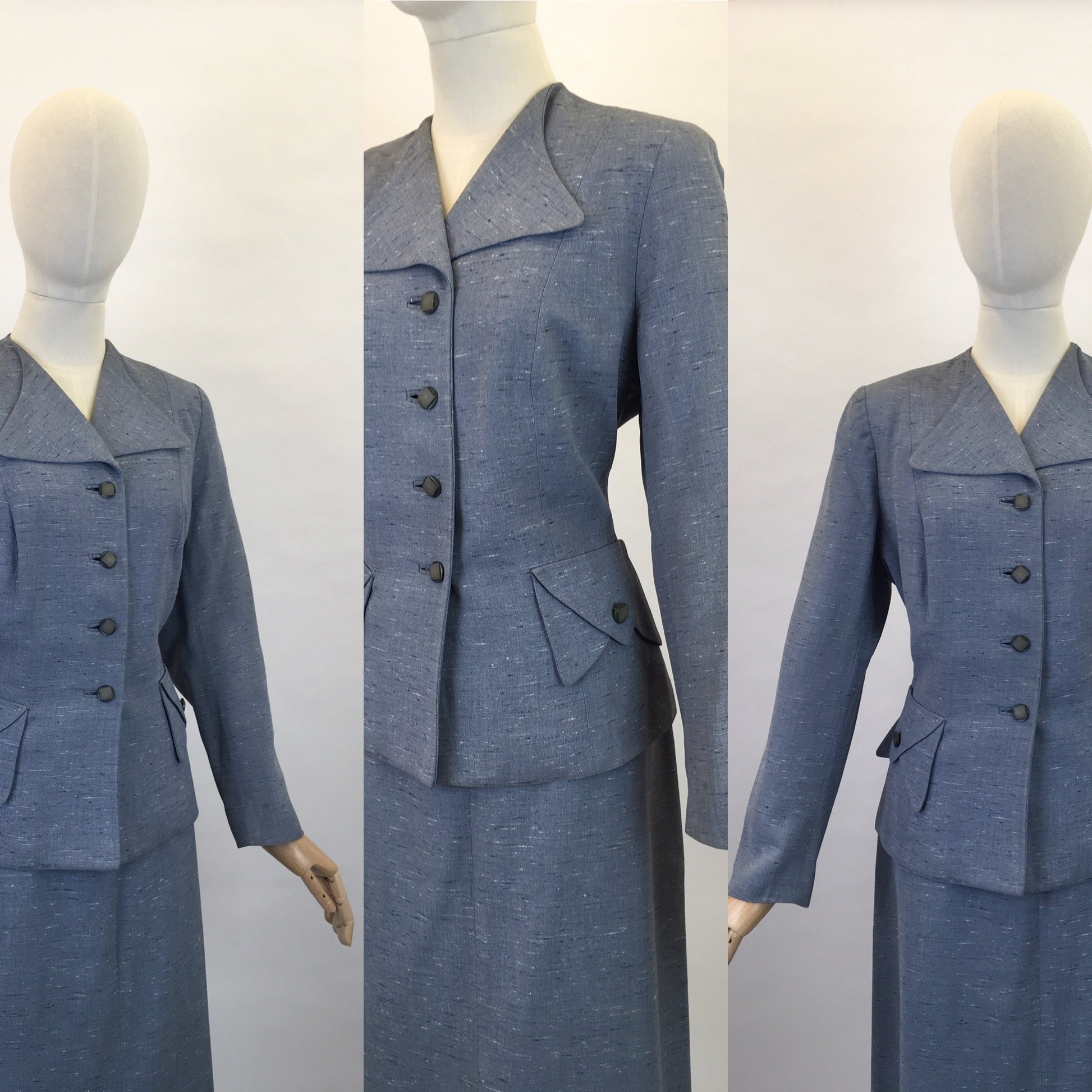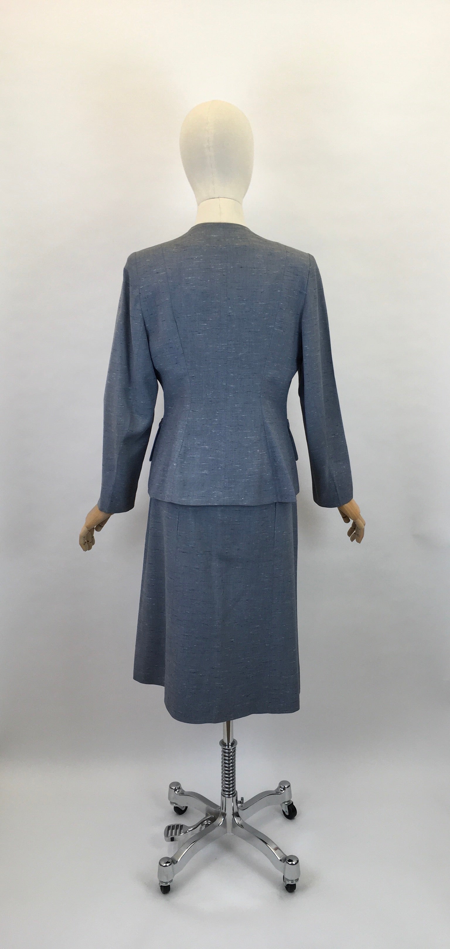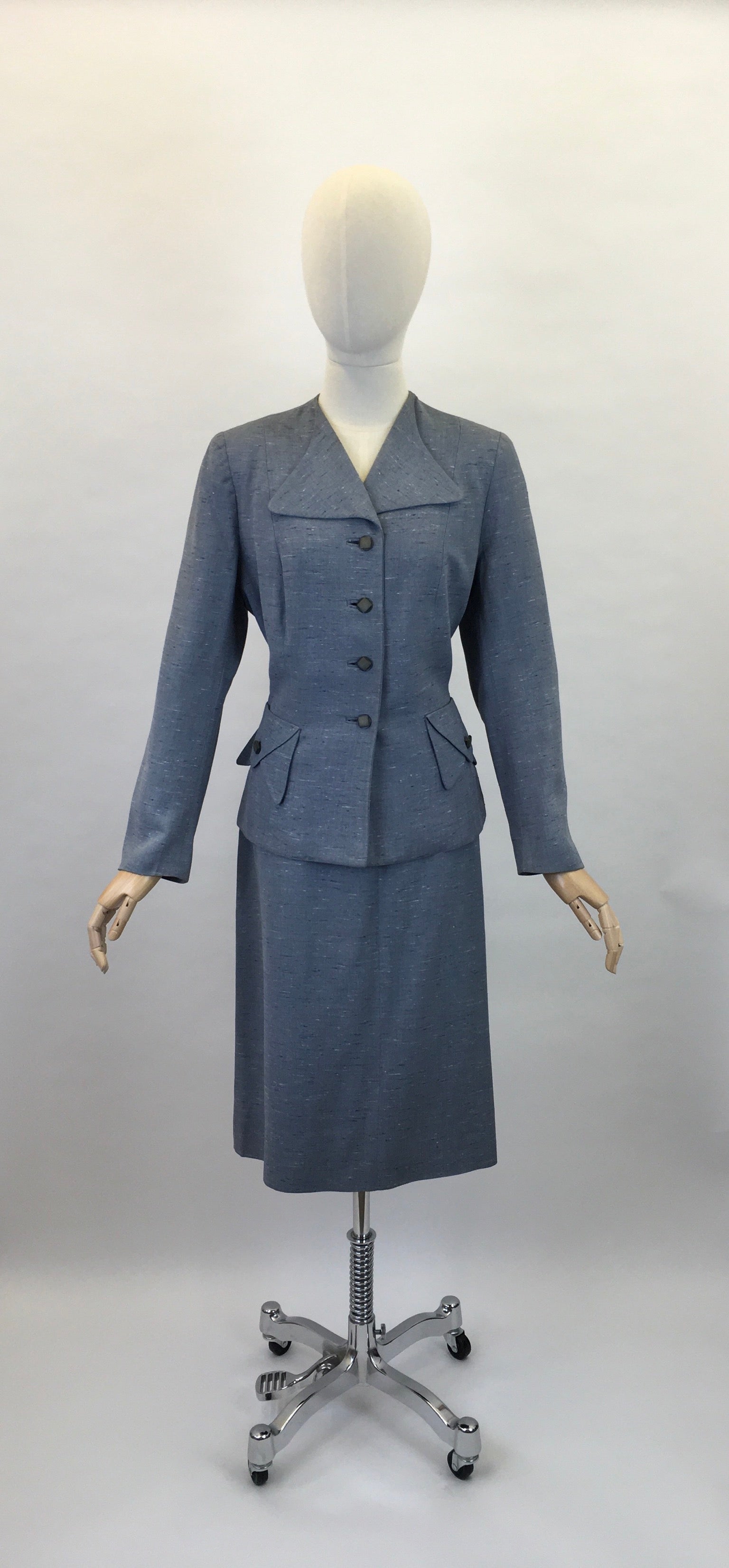 Vintage 1950s fabulous atomic fleck suit in a lovely powdered blue. Featuring a classic 50s silhouette this suit has a lovely shoulder line, collar, button detailing to the front and pockets with an a line skirt.