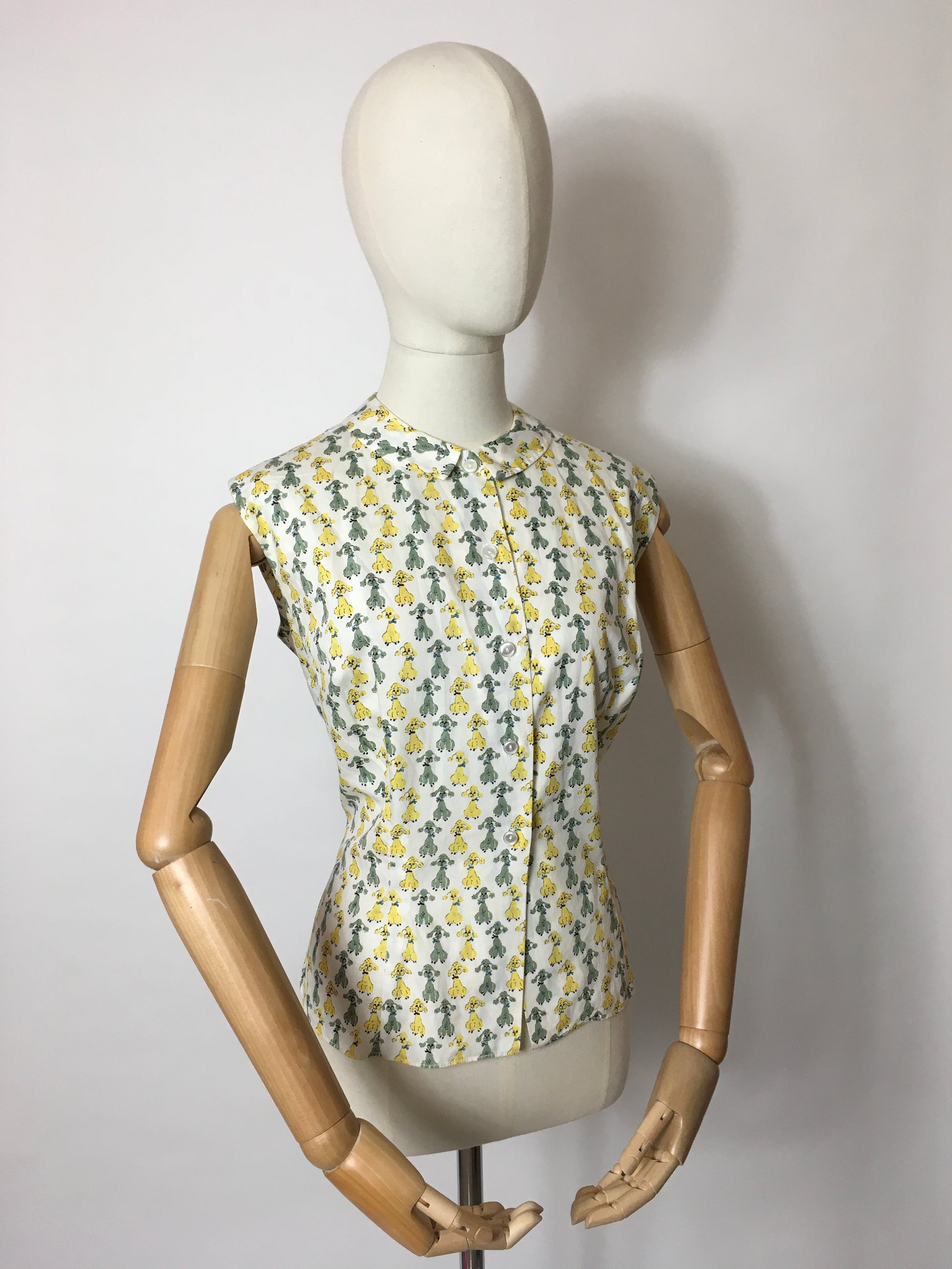 Original 1950s Cotton Day Blouse - In the Most Amazing Poodle Print and Yellow & Green Colour Combination