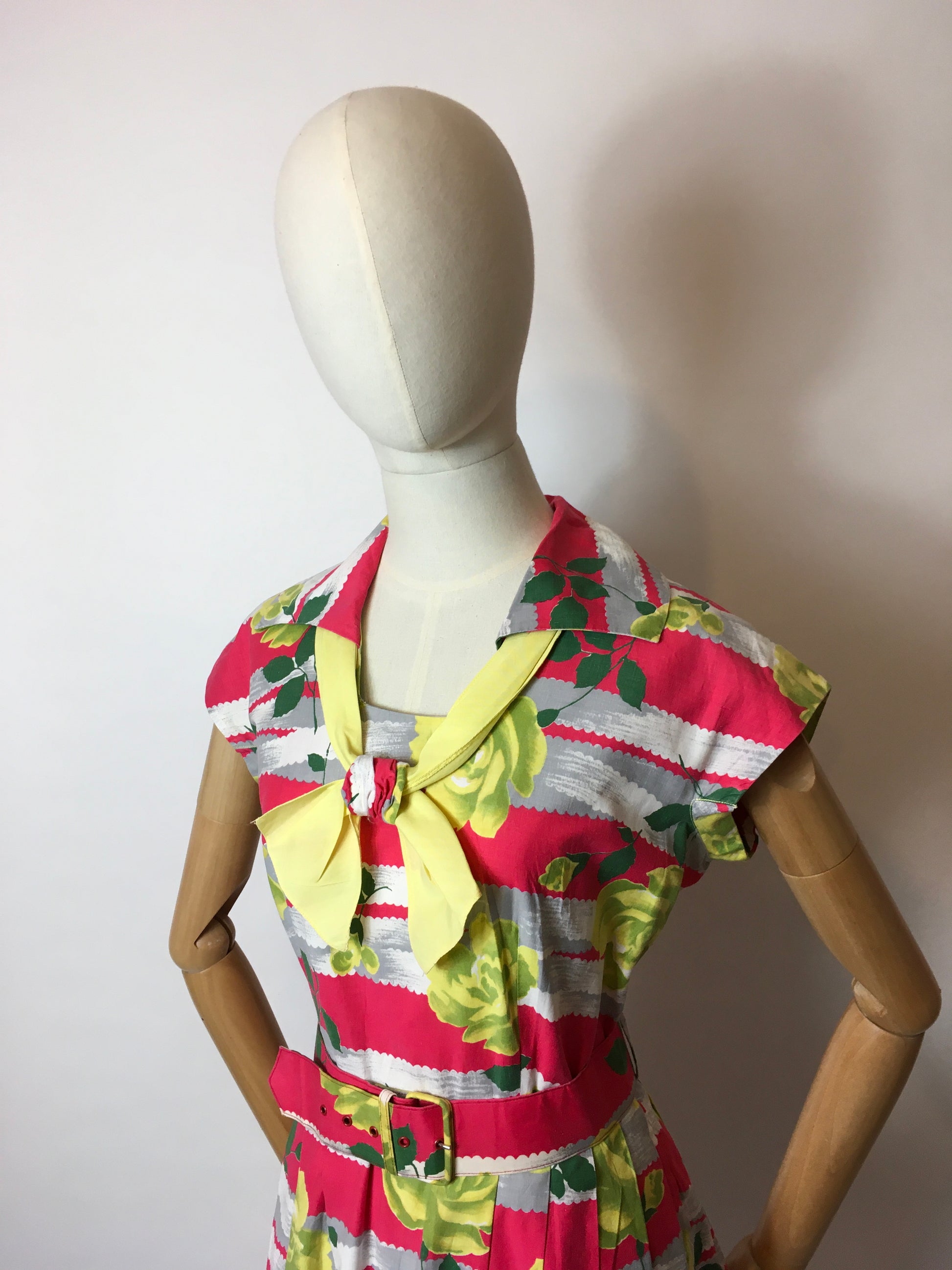 Original 1950s Cotton Day Dress - In a Fabulous Floral Cotton in Bright Pinks, Yellows & Greens