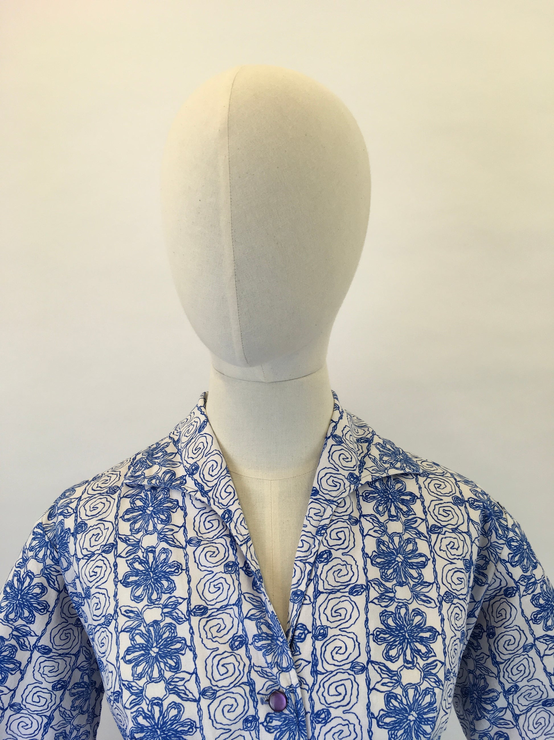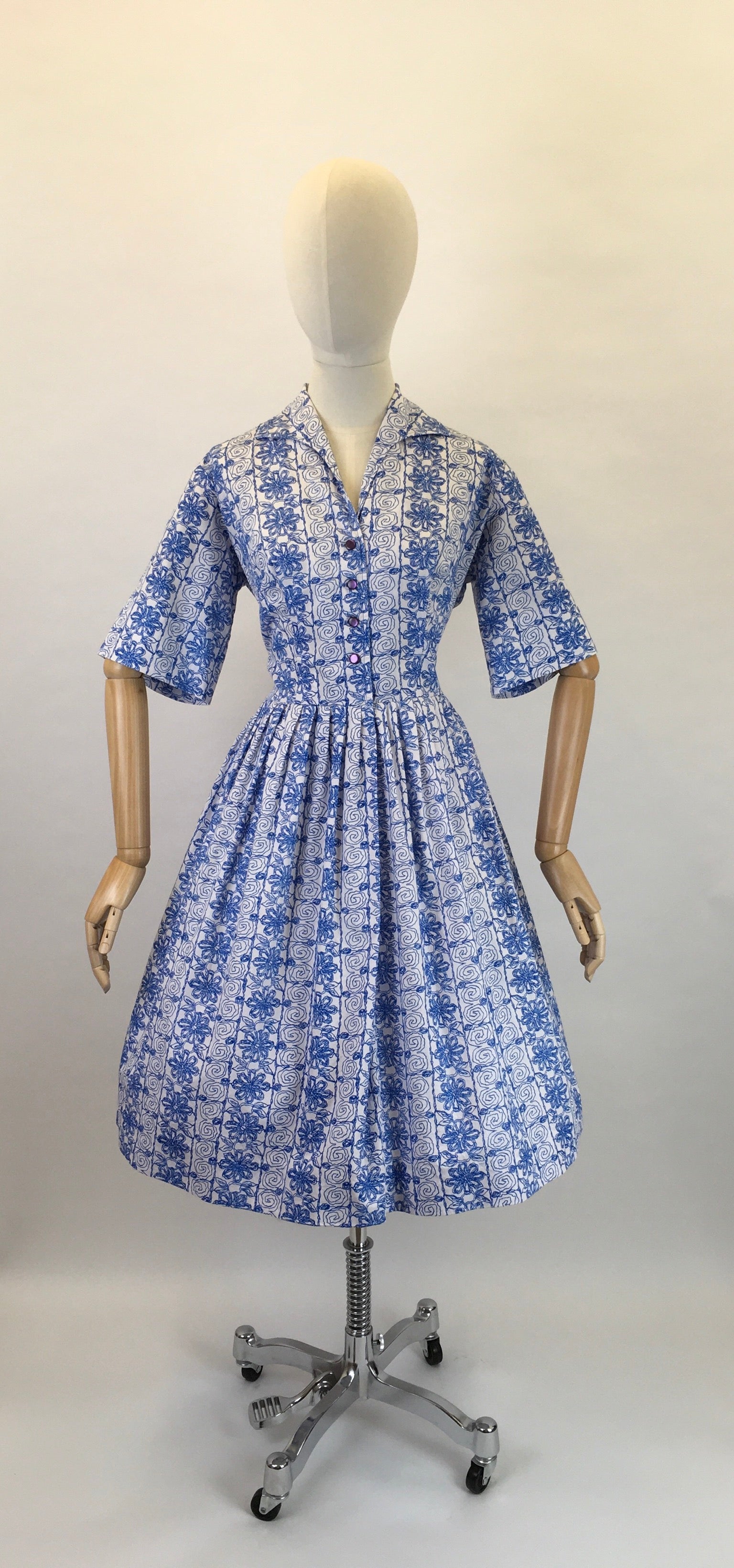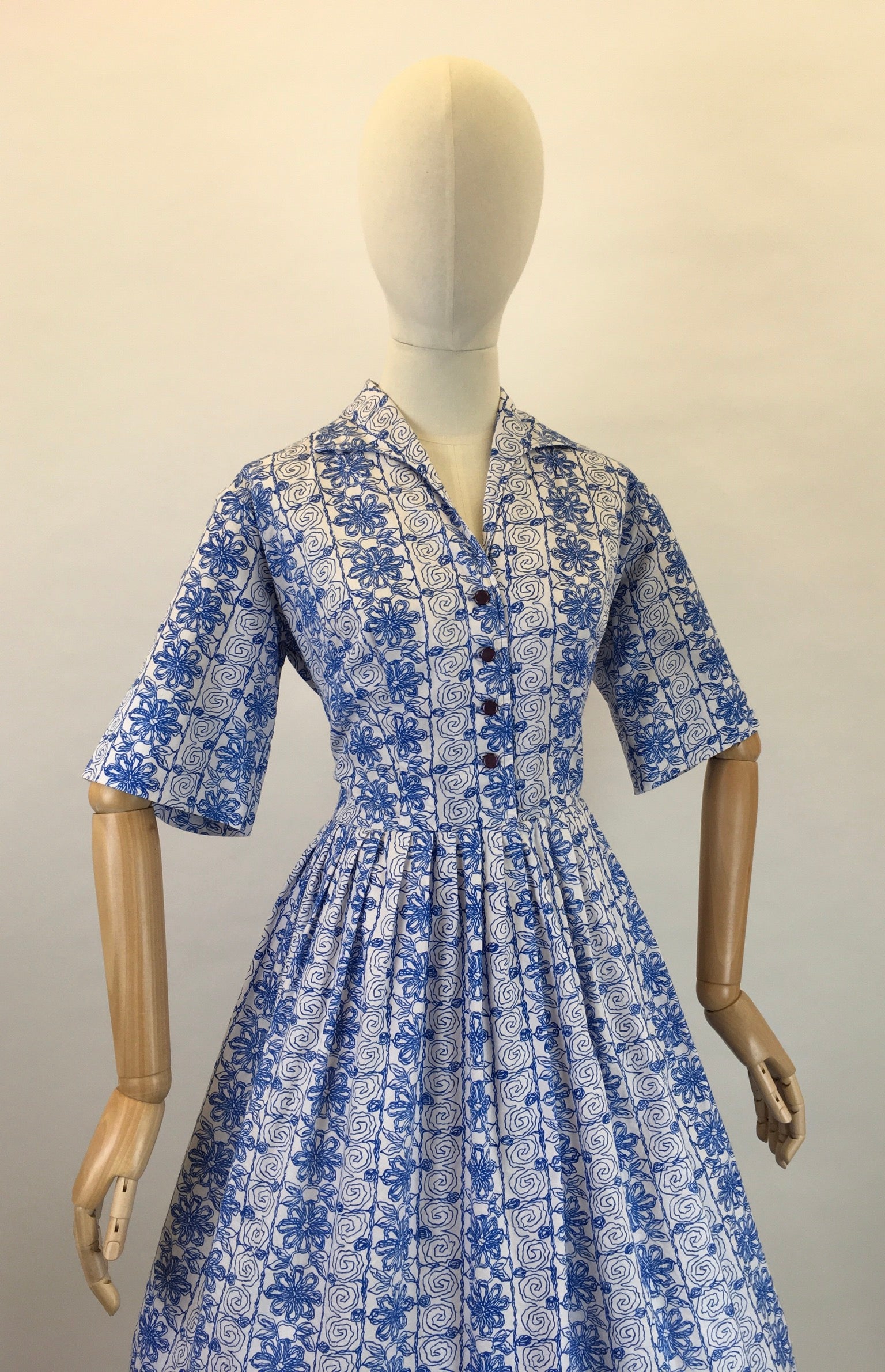 Vintage 1950s cotton day dress in a lovely cobalt blue and white colour pallet in almost abstract scribble design cotton fabric. Featuring a classic 50s silhouette this dress has a lovely collar detailing, button front, short sleeve and full circle skirt. Great for wearing throughout different seasons with layering and varying accessories.