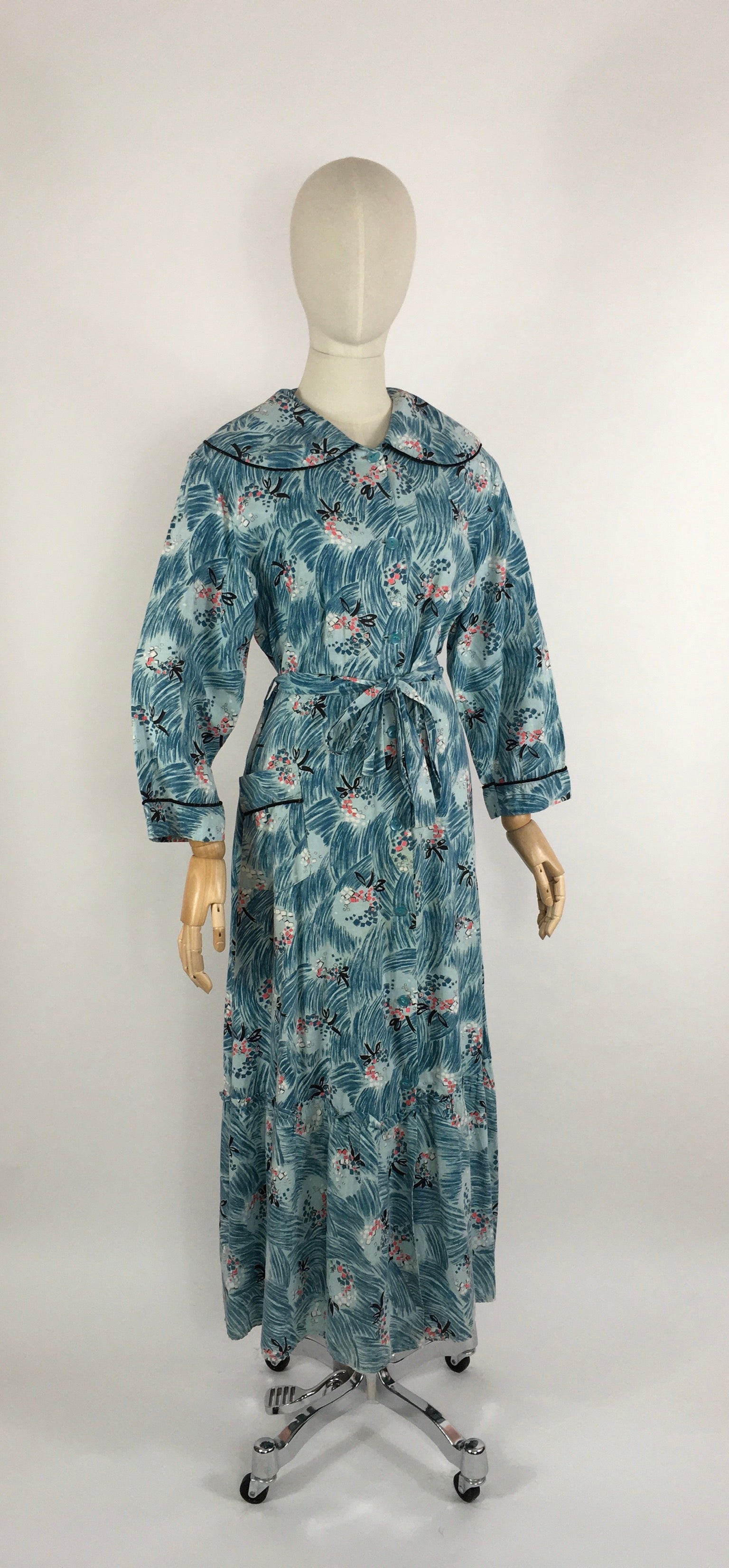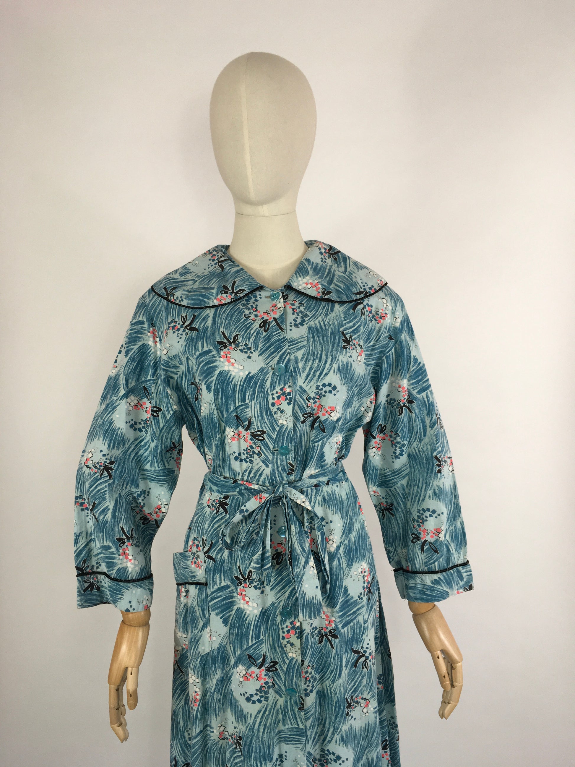 Vintage 1950s housecoat by ‘ Pelaw’ In a classic silhouette this housecoat features a button down front, oversized Peter Pan collar, long sleeves and tiered bottom. Made from a beautiful cotton fabric with a fabulous design In Blue, Black, pink and yellow.